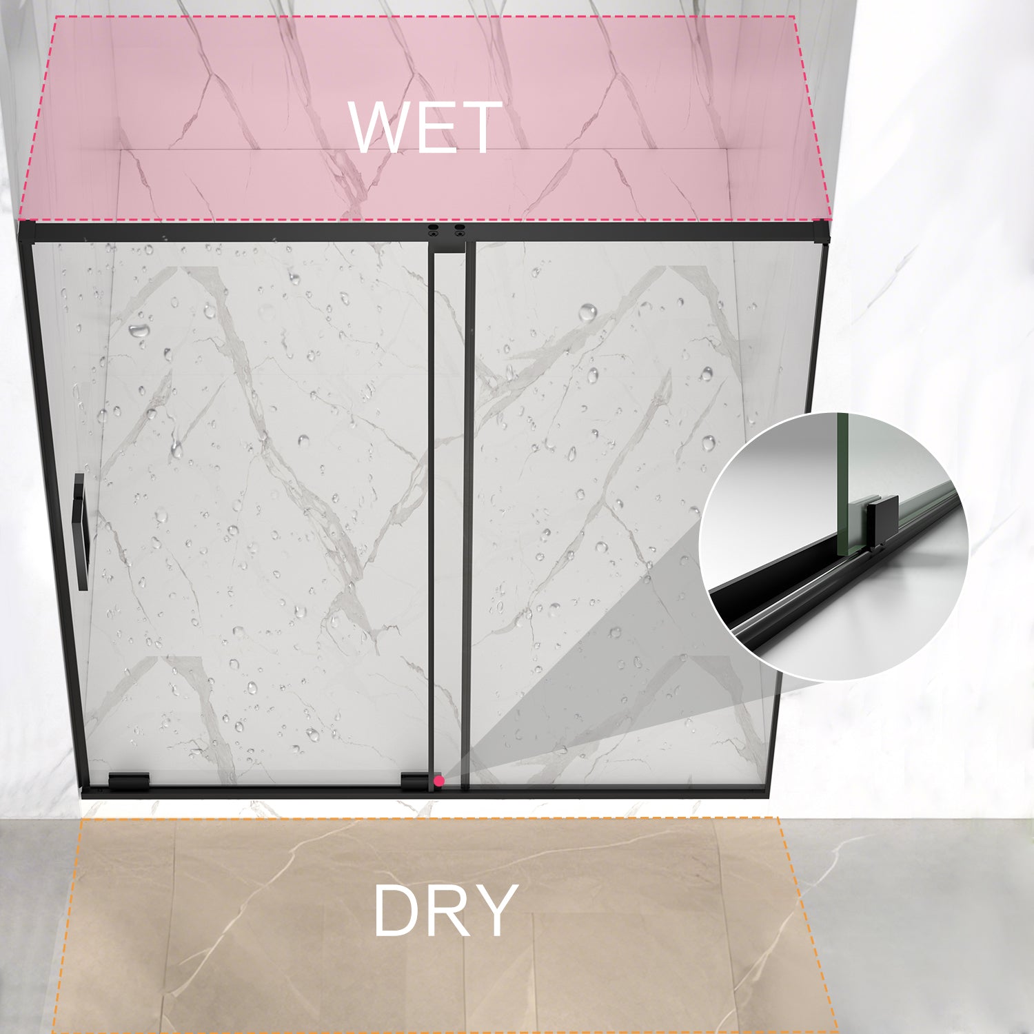 This 56"-60"W x 72"H semi-frameless sliding shower door combines modern style, safety, and functionality. Made from 5/16" (8mm) SGCC-certified tempered safety glass, it offers excellent durability, safety, and easy maintenance. The matte black corrosion-resistant frame and handle provide long-lasting performance, even in humid bathrooms. A bottom rail enhances load-bearing capacity and ensures smooth, effortless sliding that can be installed by one person. The 4" cut-adjustable width allows perfect fitting to your shower space, while the built-in drilling template ensures quick and precise installation. Its waterproof design keeps all water inside the enclosure, maintaining a dry and tidy bathroom.