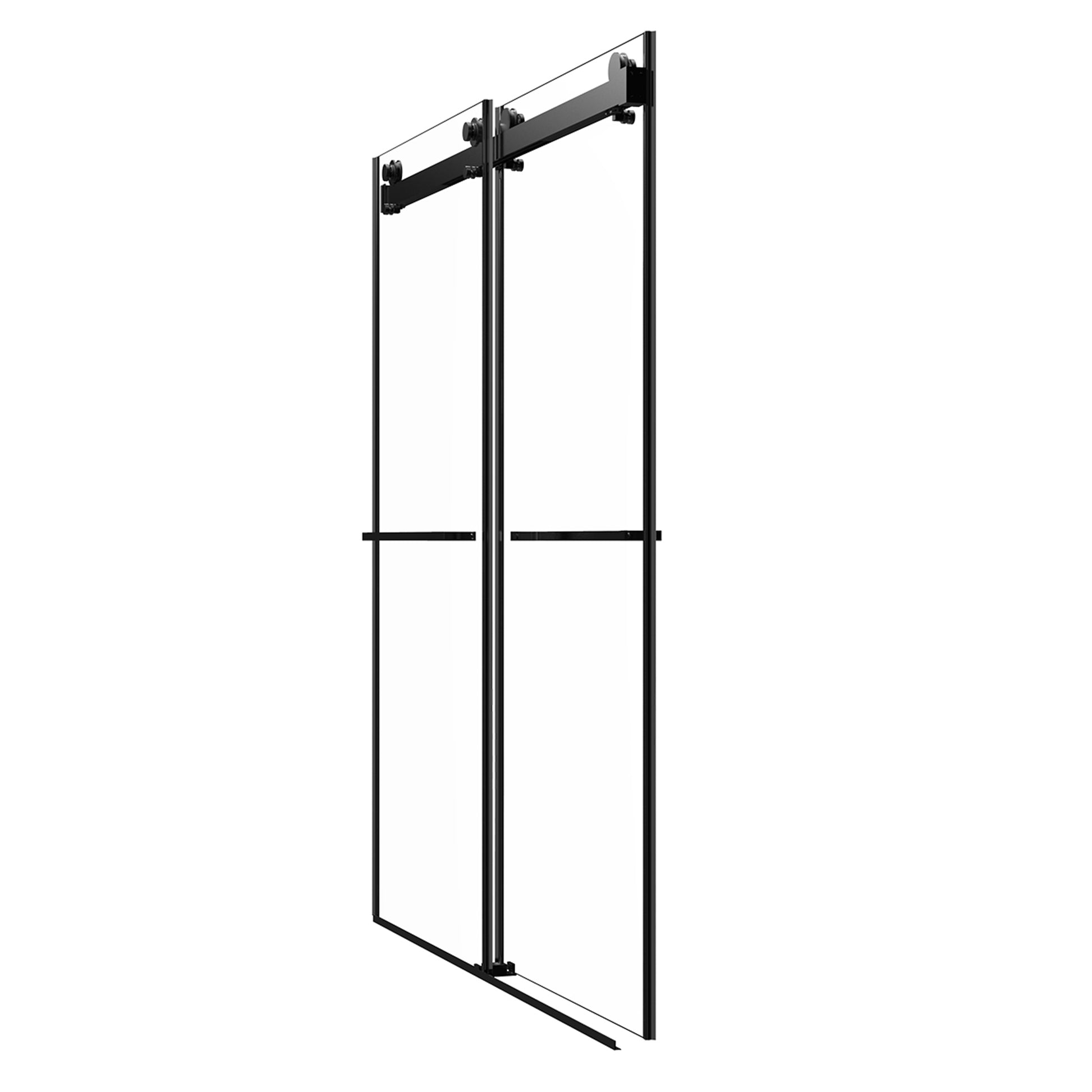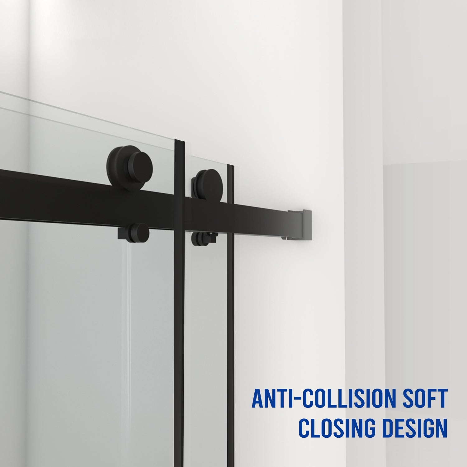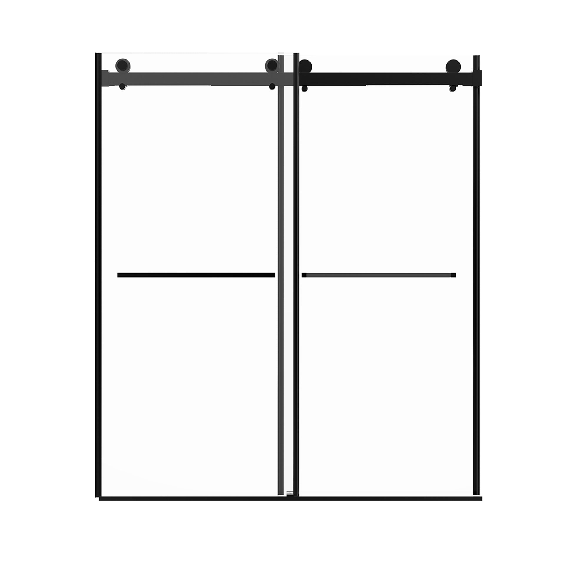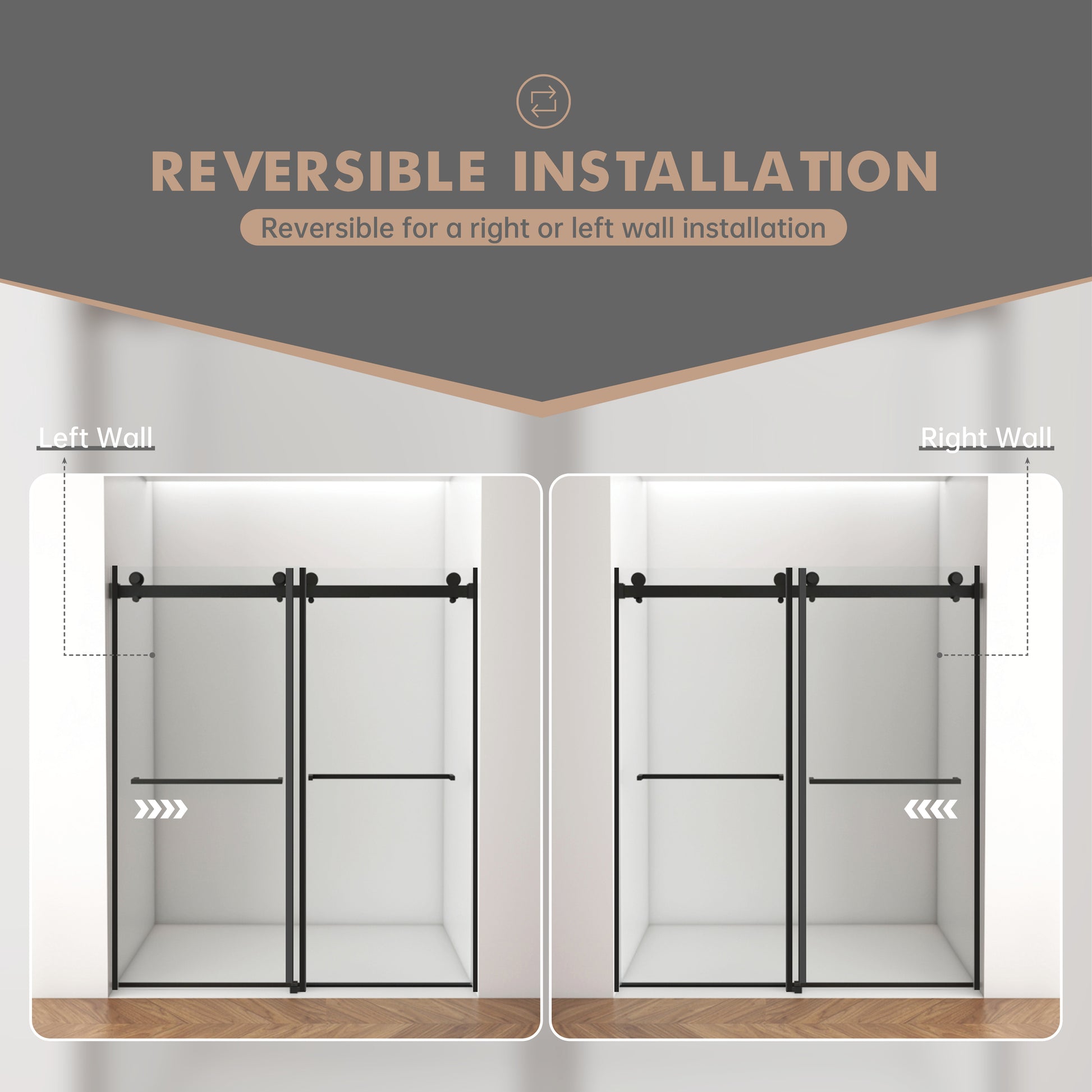 This frameless double sliding shower door fits openings from 56" to 60" wide and stands 76" high, providing a spacious, modern upgrade for your bathroom. Crafted from 3/8" (10mm) SGCC & ANSI-certified tempered safety glass, it delivers exceptional strength, shatter resistance, and long-term durability. The double-sided easy-clean coating repels water stains for a clear, low-maintenance surface, while the matte black stainless steel frame and handle resist corrosion and rust. The square rail and stainless steel rollers ensure smooth, quiet sliding, and the integrated buffer system prevents hard collisions for safe, comfortable use. Its waterproof threshold keeps the bathroom floor dry, and the reversible design allows both left- and right-side installation.