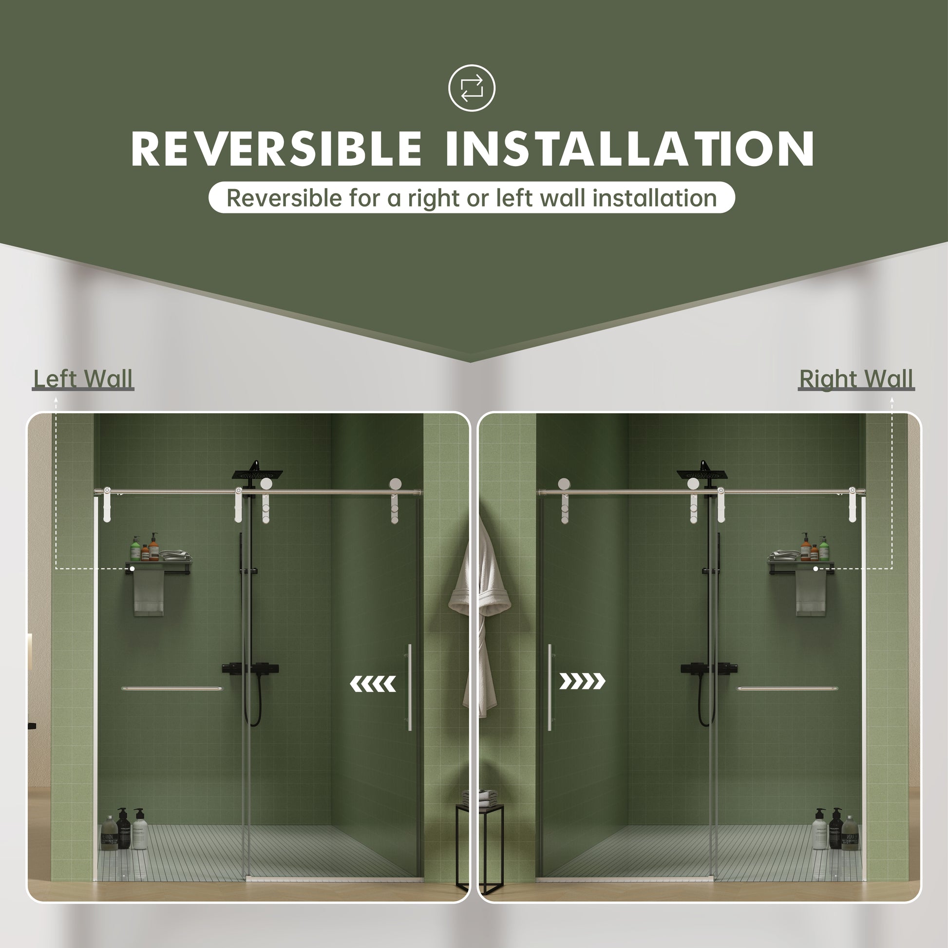 This frameless single sliding shower door fits openings from 56" to 60" wide and stands 76" tall, delivering a spacious and elegant upgrade for your bathroom. Crafted from 5/16" (8mm) SGCC & ANSI-certified tempered safety glass, it offers exceptional durability and safety. The brushed nickel stainless steel hardware is corrosion- and rust-resistant, while the double-sided easy-clean coating keeps the glass crystal clear with minimal maintenance. The integrated towel bar provides convenient access, and the precision buffer system ensures smooth, quiet sliding while preventing hard impacts. Waterproof threshold technology keeps your bathroom floor dry, and the reversible design supports both left- and right-hand installation for maximum flexibility.
