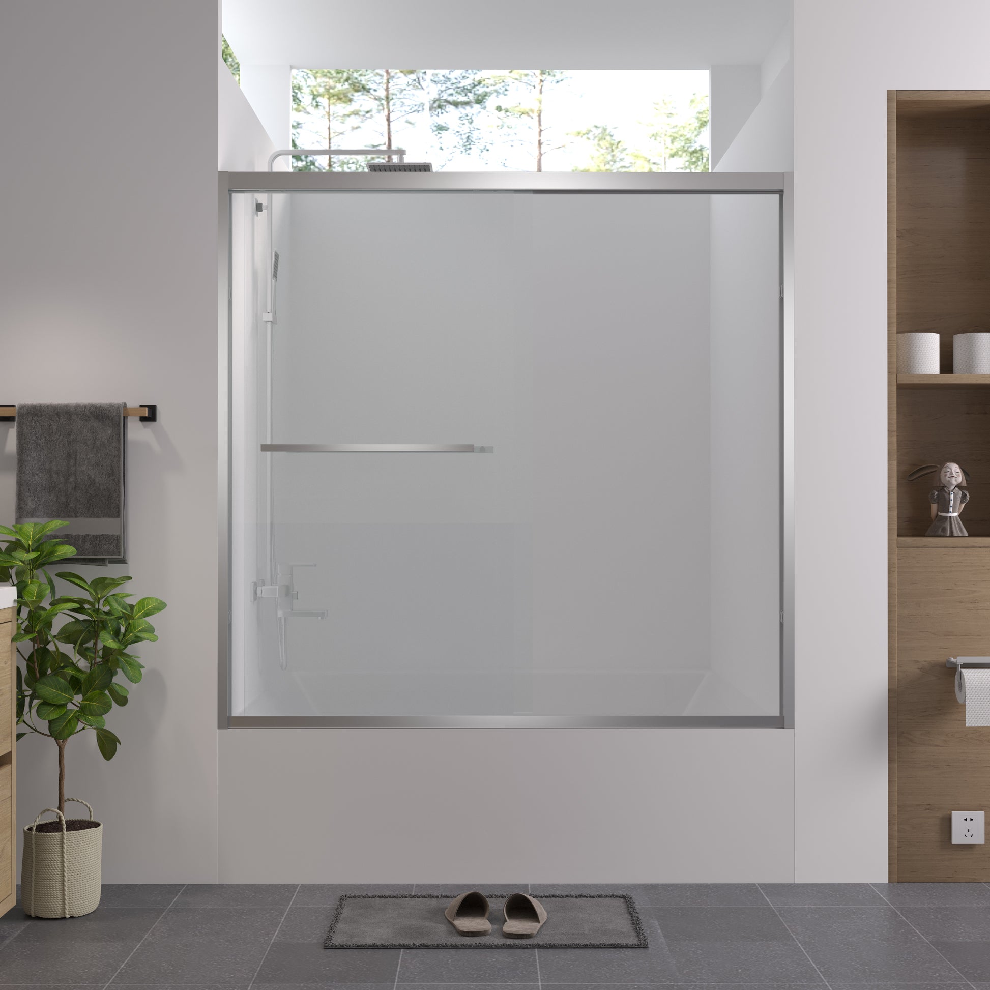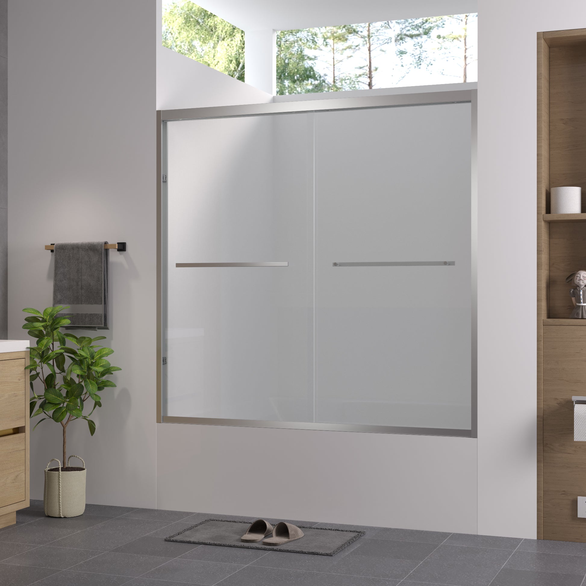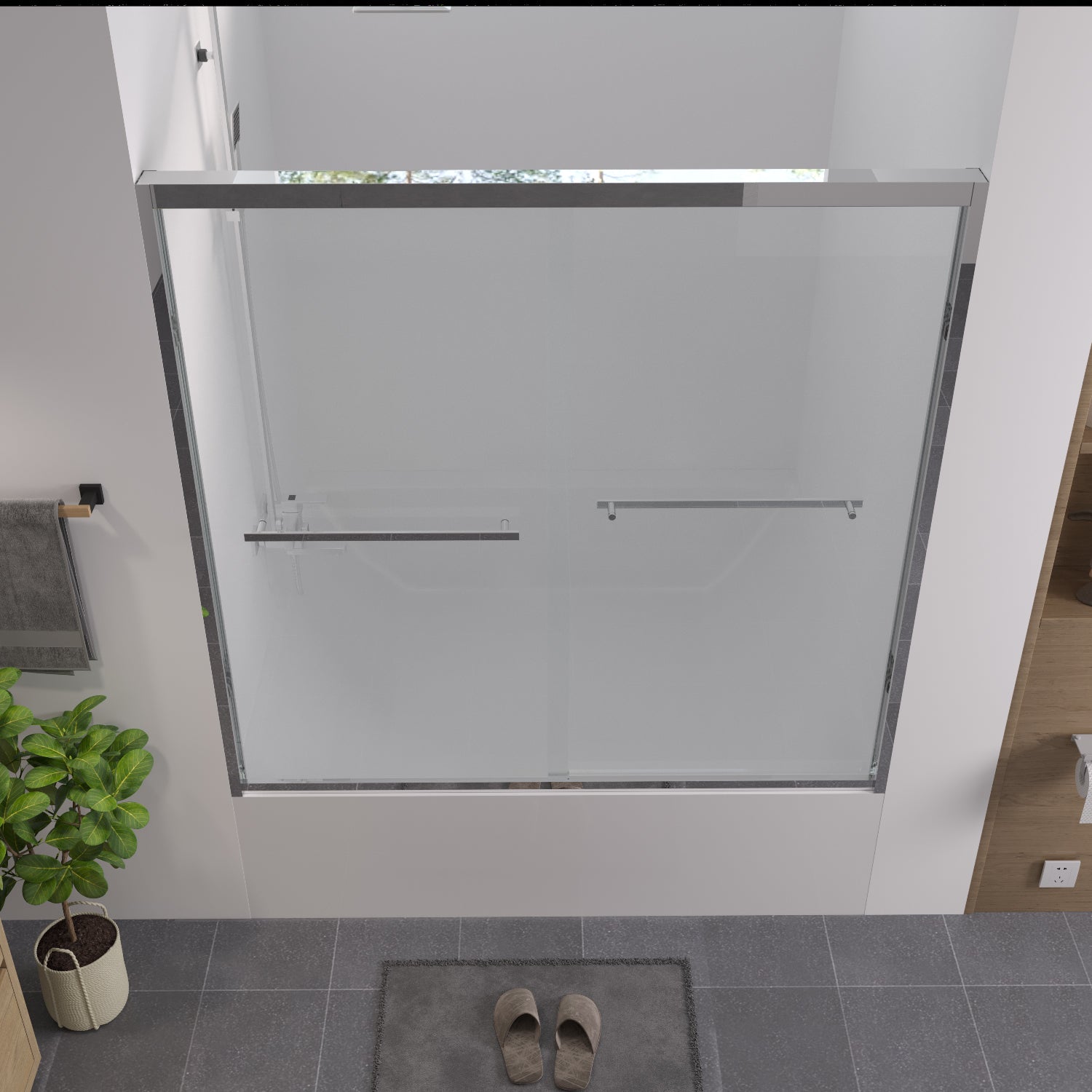 Upgrade your bathroom with this 56-60" W x 58" H aluminum frame double sliding bathtub screen, designed for both style and practicality. Crafted from 1/4" (6mm) SGCC & ANSI certified clear tempered glass with chamfered edges, it ensures safety and durability. The thickened chrome-finished aluminum frame provides stability without shaking, while the stainless steel handle is corrosion- and rust-resistant for long-lasting use. The waterproof design effectively keeps water inside the tub, maintaining a dry and clean bathroom environment. Width is adjustable from 56" to 60" with a cutting guide, and reversible installation allows for left or right opening. Shipped in reinforced honeycomb packaging to ensure safe delivery. (Tub base not included.)