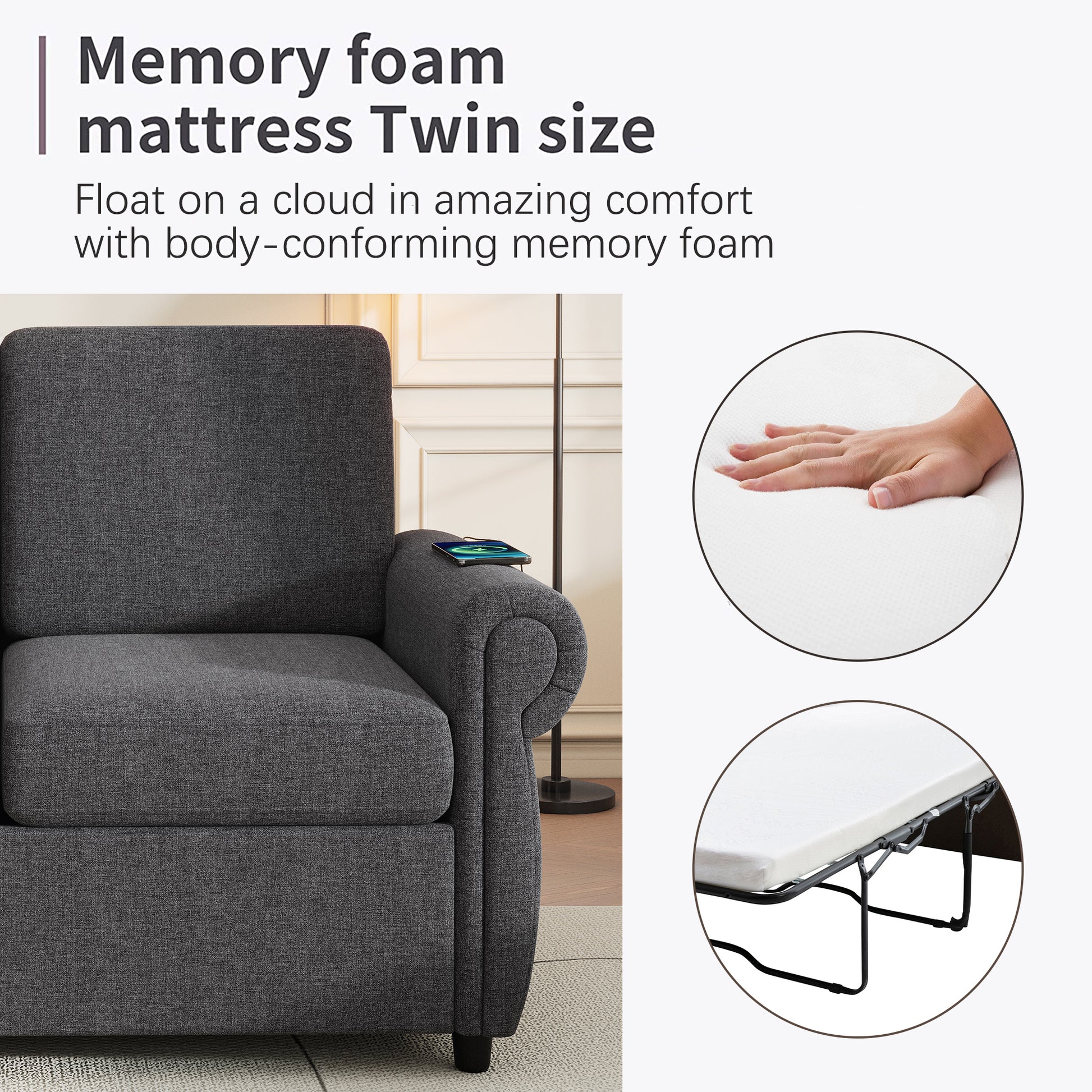 Meet the 57.9" Orisfur Sleeper Sofa, a versatile loveseat for any space. It easily pulls out into a comfortable twin bed with a memory foam mattress. Built with a sturdy steel frame, it also features convenient USB ports for charging devices, combining comfort and modern functionality perfectly.