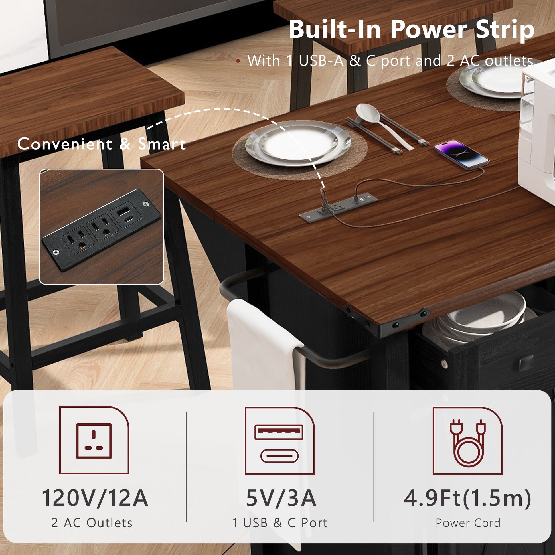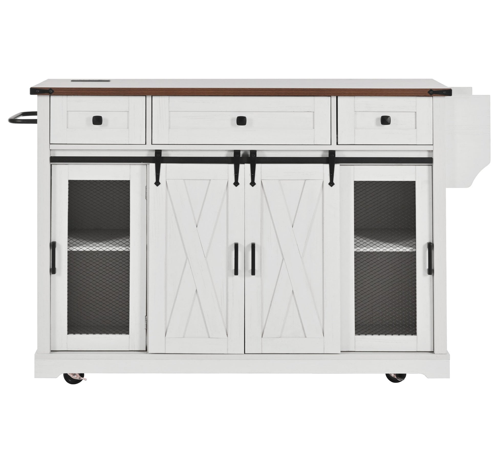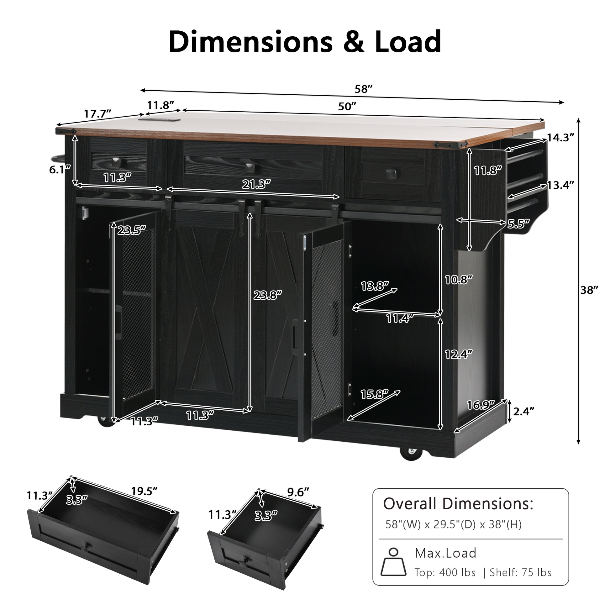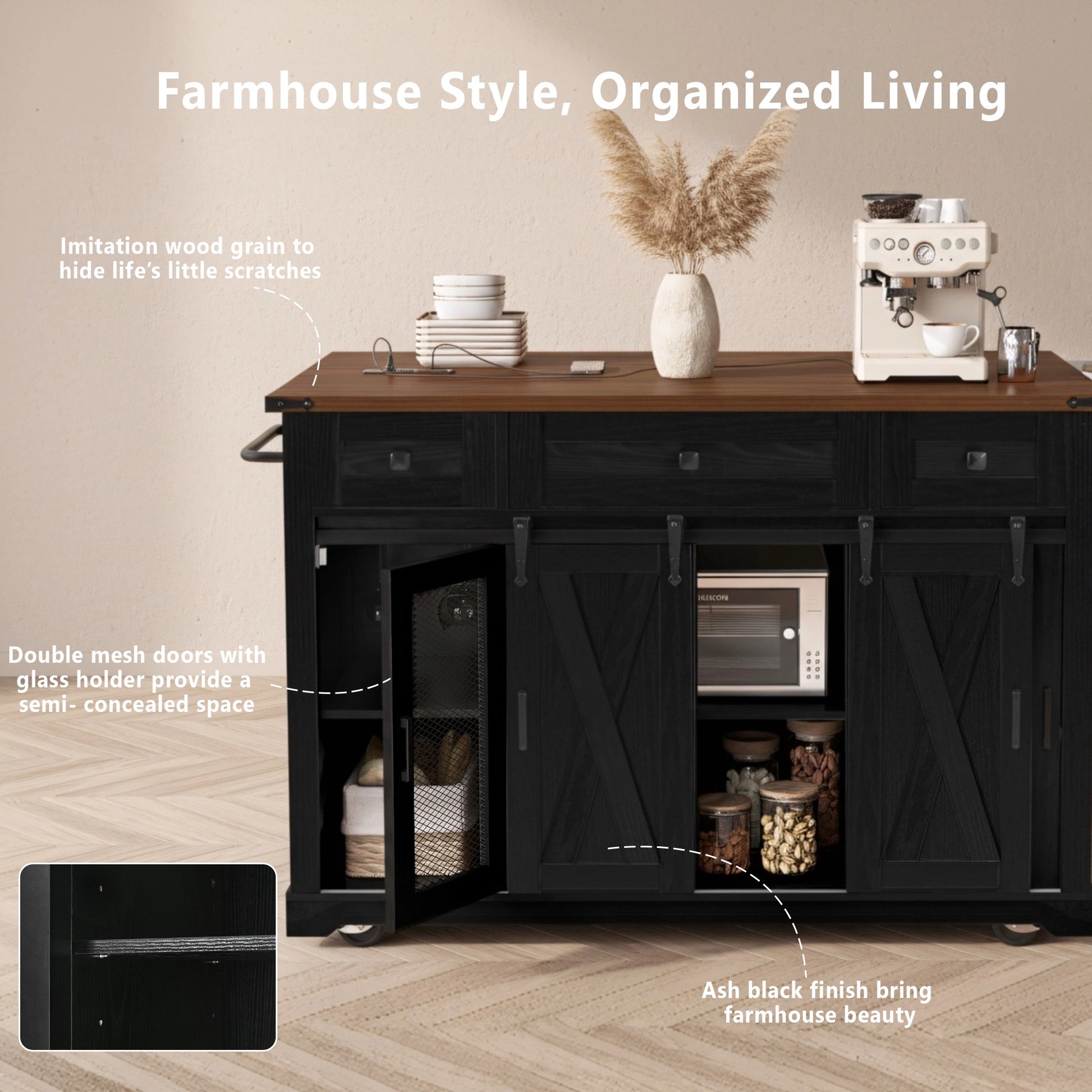 This 58" farmhouse kitchen island blends rustic charm with modern function. It features a large drop-leaf, sliding barn doors, and abundant storage including a spice rack. With a built-in charging station, five wheels for mobility, and a sturdy build, it's a versatile and stylish centerpiece for any kitchen.