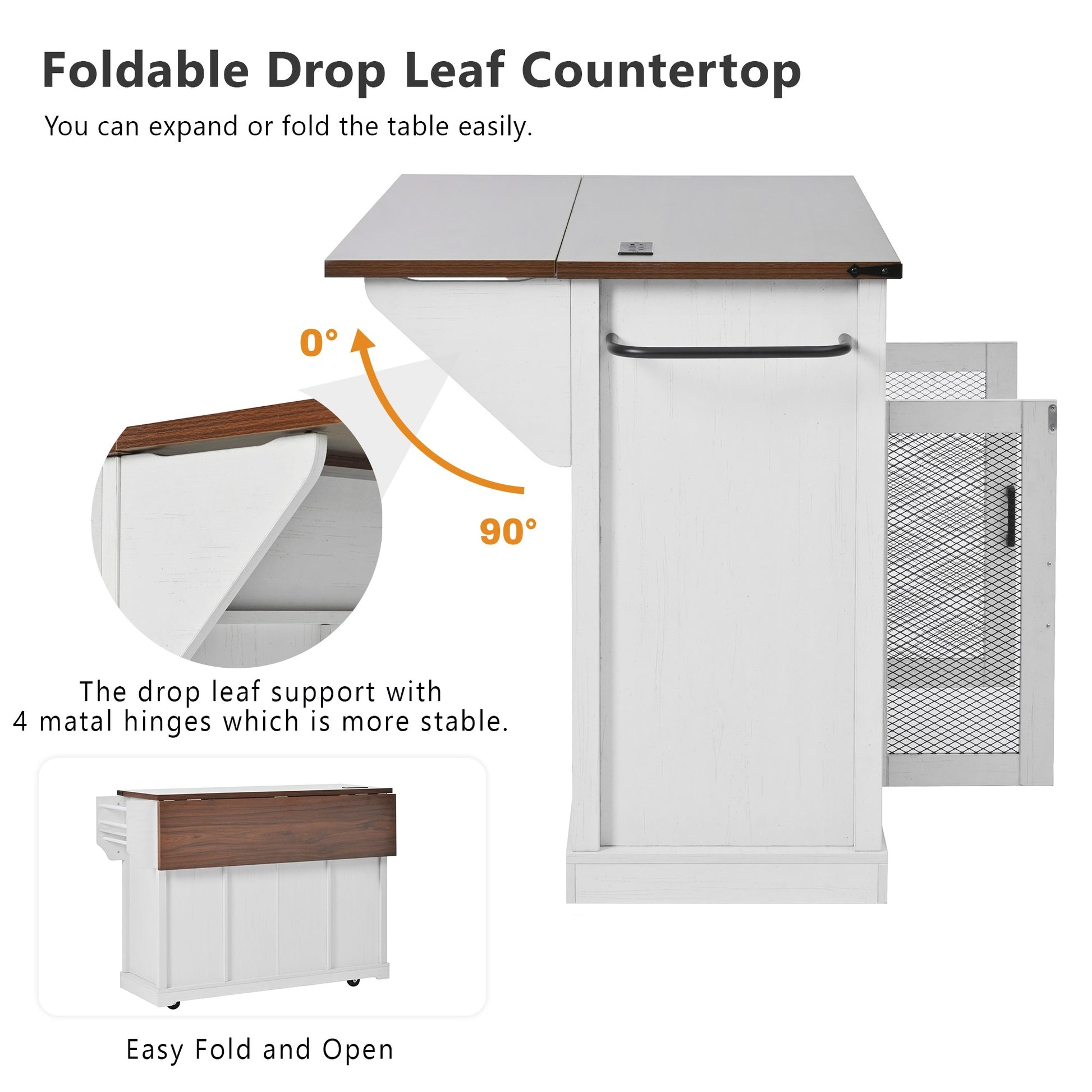 58" Farmhouse Kitchen Island with Storage, Sliding Barn Door & Metal Grid Side Door, Rolling Kitchen Island on 5 Wheels with Spice Rack, Glass Holders,Island Table with Drop Leaf for Kitchen