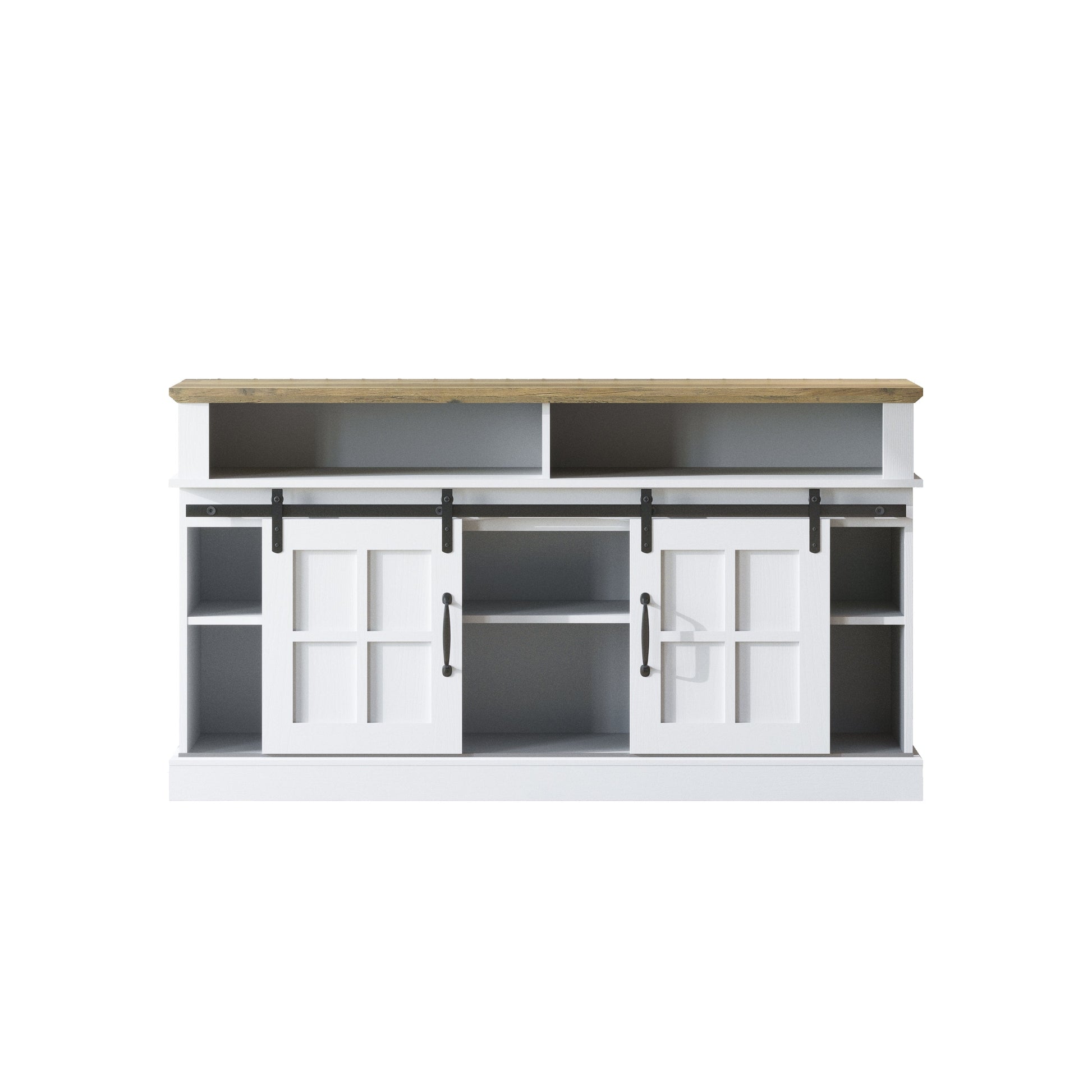 Enhance your home decor with this 58 Inch Farmhouse TV Stand, featuring charming sliding barn doors that add a rustic touch while providing easy access to your electronics. Crafted from durable manufactured wood and a high-quality laminate top, this entertainment center combines style and functionality.