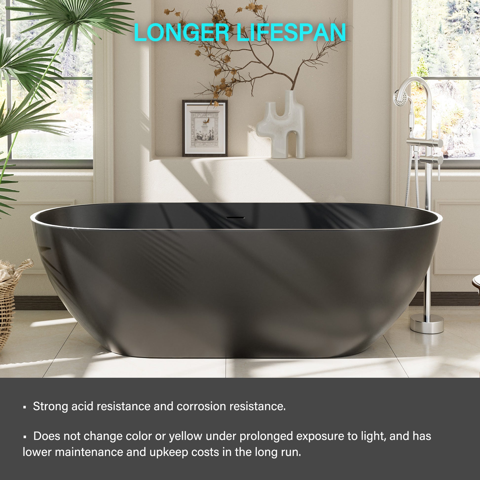 59 in. x 30 in. Solid Surface Stone Resin Freestanding Soaking Bathtub with Center Drain, Drainer, Hose in Matte Black