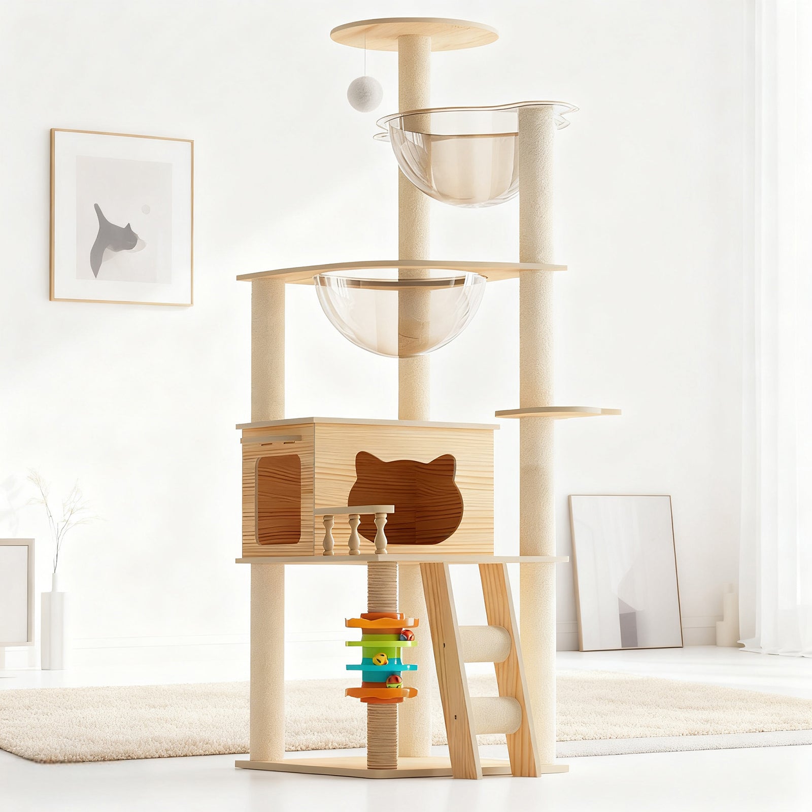 This 59 inch modern cat tower features a clean wooden design that blends naturally with various home interiors while offering a comfortable and functional space for indoor cats. Constructed with durable materials, it provides stable support for cats of all sizes, from playful kittens to larger adult cats. Sisal covered scratching posts encourage healthy scratching habits, while the elevated top perch gives pets a perfect spot to rest and observe their environment. The built in acrylic hammock adds an additional cozy lounging area, ensuring both comfort and entertainment for your cat.