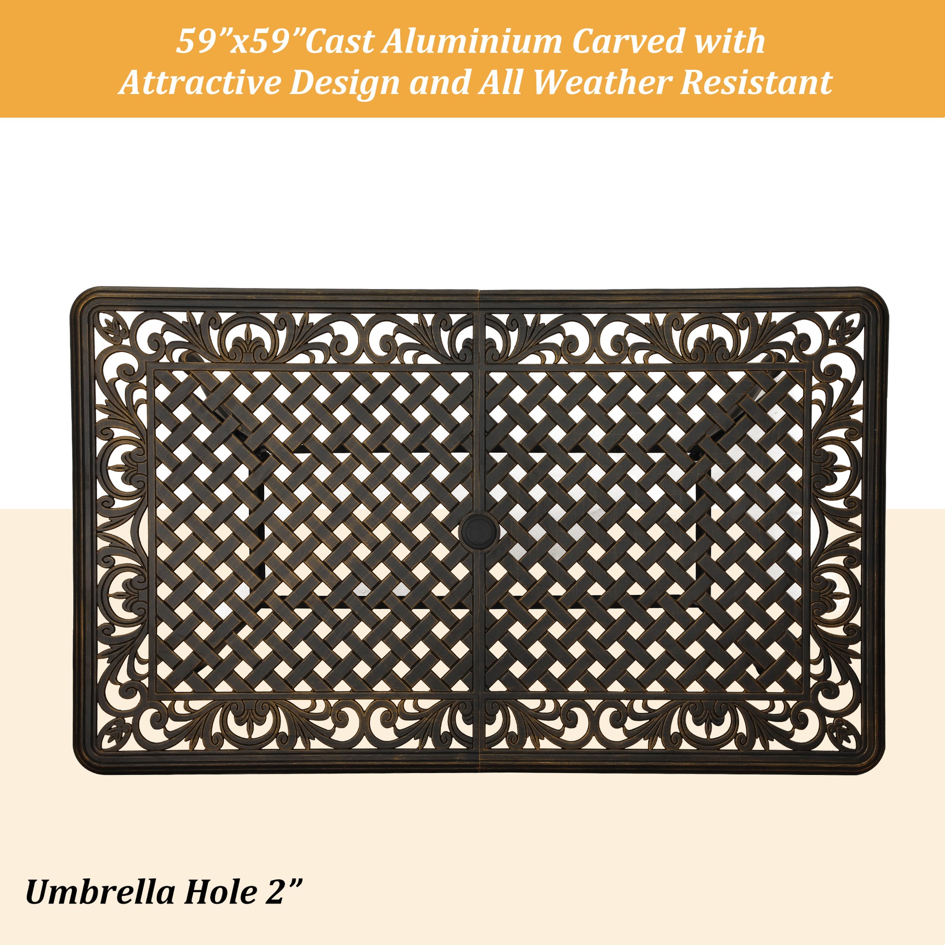 This 59 inches patio dining table provides ample space for food and drink, and also provides spacious space for entertaining guests. In addition, a 2 inches umbrella hole is designed for placing outdoor umbrellas, which is convenient and practical. It is the perfect complement and the best choice for you outdoors.The outdoor dining table features cast aluminum frames resist rust and corrosion. Its exquisite workmanship, clear texture and smooth tabletop, easy to clean. Perfect for having dinner with your closest family and friends plus yourself or for using as a serving table for your weekly BBQs. The cast aluminum table is rust-resistant and corrosion-resistant, and can withstand the worst weather conditions. It is equipped with supporting foot pads to ensure non-slip and provide additional stability to adapt to different floors.The desktop is designed with retro carved patterns and hollowed-out patterns, adding natural flavor to your garden.