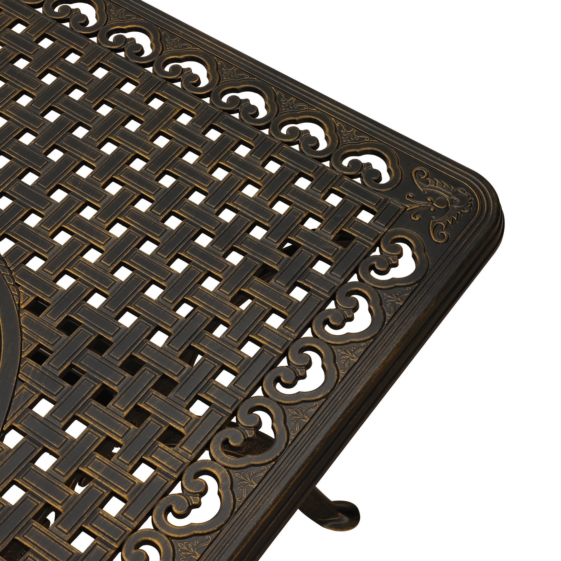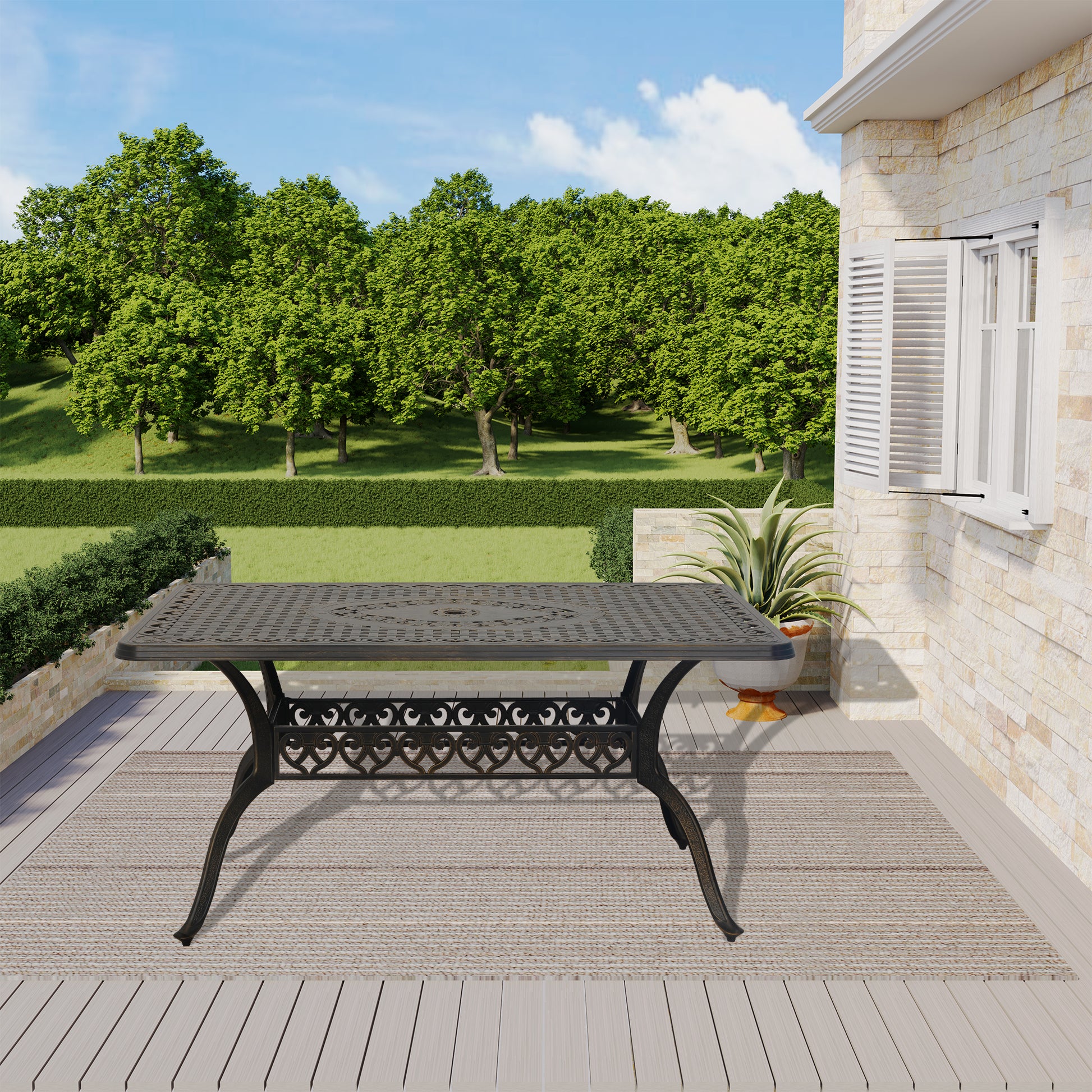 This 59 inches patio dining table provides ample space for food and drink, and also provides spacious space for entertaining guests. In addition, a 2 inches umbrella hole is designed for placing outdoor umbrellas, which is convenient and practical. It is the perfect complement and the best choice for you outdoors.The outdoor dining table features cast aluminum frames resist rust and corrosion. Its exquisite workmanship, clear texture and smooth tabletop, easy to clean. Perfect for having dinner with your closest family and friends plus yourself or for using as a serving table for your weekly BBQs. The cast aluminum table is rust-resistant and corrosion-resistant, and can withstand the worst weather conditions. It is equipped with supporting foot pads to ensure non-slip and provide additional stability to adapt to different floors.The desktop is designed with retro carved patterns and hollowed-out patterns, adding natural flavor to your garden.