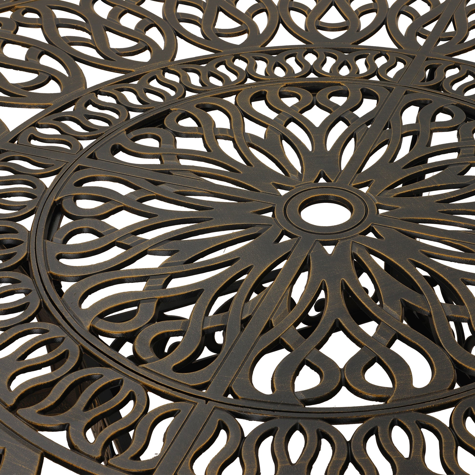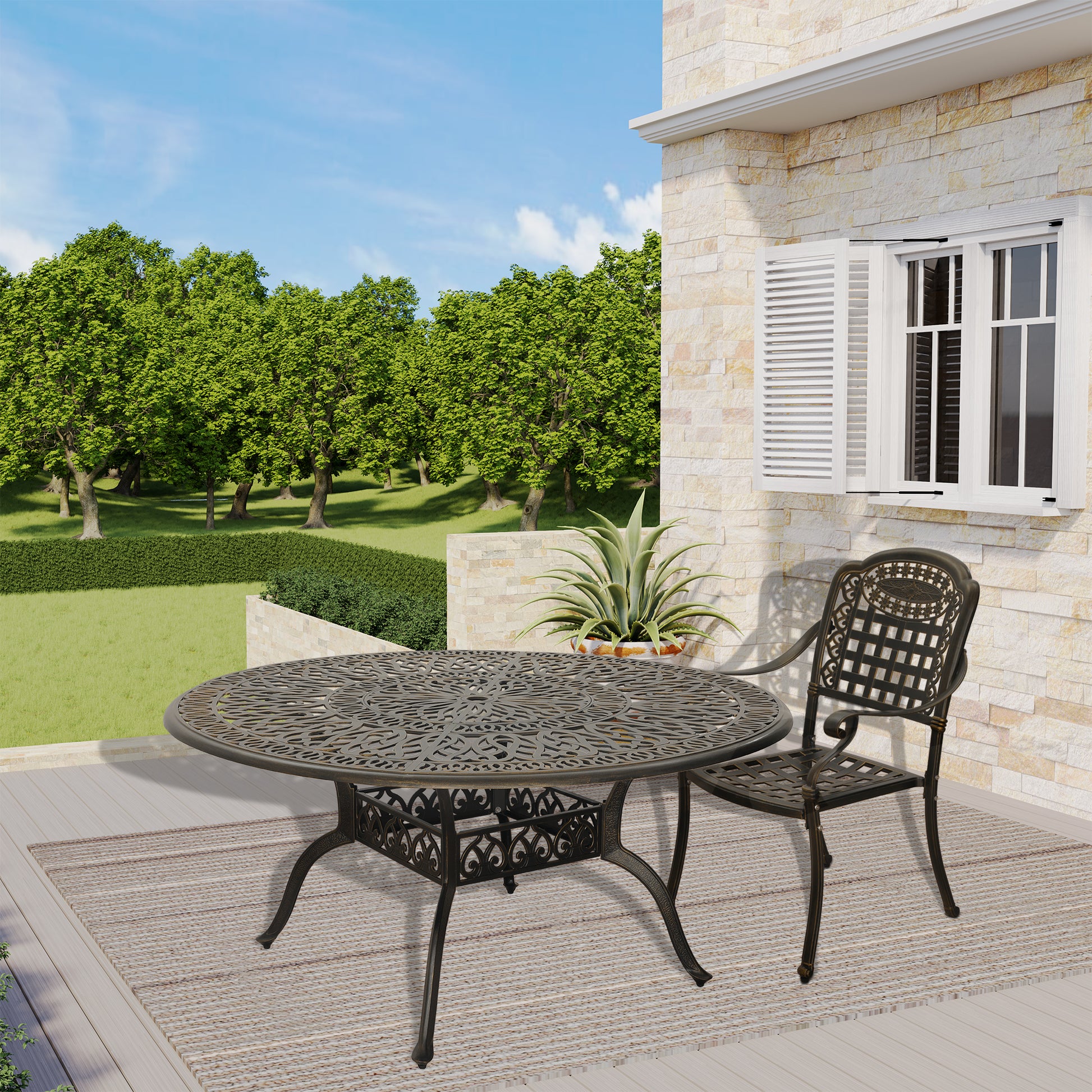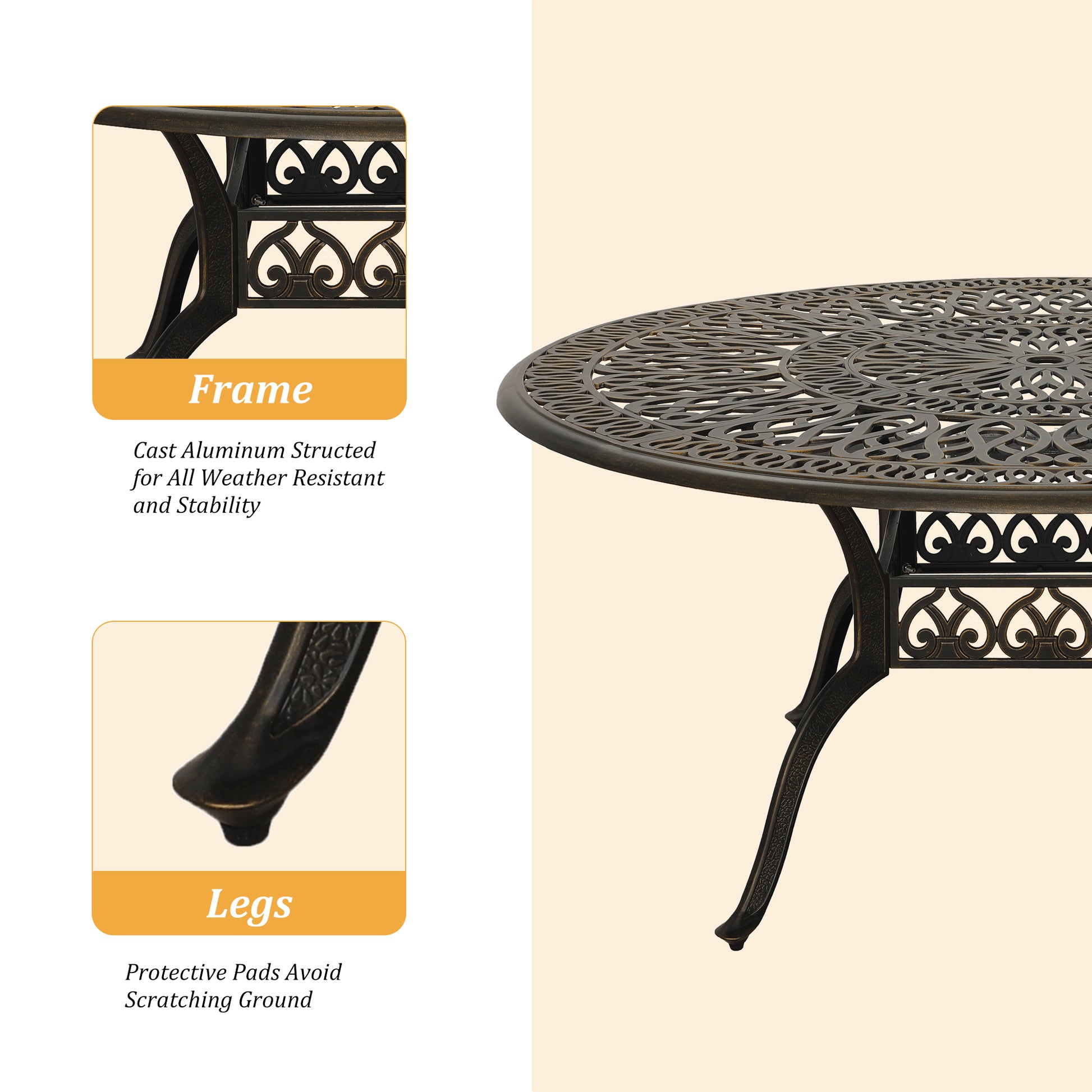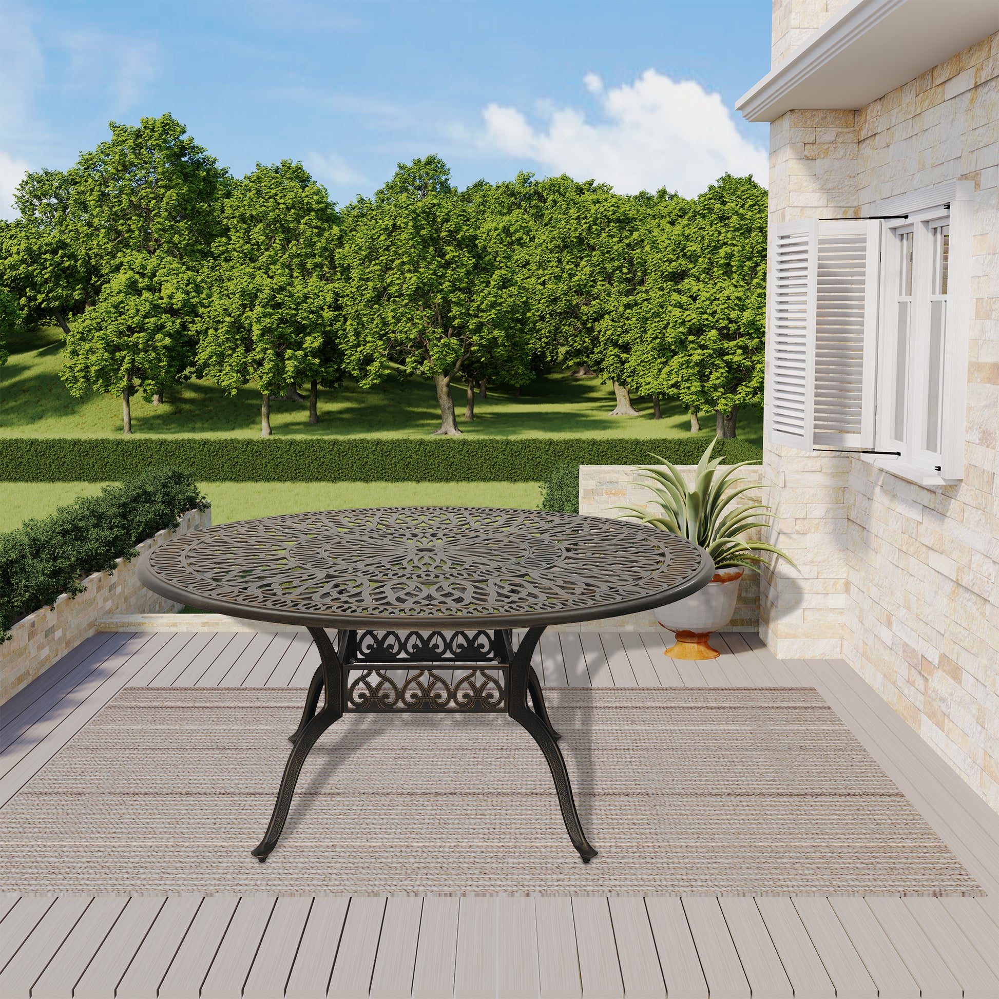 This 59 inches cast aluminum outdoor dining table is a comfortable and stylish outdoor furniture in your courtyard, which can accommodate 4-6 people. Relax and enjoy a meal outdoor with this dining table with your family and friends. Crafted from sturdy cast-aluminum with a powder-coated finish, this patio bistro table features an intricate design on its tabletop. Sure to be a focal point this table can be paired with dining chairs or join an eclectic mix of furniture on your patio or deck. It can be used in many occasions and can add decoration to your backyard, pool and more.