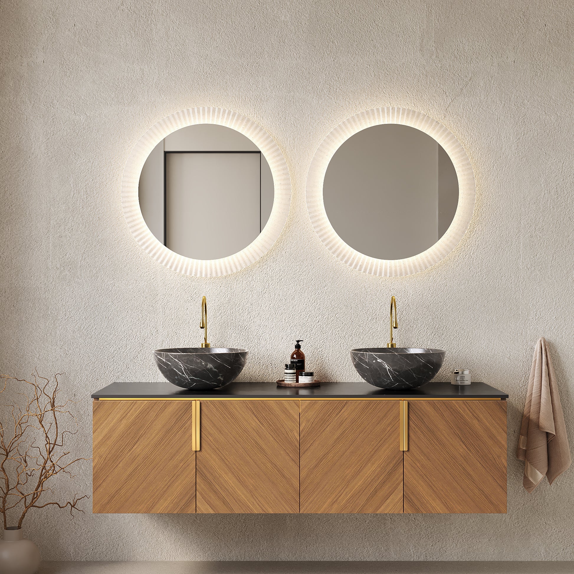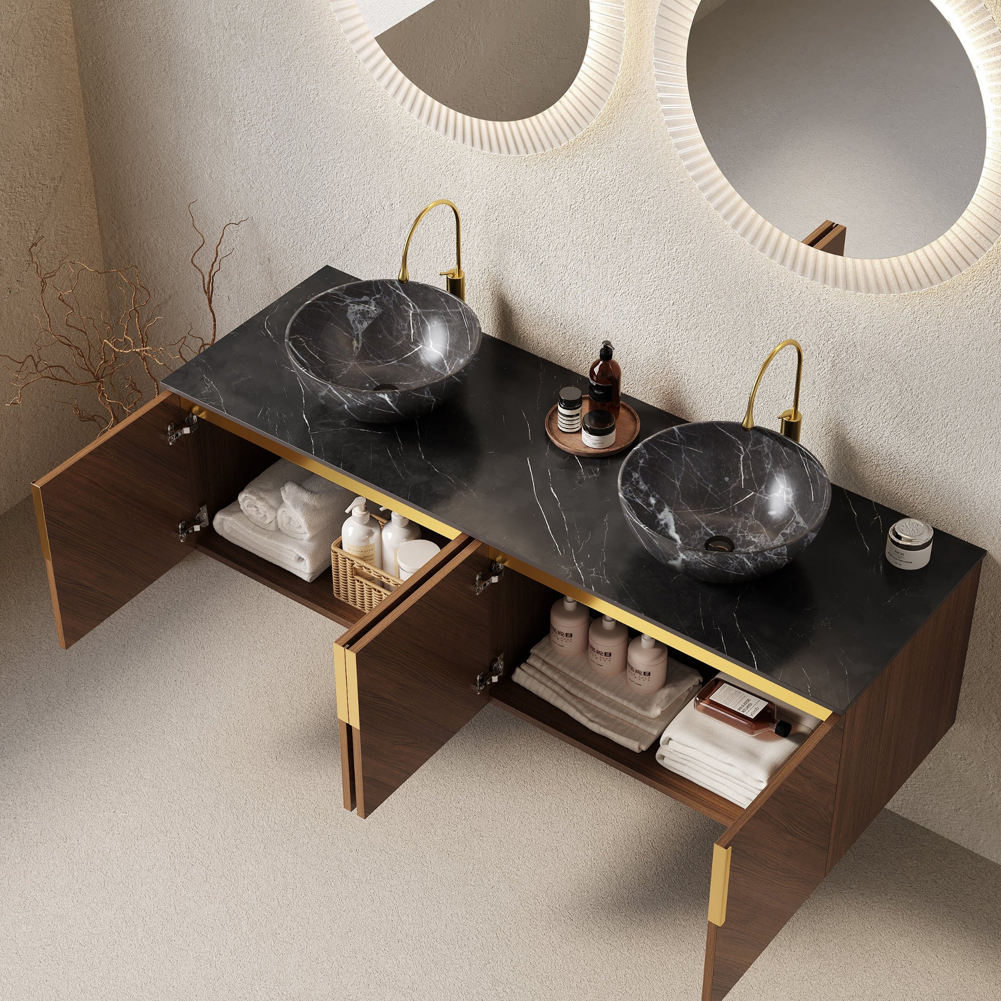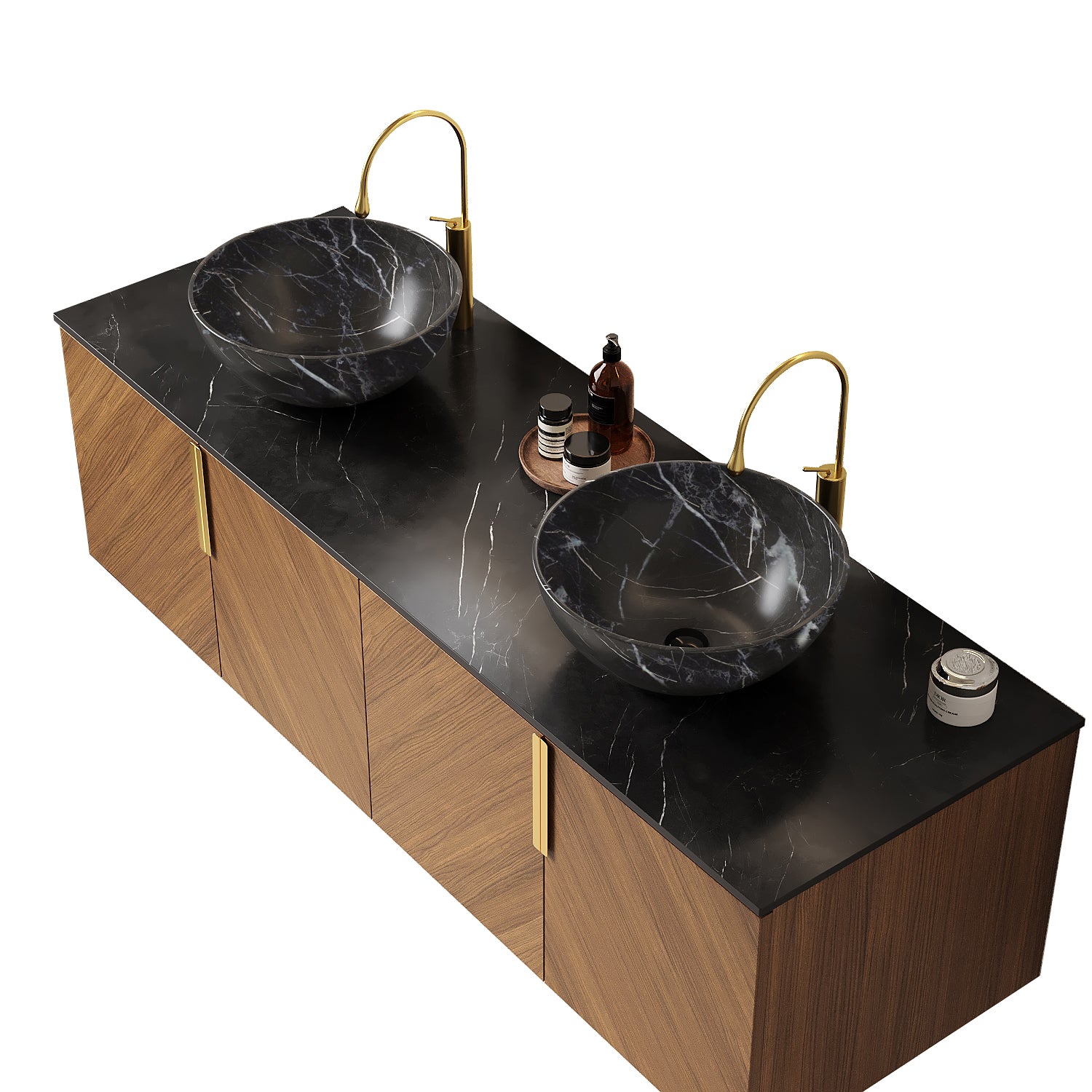60 Bathroom Vanity with Sinks Floating Plywood Cabinet 4 Doors 2 Black Bowl Ceramic Basins Stone Pattern Black Sintered Stone Espresso