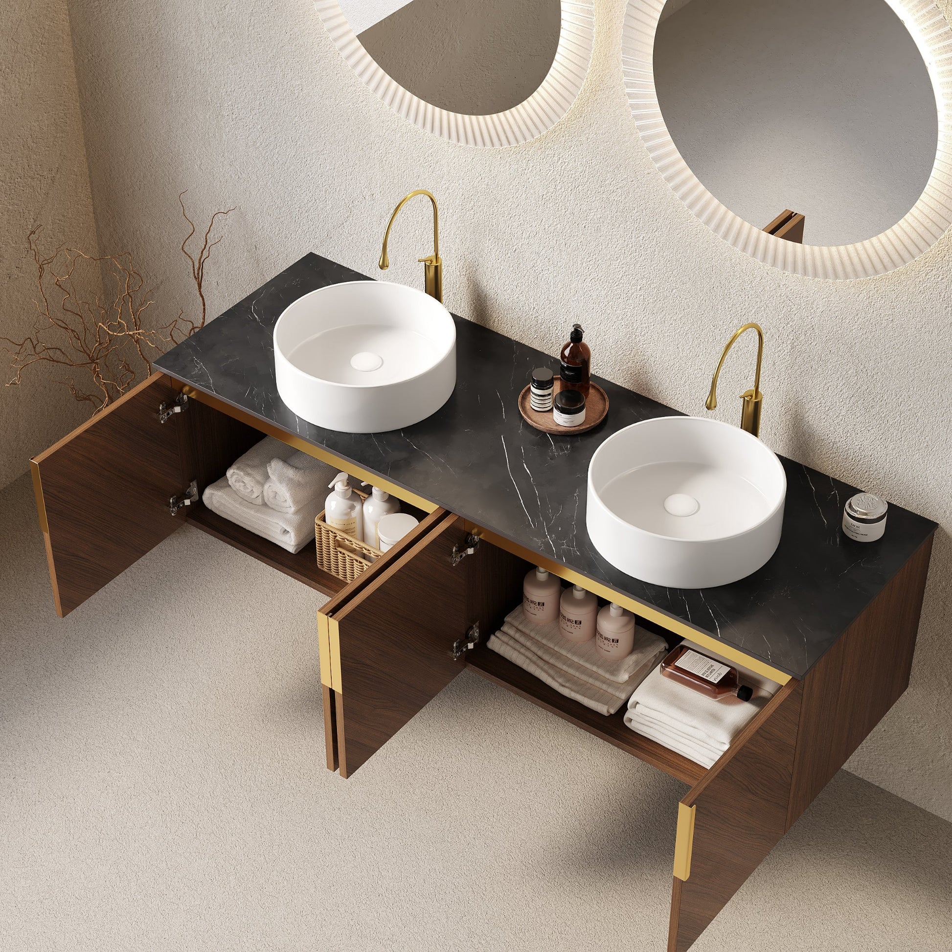 60 Bathroom Vanity with Sinks Floating Wall Mounted Plywood Cabinet 4 Doors 2 White Round Ceramic Basins Black Sintered Stone Espresso