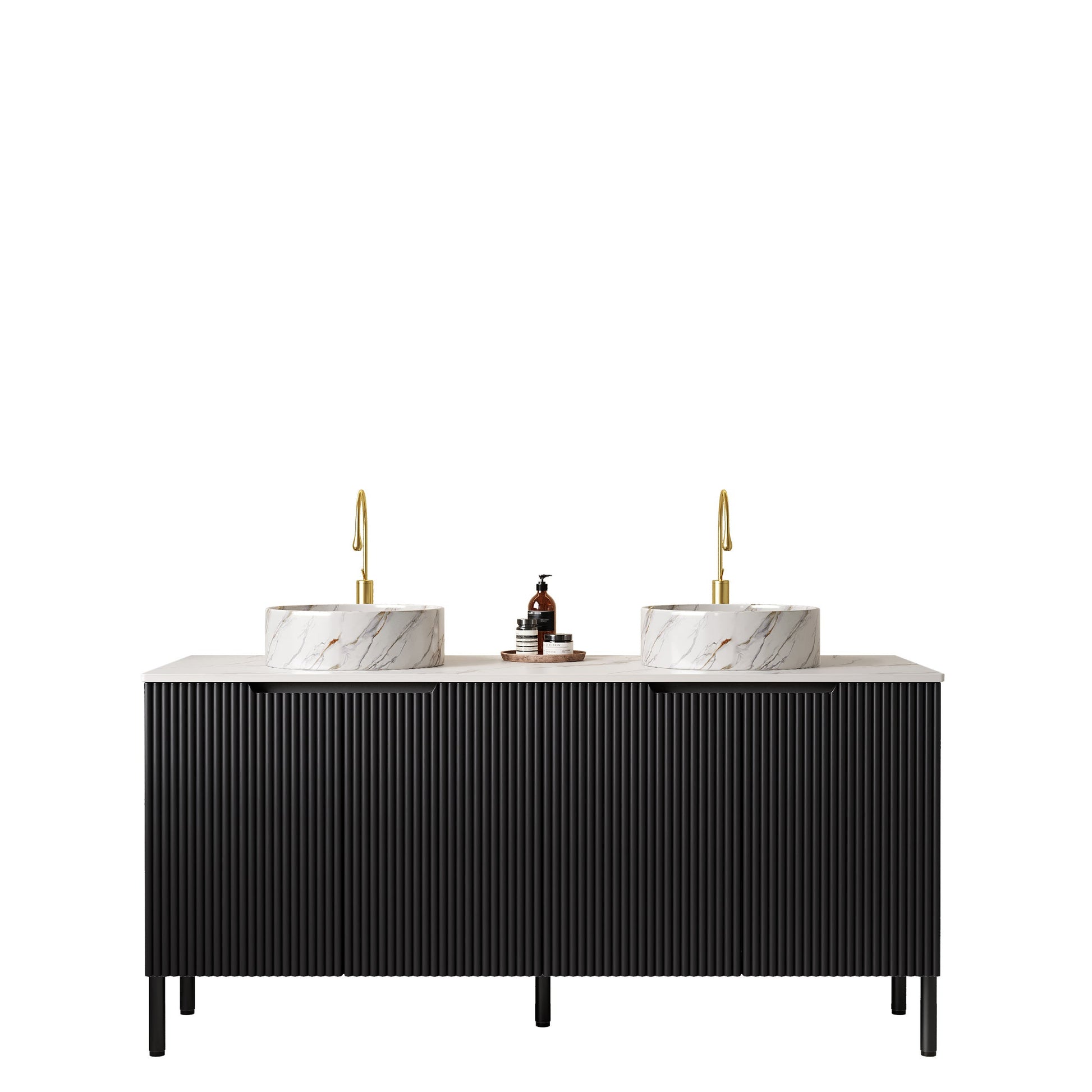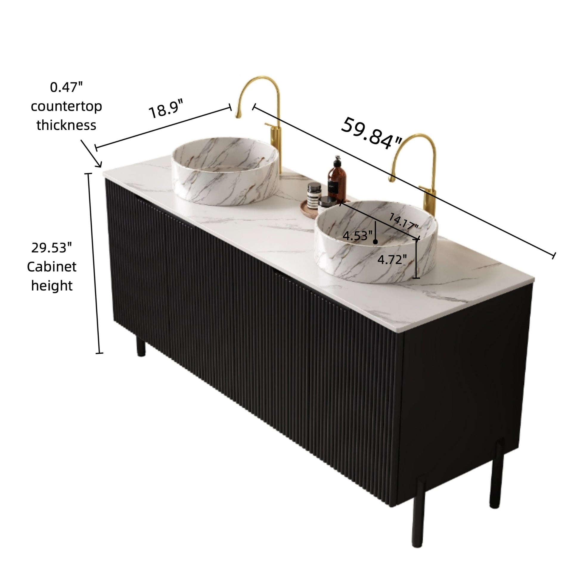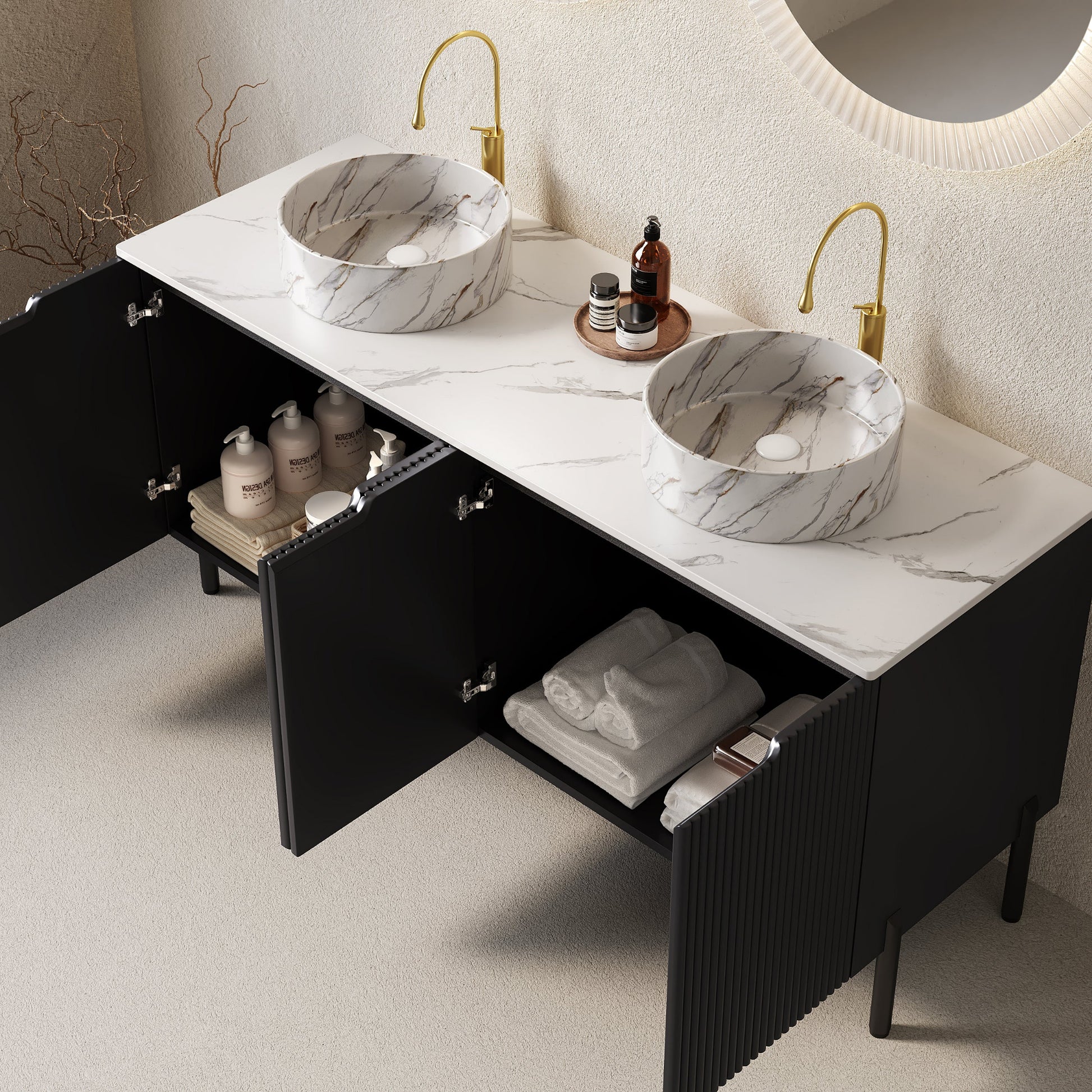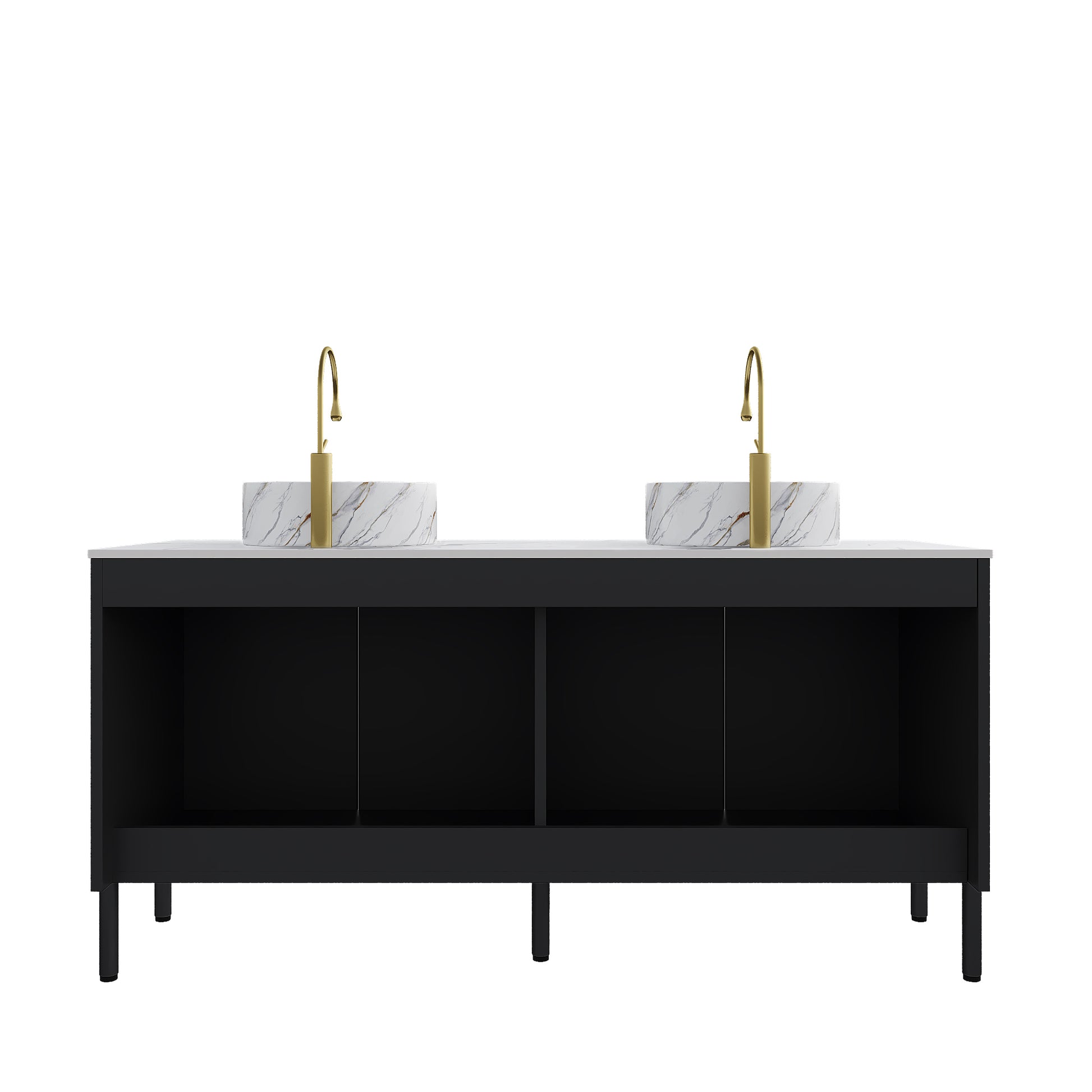 60 Bathroom Vanity with Sinks Freestanding Cabinet 4 Doors 2 White Round Ceramic Basins Stone Pattern Carrara White Top Black
