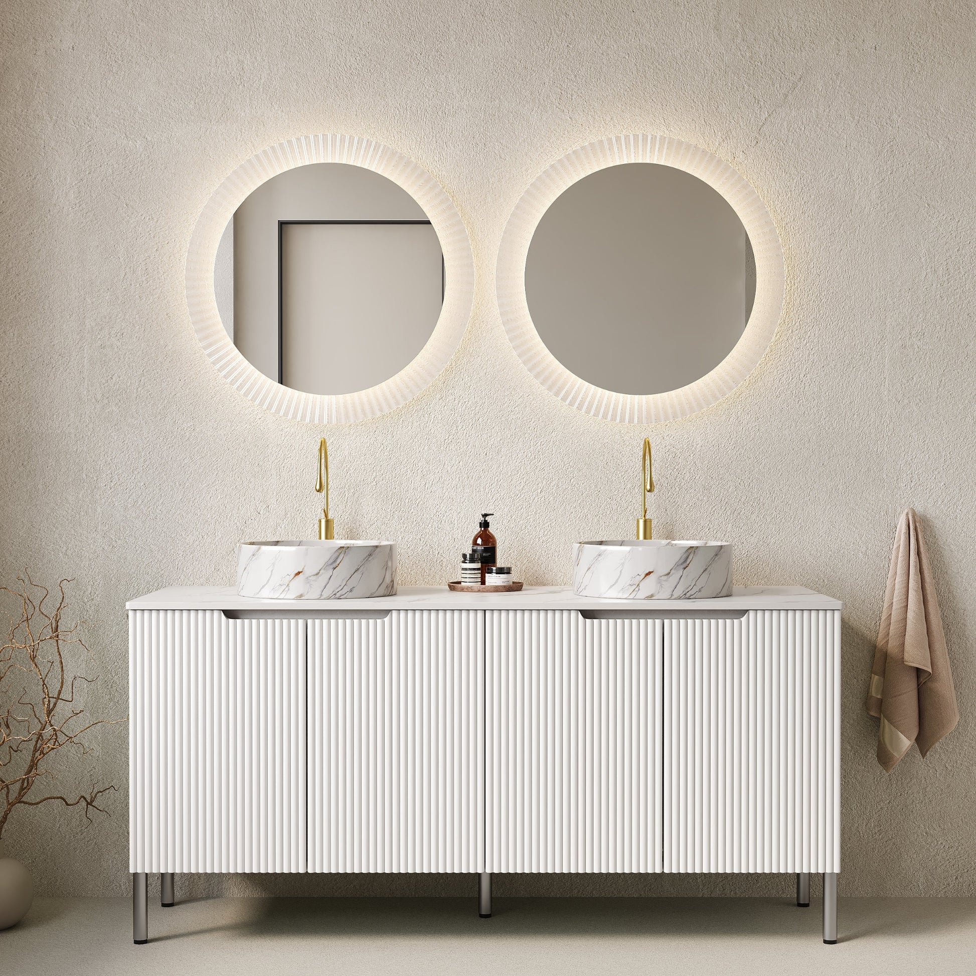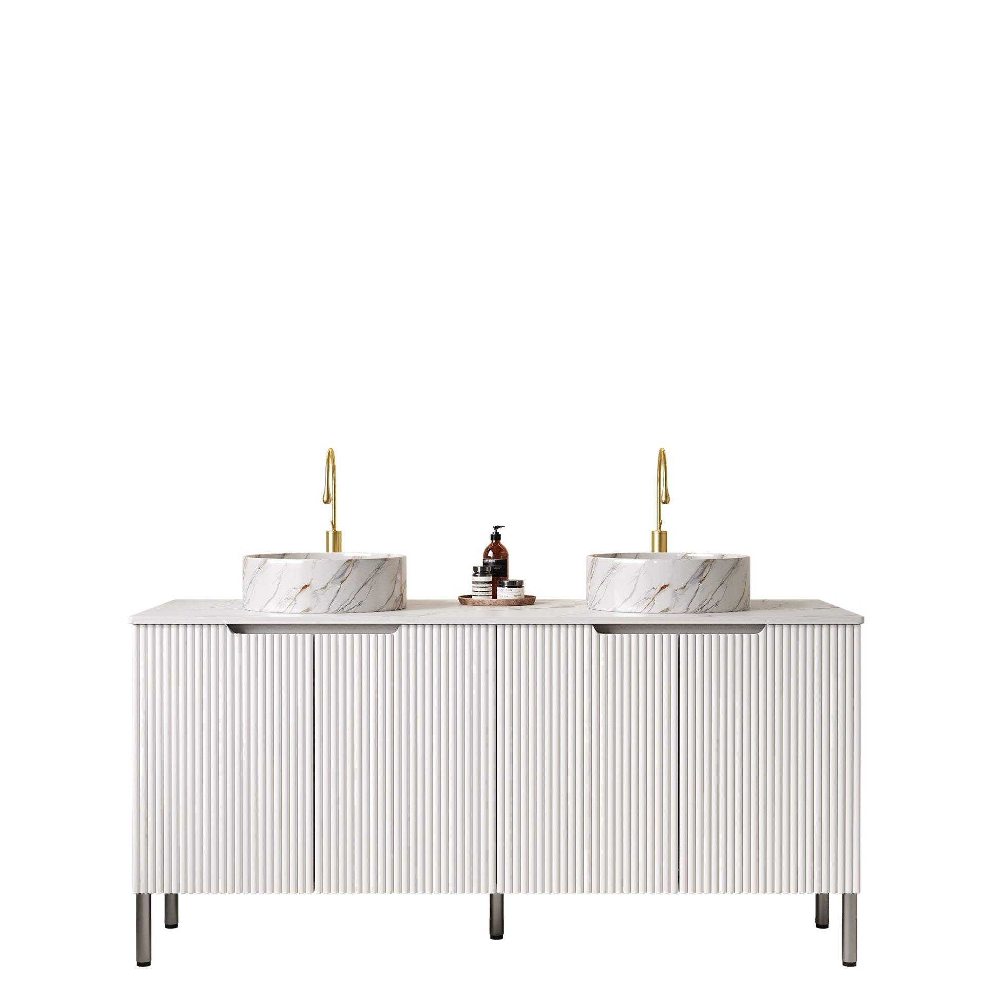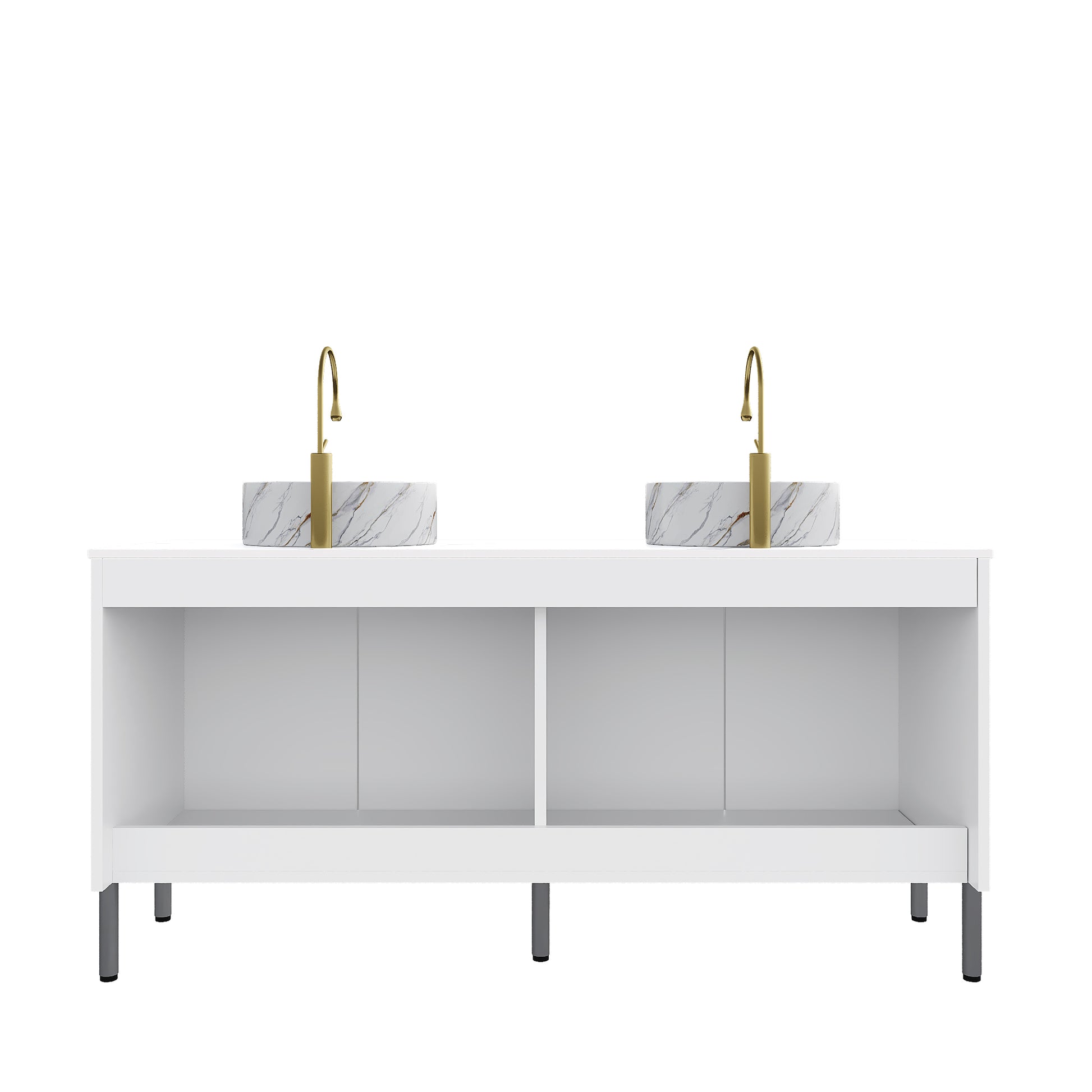 60 Bathroom Vanity with Sinks Freestanding Cabinet 4 Doors 2 White Round Ceramic Basins Stone Pattern Carrara White Top White