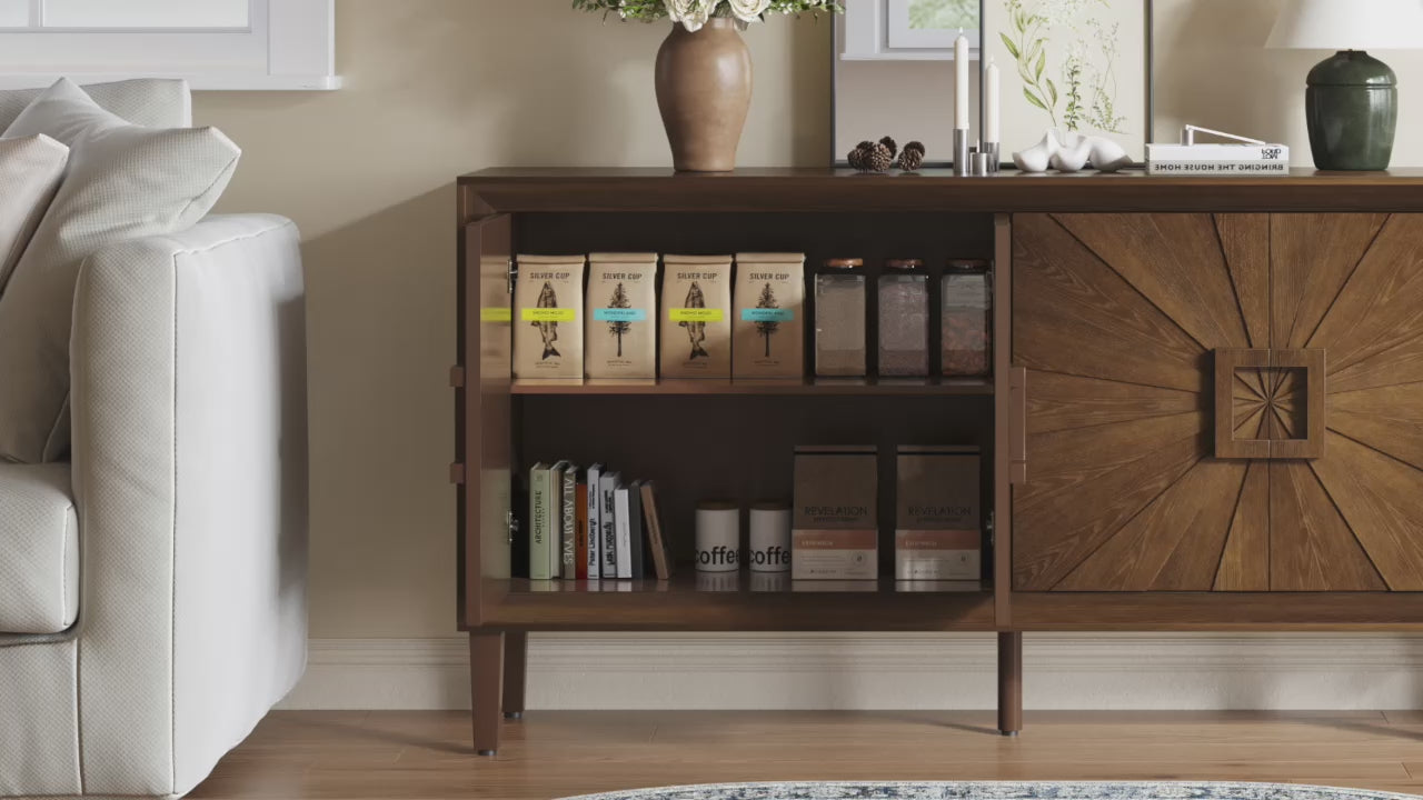 This 60 inch rustic farmhouse credenza features a striking symmetrical sunburst door design that adds handcrafted character to any living or dining space. Built with a reinforced antique wood frame and durable MDF panels, it delivers both stability and timeless American country style. Its adjustable shelves and large load bearing top make it suitable for use as a TV stand, buffet cabinet, or multi purpose storage unit in modern or rustic homes. The polished edges, anti tip hardware and smooth door movement ensure dependable safety for daily family use.