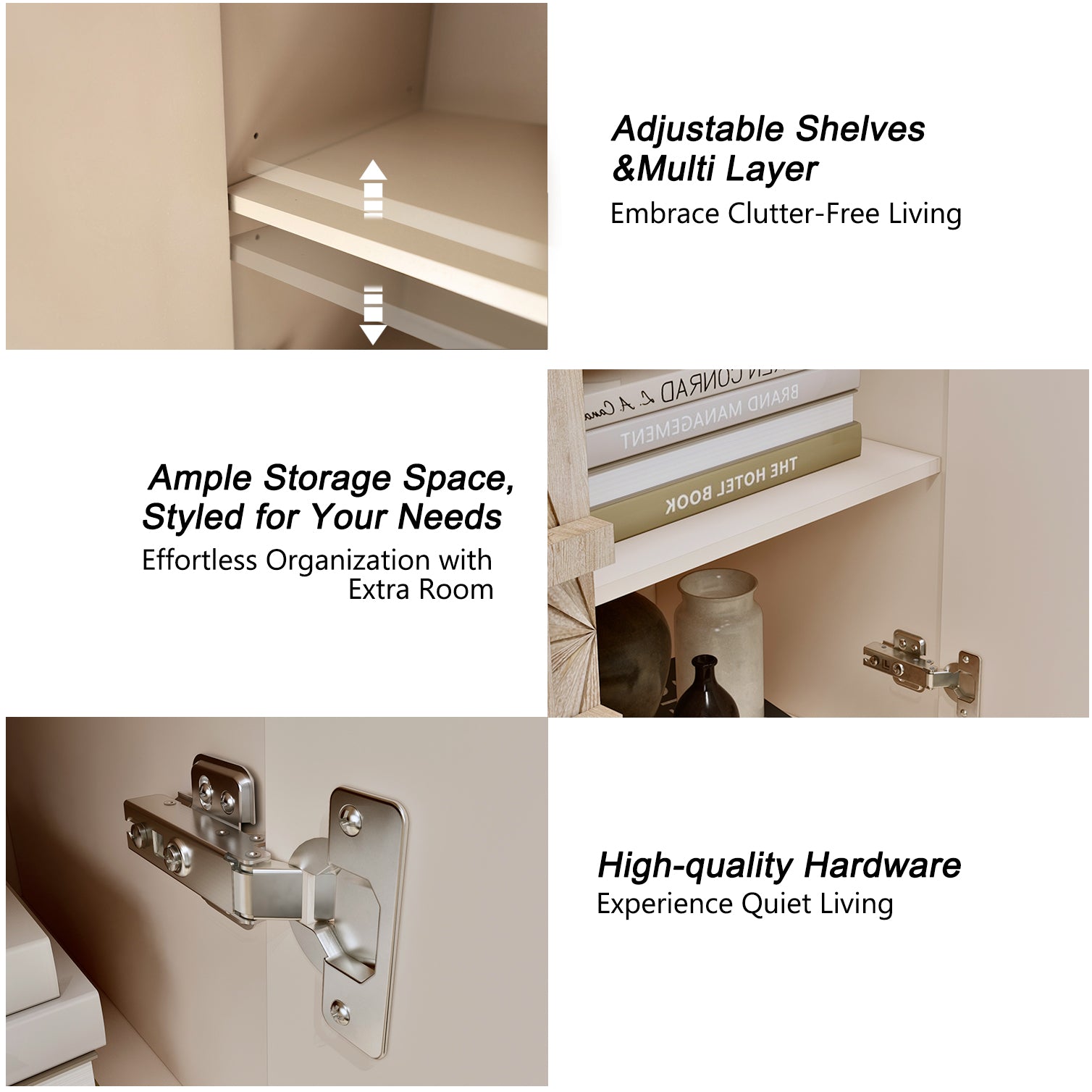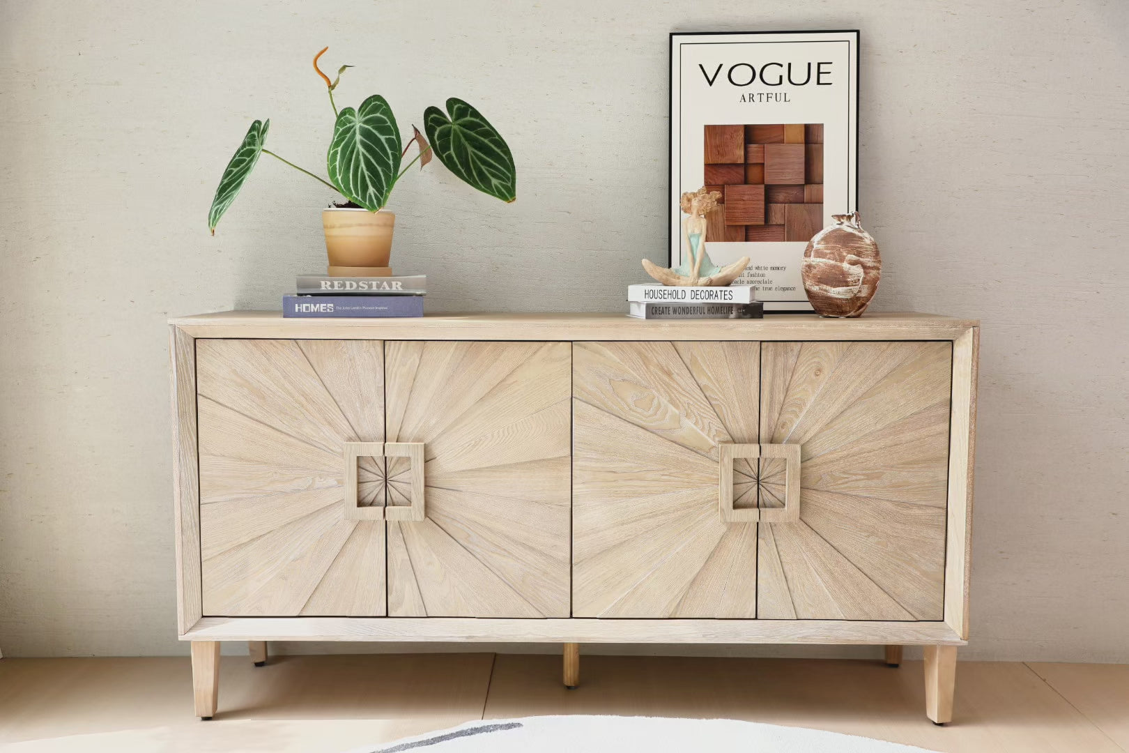 This 60 inch rustic farmhouse credenza features a symmetrical sunburst door design that highlights handcrafted American country style. Finished in an antique natural wood tone, it brings warmth and timeless texture to living rooms, dining areas or entryways. Built from durable MDF with reinforced structure, the cabinet offers high load bearing performance and versatile storage options. Adjustable shelves and a spacious top surface make it ideal for use as a TV stand, buffet cabinet or general storage. Smooth door gliding, polished edges and anti tip hardware ensure long lasting safety and stability for family use.