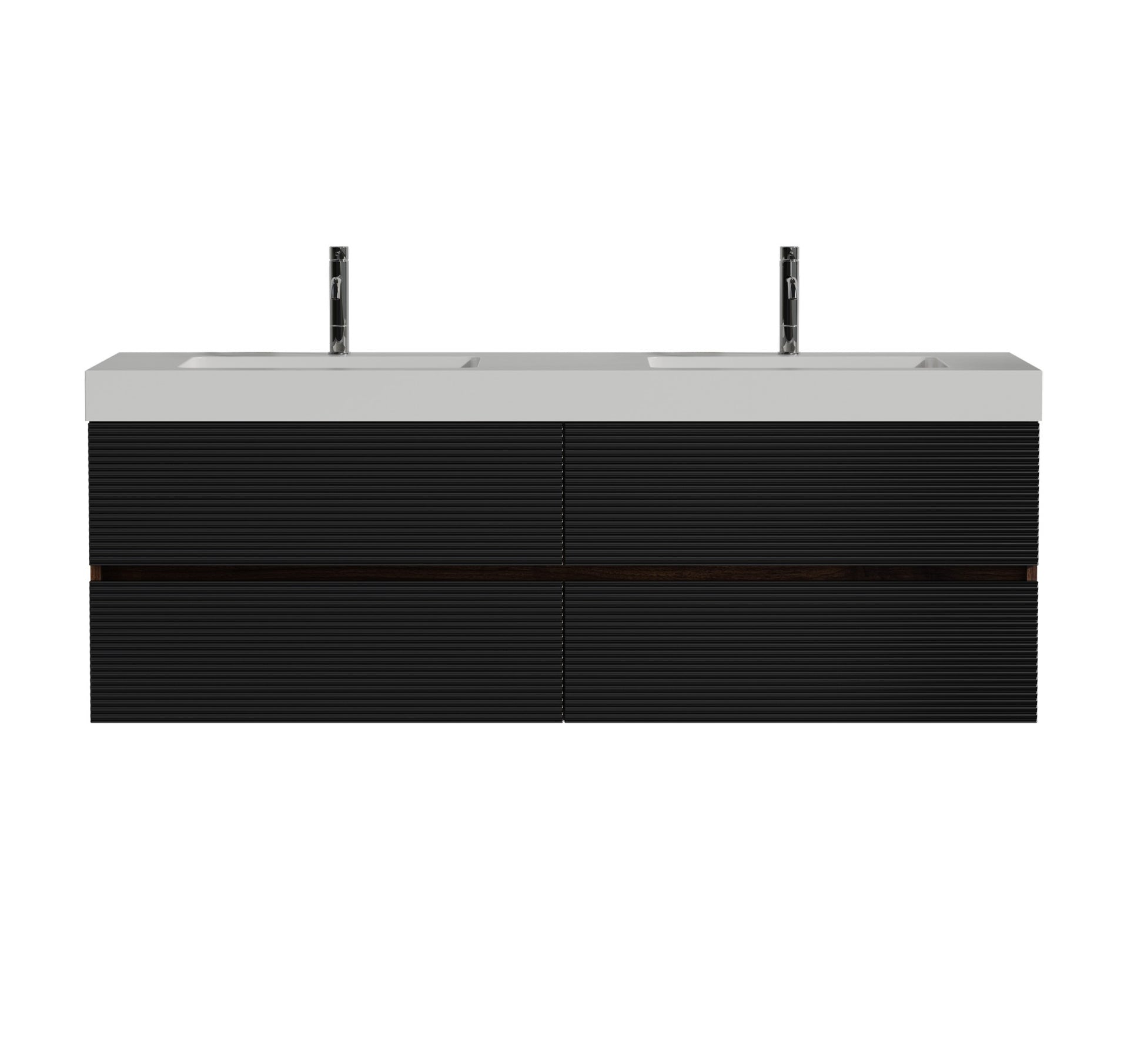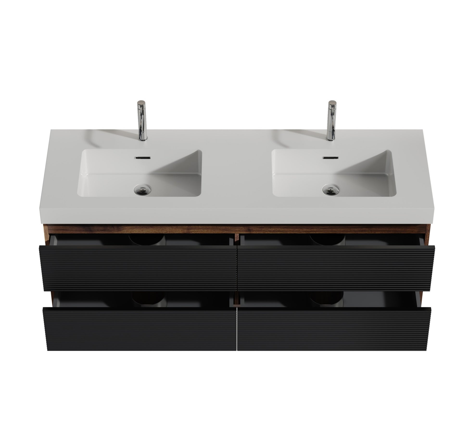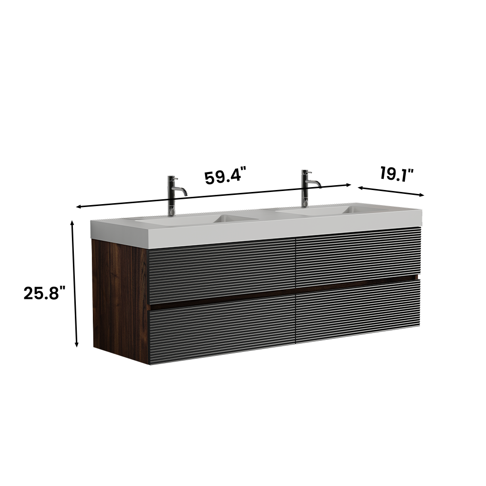 Modern mid-century wall-mounted bathroom vanity with four drawers, combining functionality with sleek style, featuring timeless black and walnut elegance through a unique black grille panel and walnut color splicing. Made from E1 grade eco-friendly panels with authentic wood grain textured side panels for durability and sustainability. Finished with E0 grade water-based eco-friendly lacquer for enhanced water resistance and exceptional sensory experience. Hidden center handle prevents scratches, ensuring maximum safety for children and elderly users, while two drawers with U-shaped ultra-thin drainage holes provide ample storage, 20% more capacity than standard vanities, and DTC soft-closing drawers deliver silent, smooth operation.