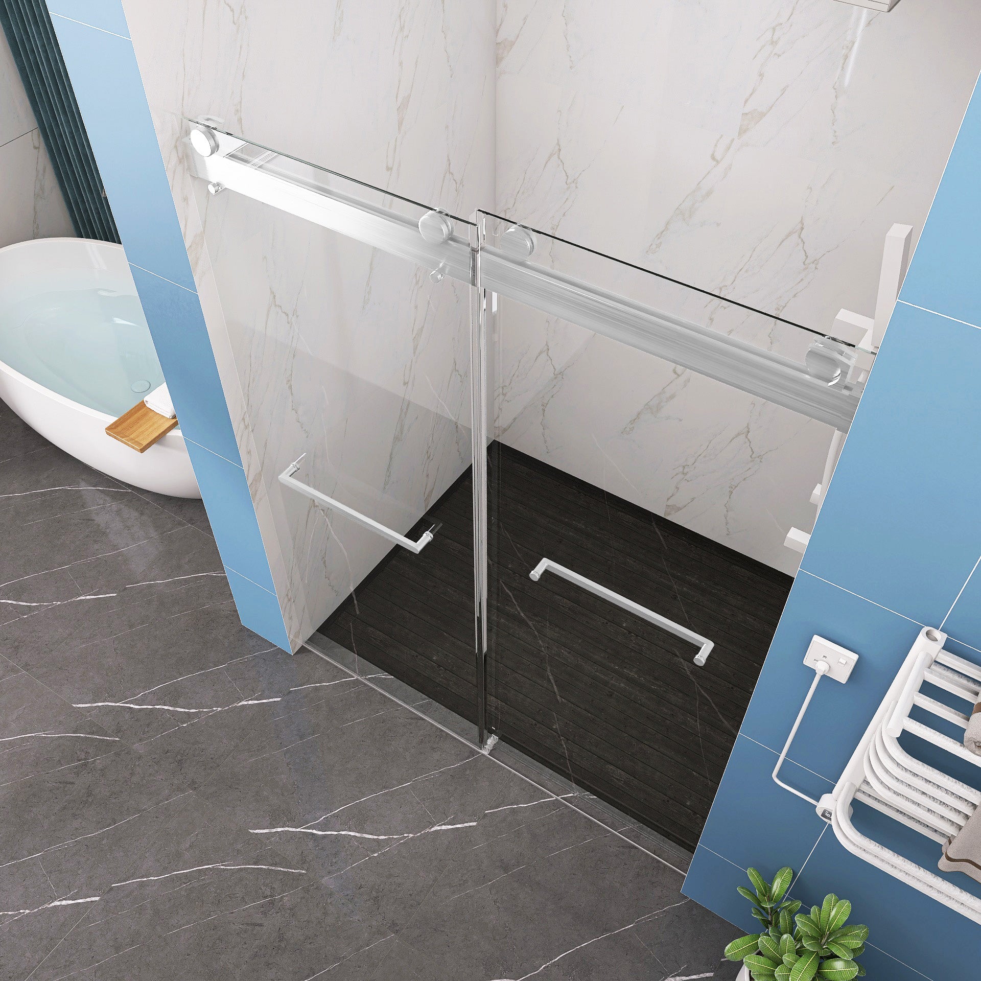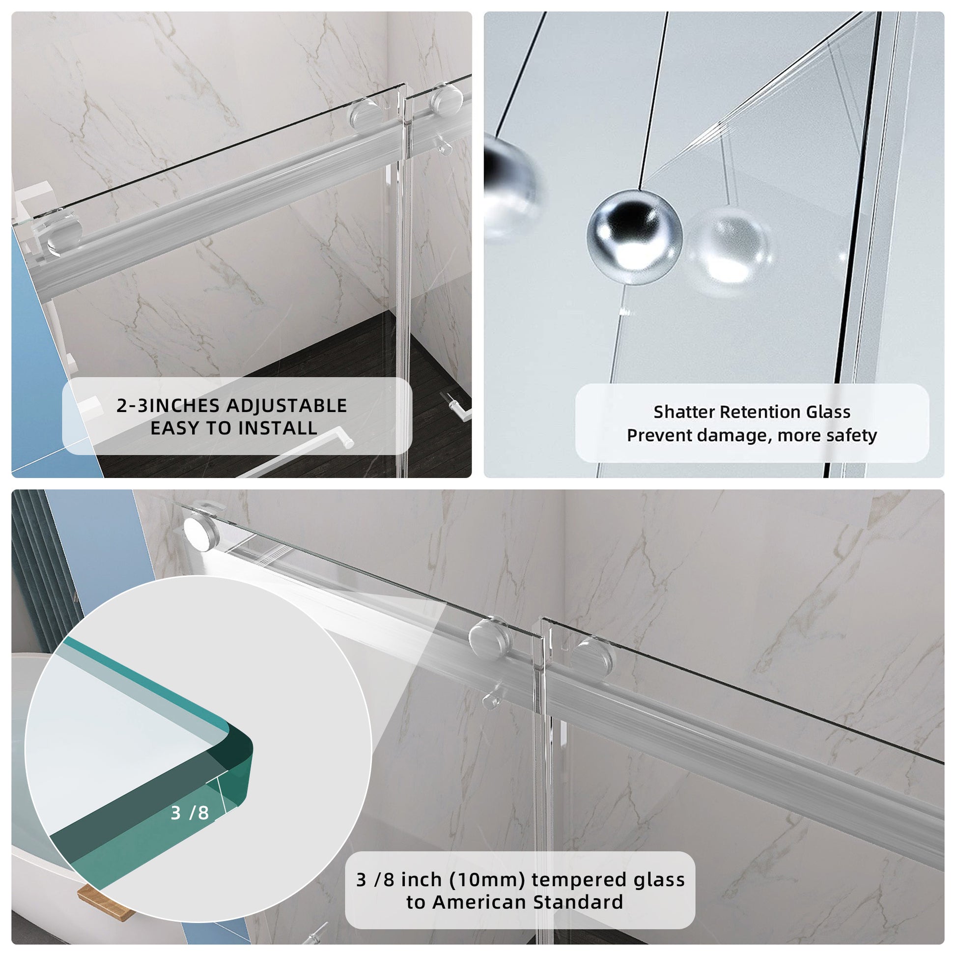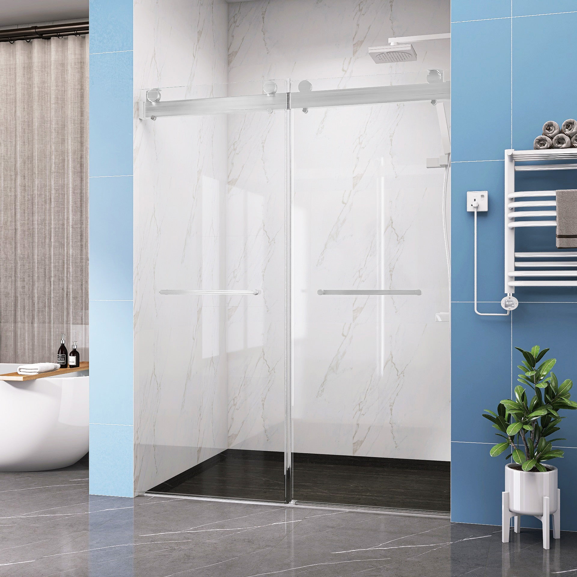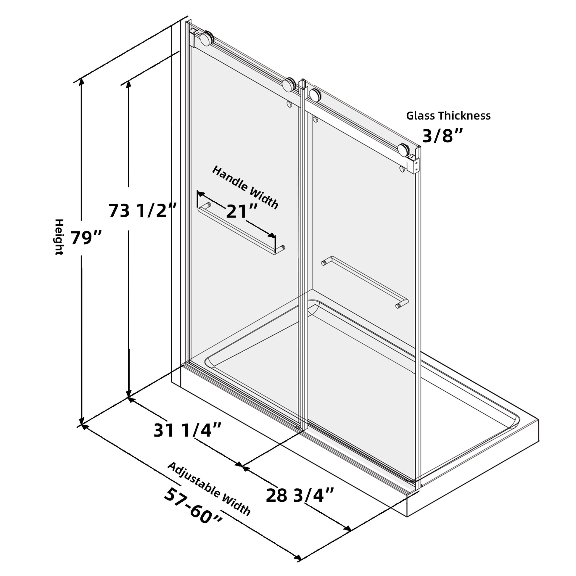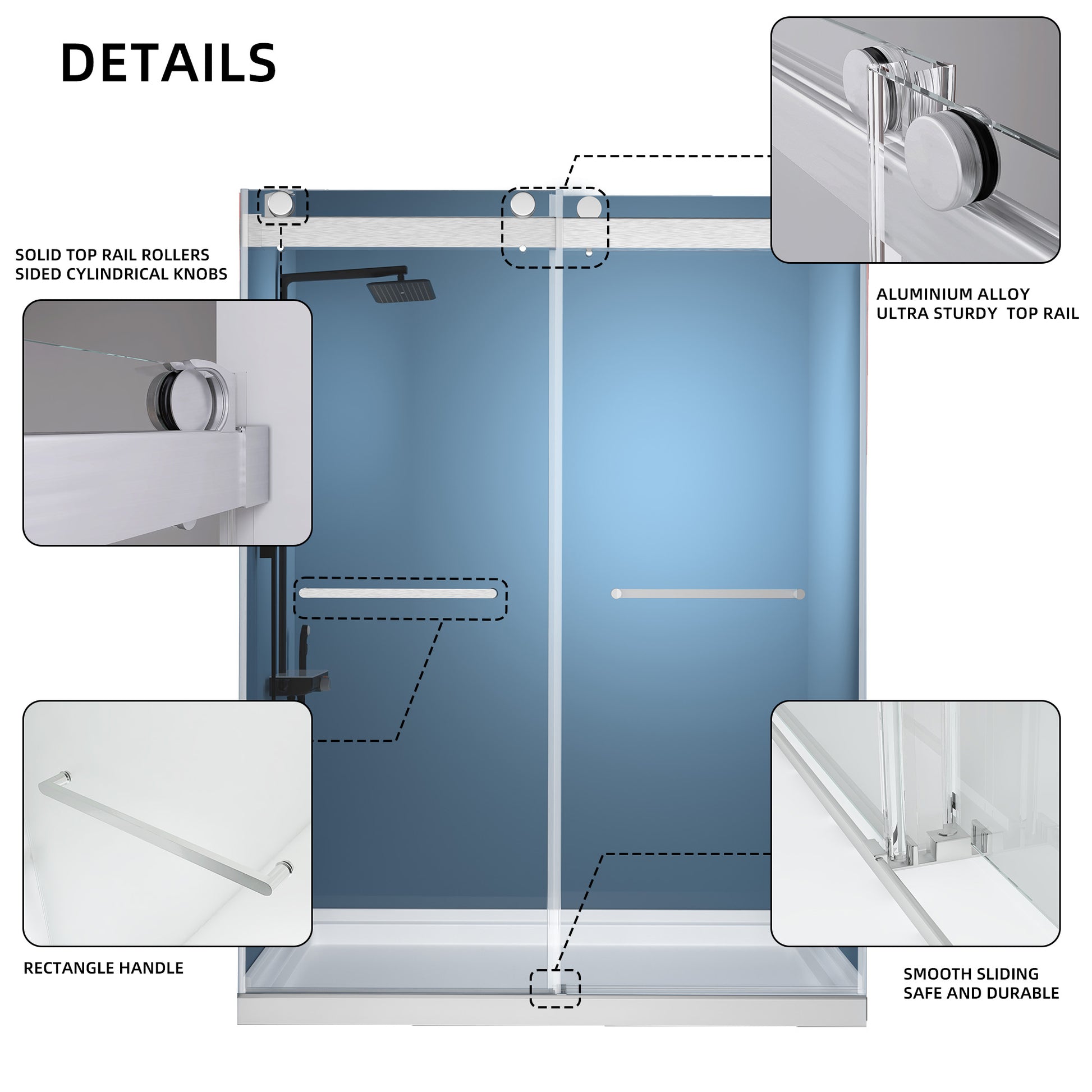This frameless double sliding shower door features 10mm EN12150 certified tempered safety glass with a height of 2000mm, ensuring durability and safety. The double sliding door design has no bottom track and includes an anti-collision device for smooth and secure use. The track is made of high-quality aluminum, and the stainless steel handle provides long-lasting strength with a sleek look. Measuring 60 inches wide and 79 inches high, it comes in a brushed nickel finish that is stylish and corrosion-resistant. The product is packaged with pallet packing for safe and secure transportation.