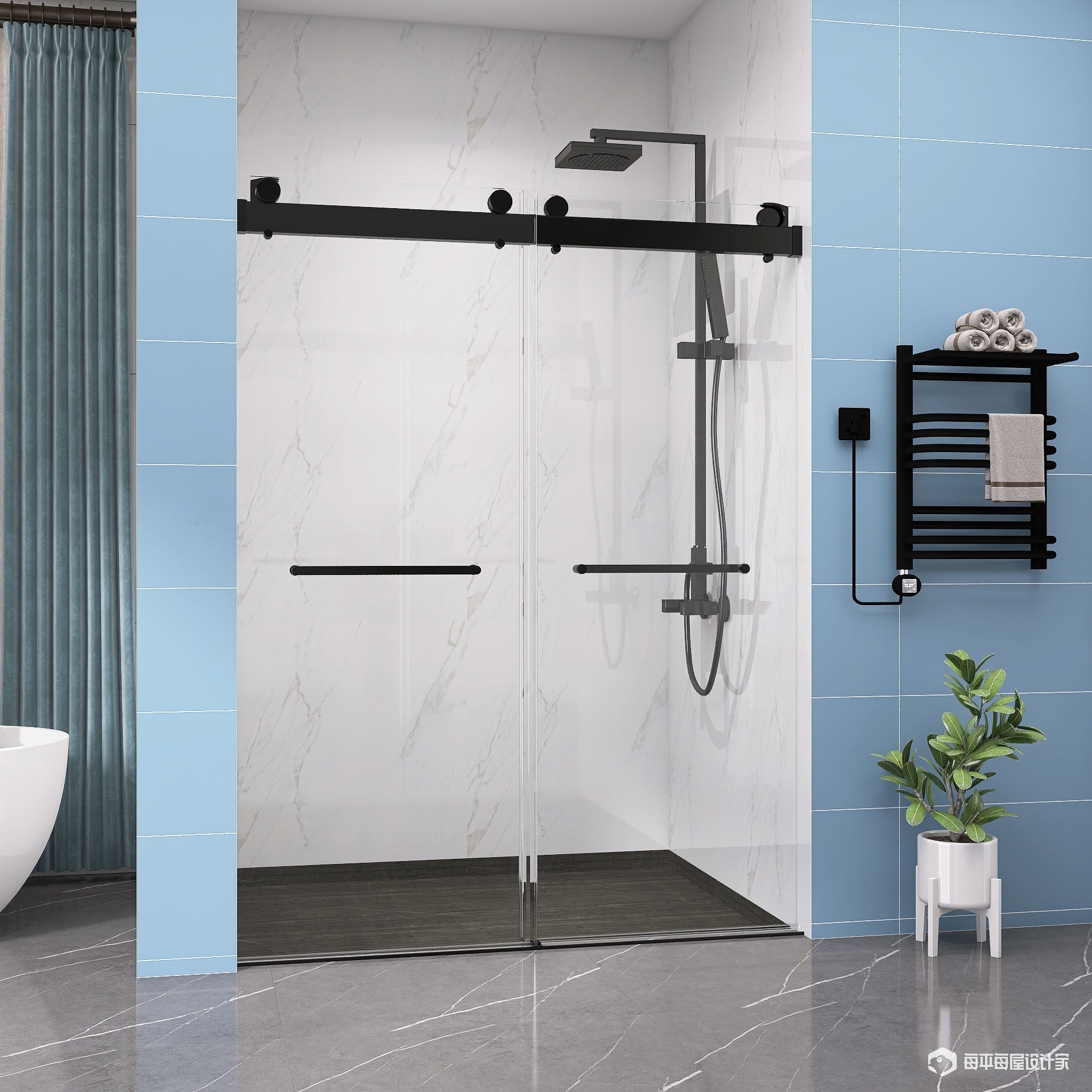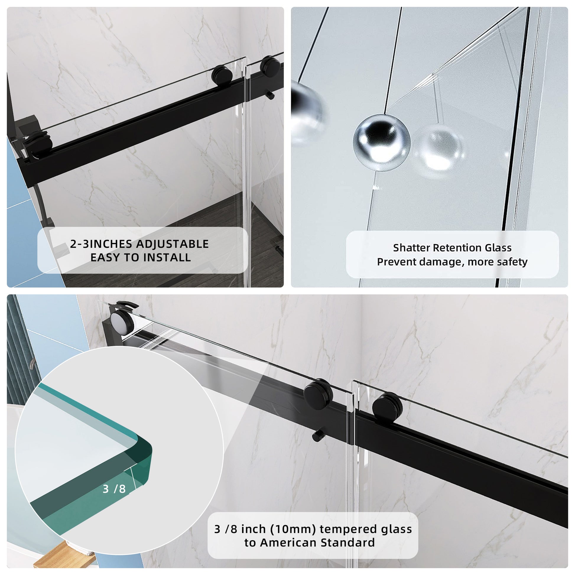 This frameless double sliding shower door features 10mm EN12150 certified tempered safety glass with a height of 2000mm, ensuring durability and safety. The double sliding door design has no bottom track and includes an anti-collision device for smooth and secure use. The track is made of high-quality aluminum, and the stainless steel handle provides long-lasting strength with a sleek look. Measuring 60 inches wide and 79 inches high, it comes in a matte black finish that is stylish and corrosion-resistant. The product is packaged with pallet packing for safe and secure transportation.