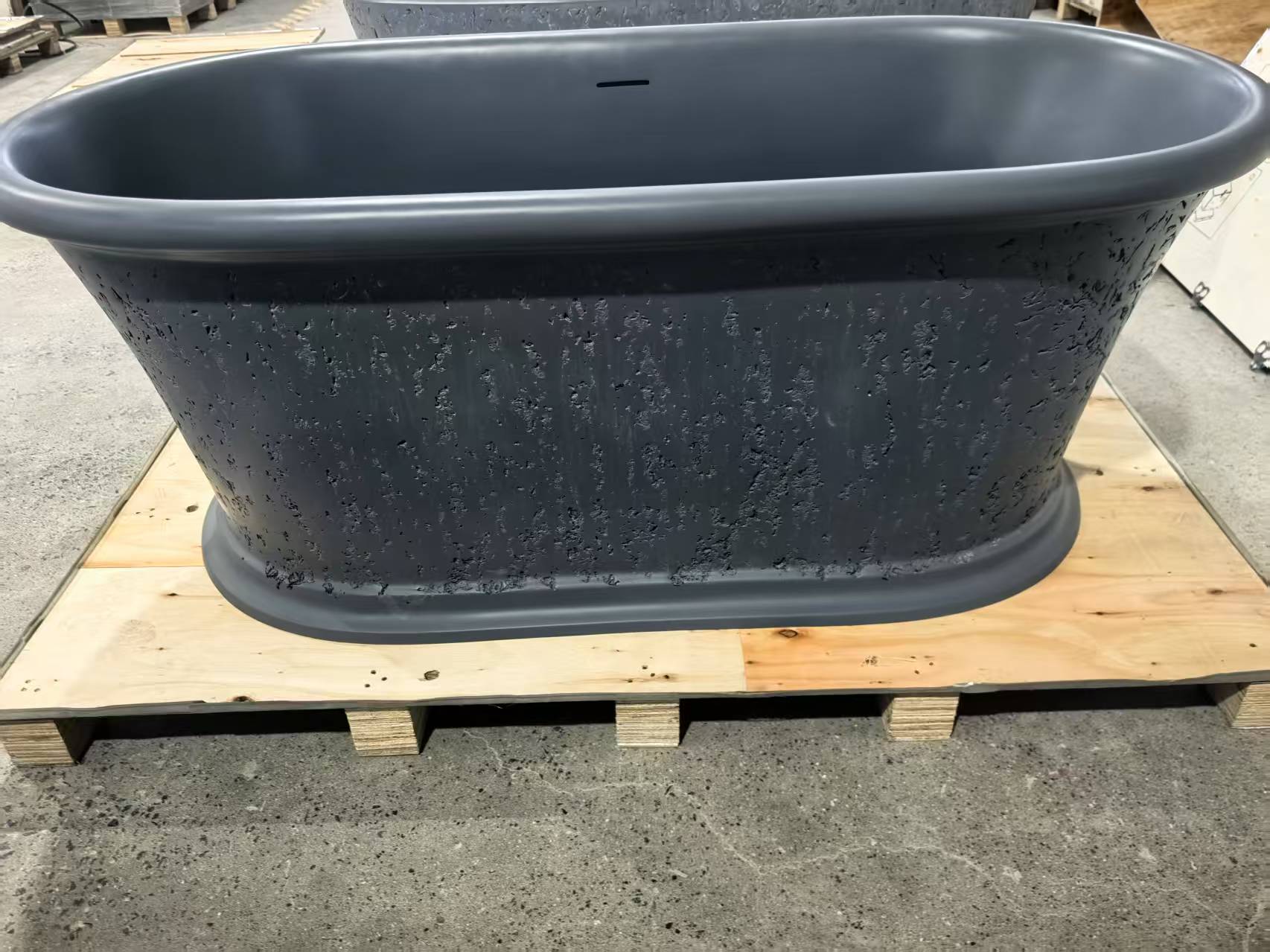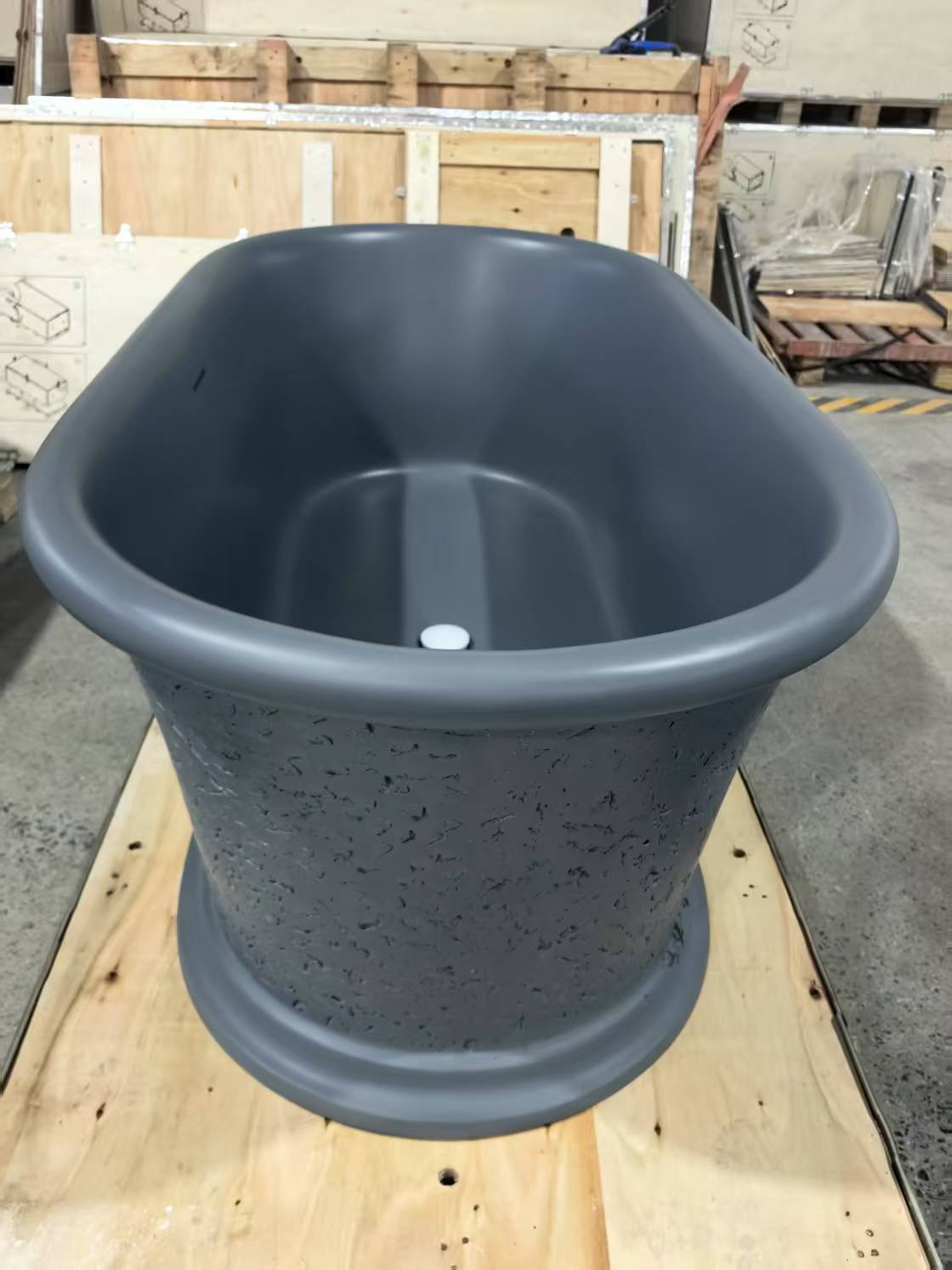 This 61-inch oval matte cement-dotted artificial stone freestanding soaking tub is designed for deep relaxation, offering a spacious and comfortable bathing experience. Its unique cement texture and antique natural stone appearance create a timeless and rustic charm. Crafted from durable resin stone, the tub combines strength with a smooth and luxurious surface. It is repairable, as minor scratches or stubborn stains can be easily removed with sanding, and even severe damage can be restored through polishing. The upgraded overflow and drainage system ensures the best bathing experience, featuring a detachable solid brass pop-up drain with silicone gasket sealing for durability and water resistance, along with a flexible PVC drain hose that is convenient to use and prevents clogging. With a ten-year anti-yellowing guarantee and cUPC certification, this bathtub perfectly blends aesthetics, functionality, and safety, making it an ideal choice for your bathroom.