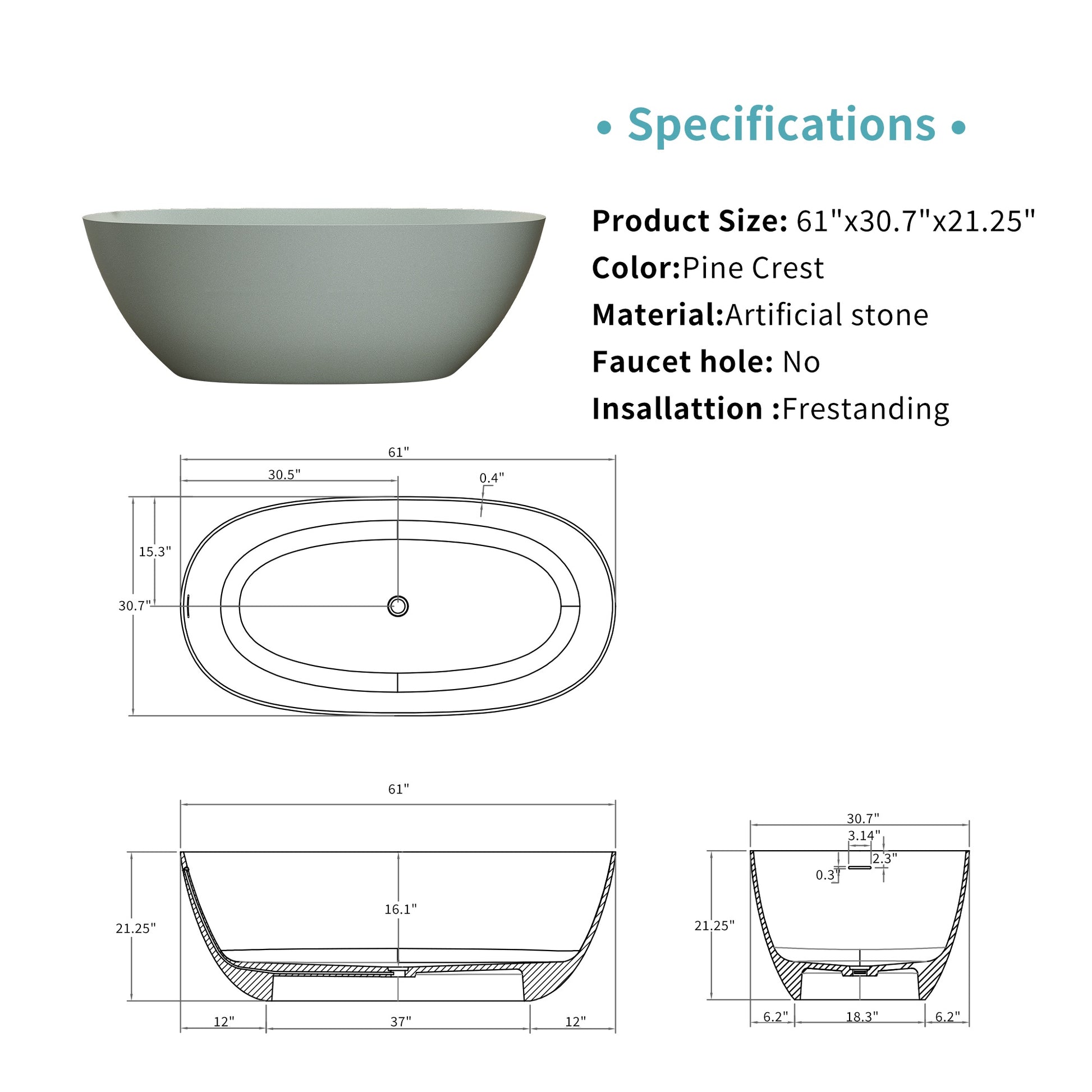 61 Inches Freestanding Soaking Bathtub Solid Surface Resin Stone Turquoise Green Modern Tub with Overflow and Pop-up Drain