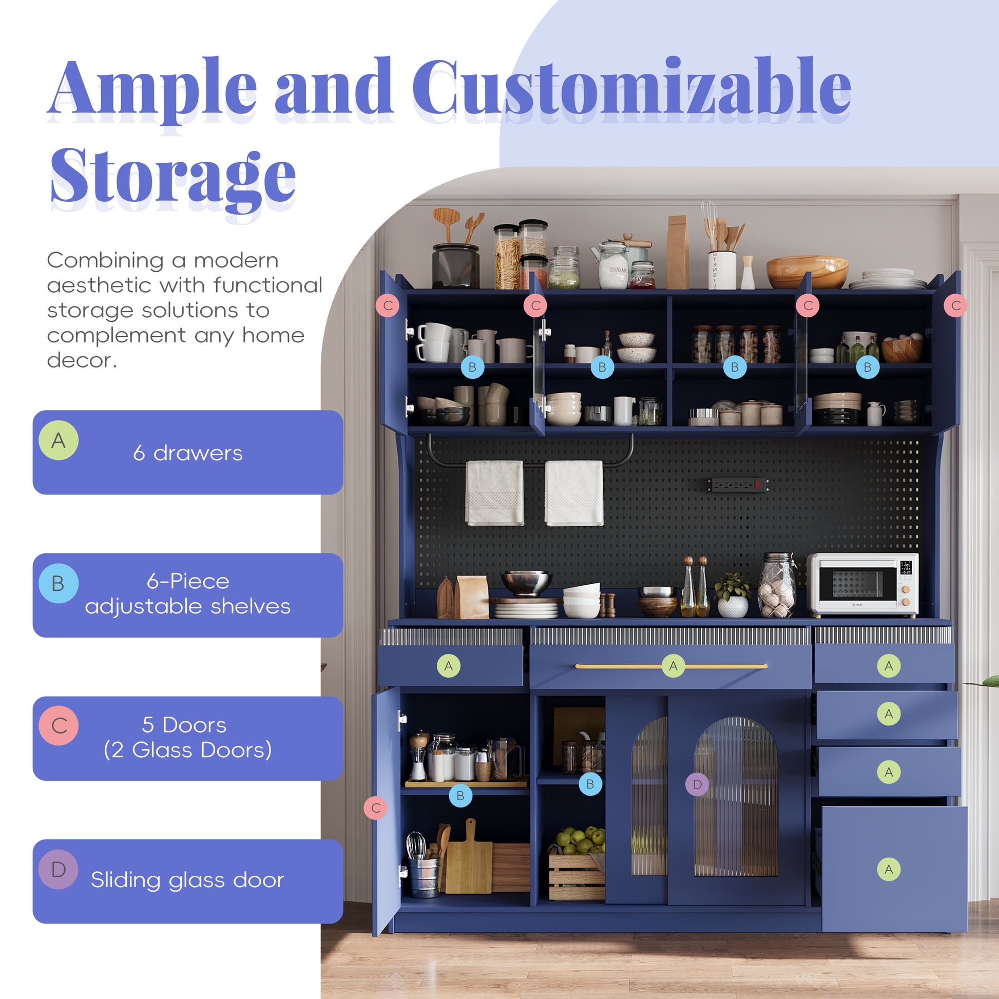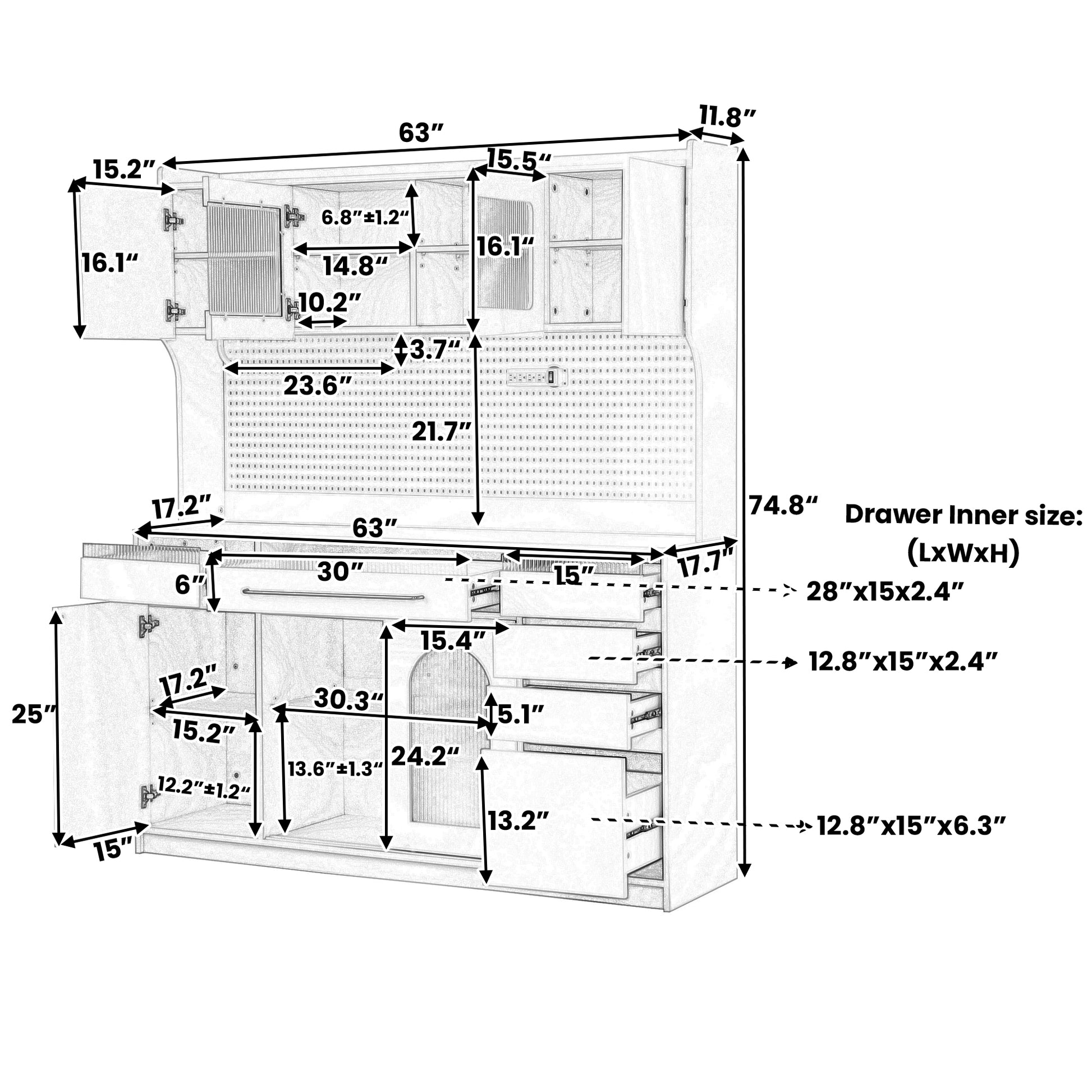 This 63 inch wide freestanding buffet with hutch offers an upgraded large capacity design, featuring expanded height and width for enhanced storage compared with typical 47 inch models. The integrated structure includes six drawers, five cabinets with adjustable shelves, and a wide countertop suitable for kitchen appliances or a full coffee bar setup. Thoughtful features such as a built in power outlet, towel rack, and pegboard provide organized and convenient storage for daily use. Crafted from durable MDF with anti tipping devices included, this cabinet delivers reliable stability and long term performance. The assembly video and clear manual ensure a smooth installation experience.