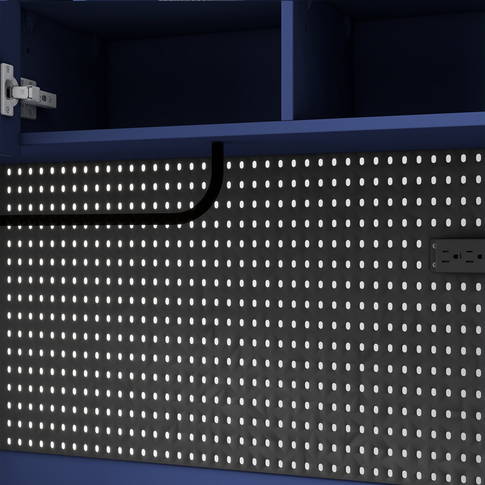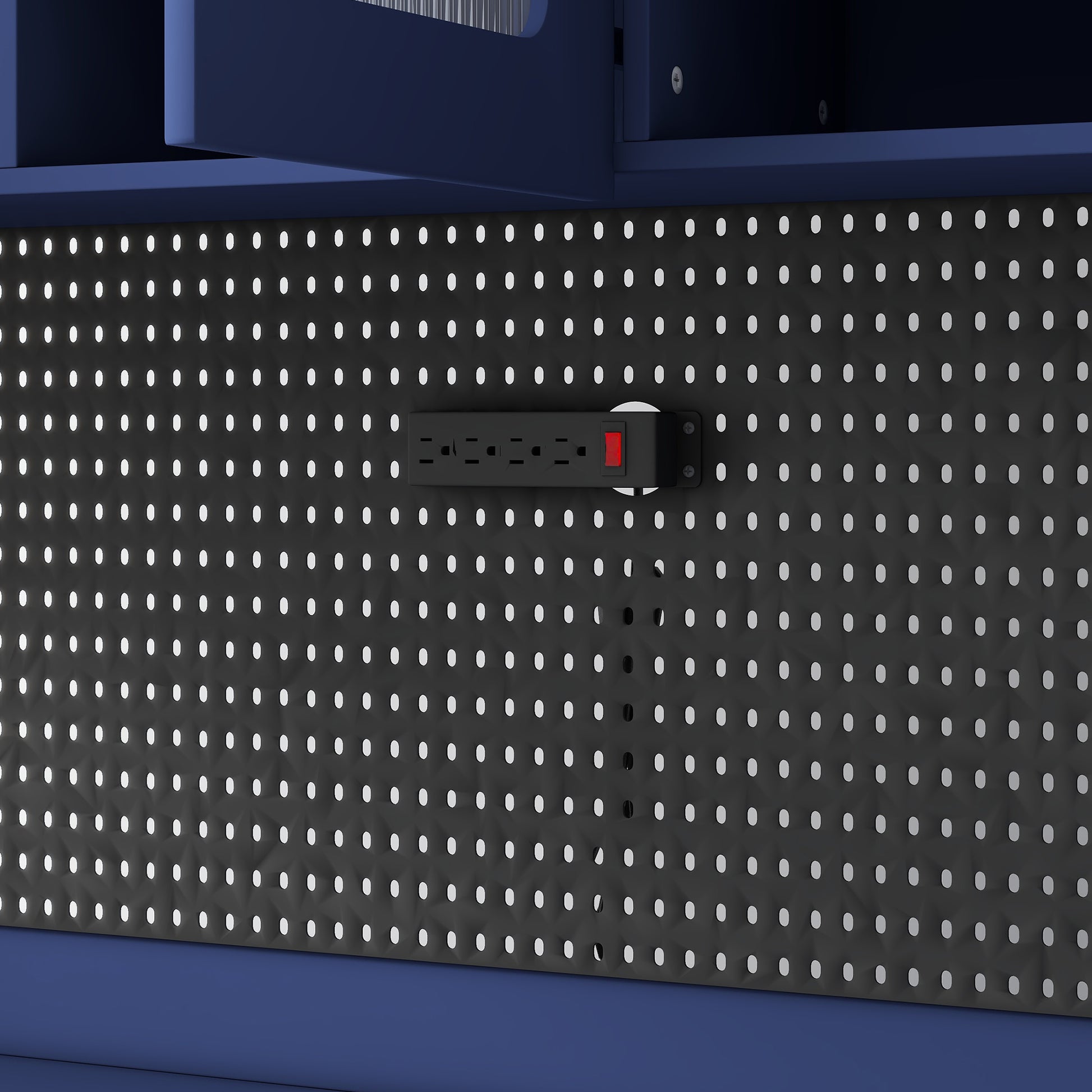 Power outlet, towel rack, and pegboard improve convenience for appliances and daily tools.