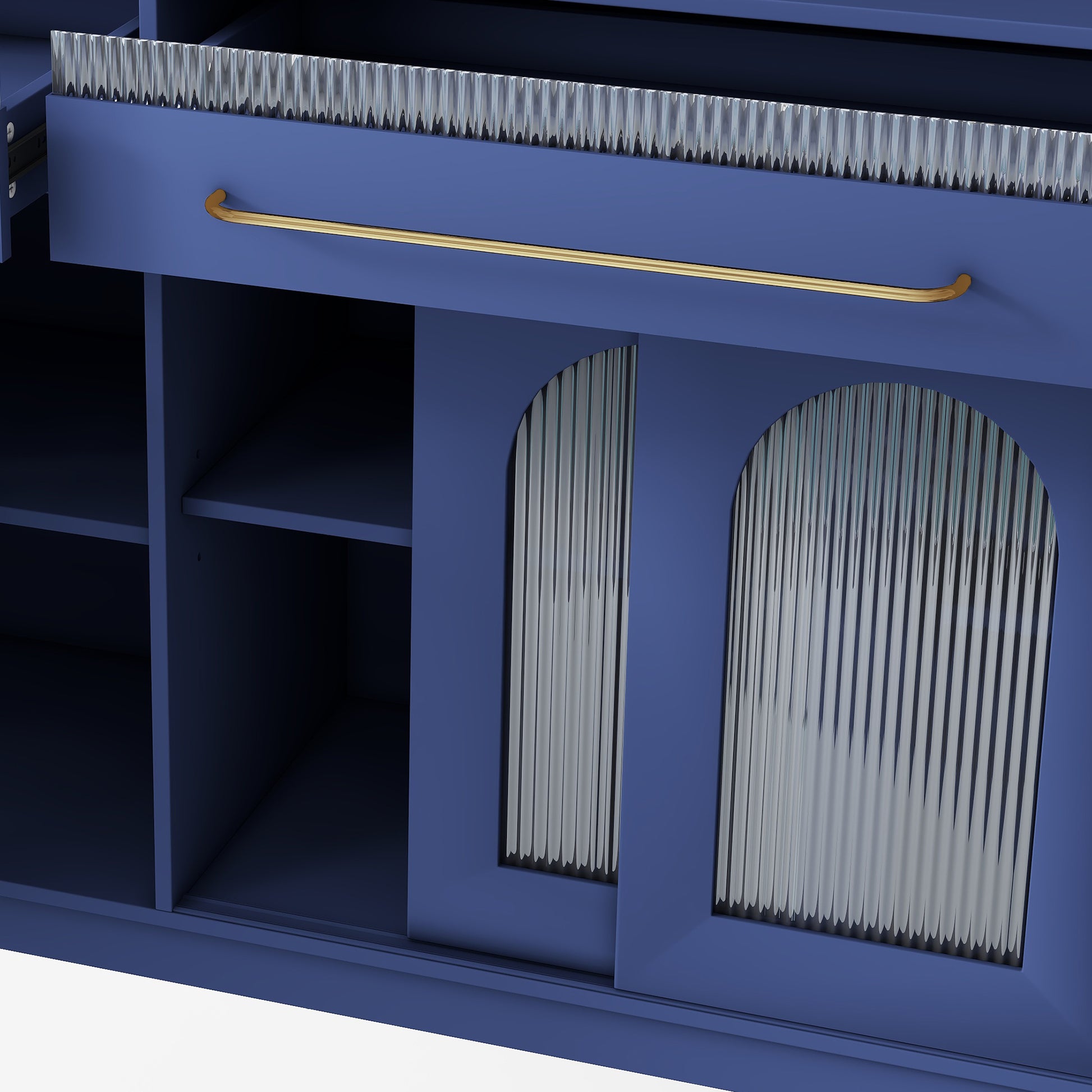 Upper glass doors offer elegant display space while lower sliding glass doors provide easy access.