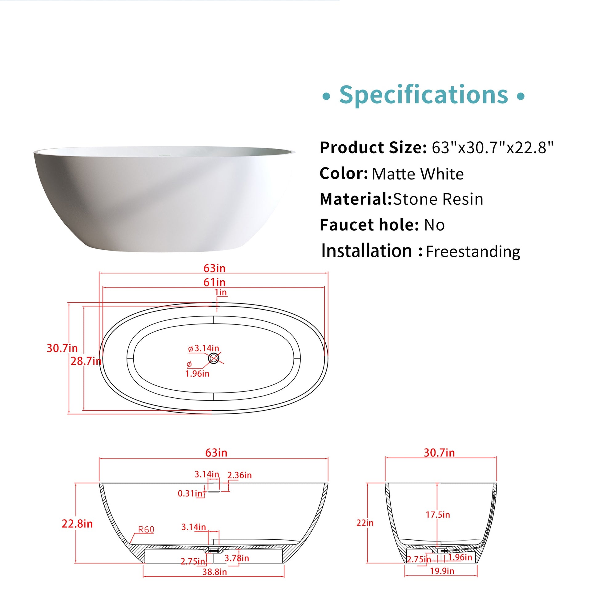 Enjoy spacious relaxing baths with this 63 Inch matte white freestanding stone resin tub thick edge ergonomic non permeable easy to clean install stable 282 pounds