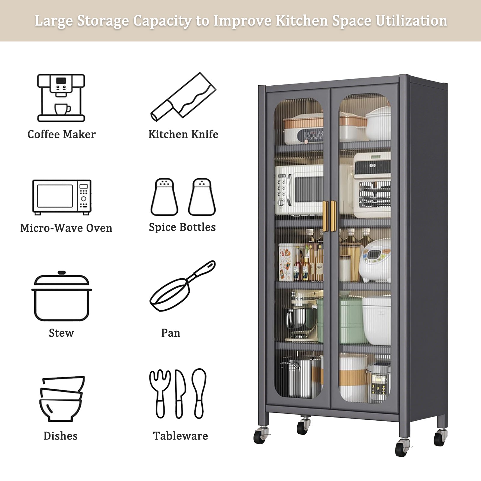 This 65 inch metal pantry cabinet features a durable carbon steel frame that provides stable, long lasting storage for kitchen appliances, tableware, and daily essentials. The transparent double doors allow you to view items clearly at a glance, making organization and access more efficient. Equipped with adjustable shelves and four universal wheels, the cabinet offers both flexible storage and easy mobility. Its modern design makes it suitable for kitchens, dining rooms, living rooms, or office spaces.