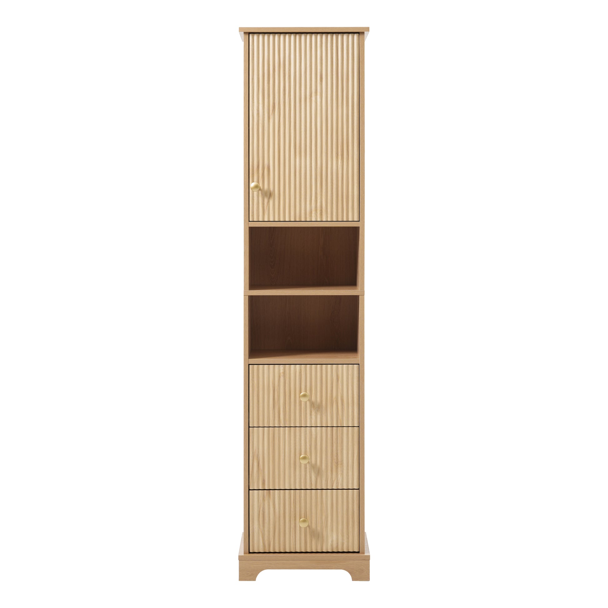 67.7 Inch Tall Freestanding Bathroom Cabinet with Door Adjustable Shelf 3 Drawers and Open Storage Wood Finish with Gold Handles