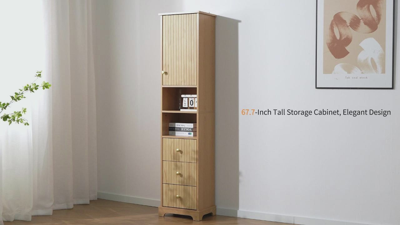 Tall and slim at 67.7 inches high, this cabinet maximizes storage without taking up extra floor space.