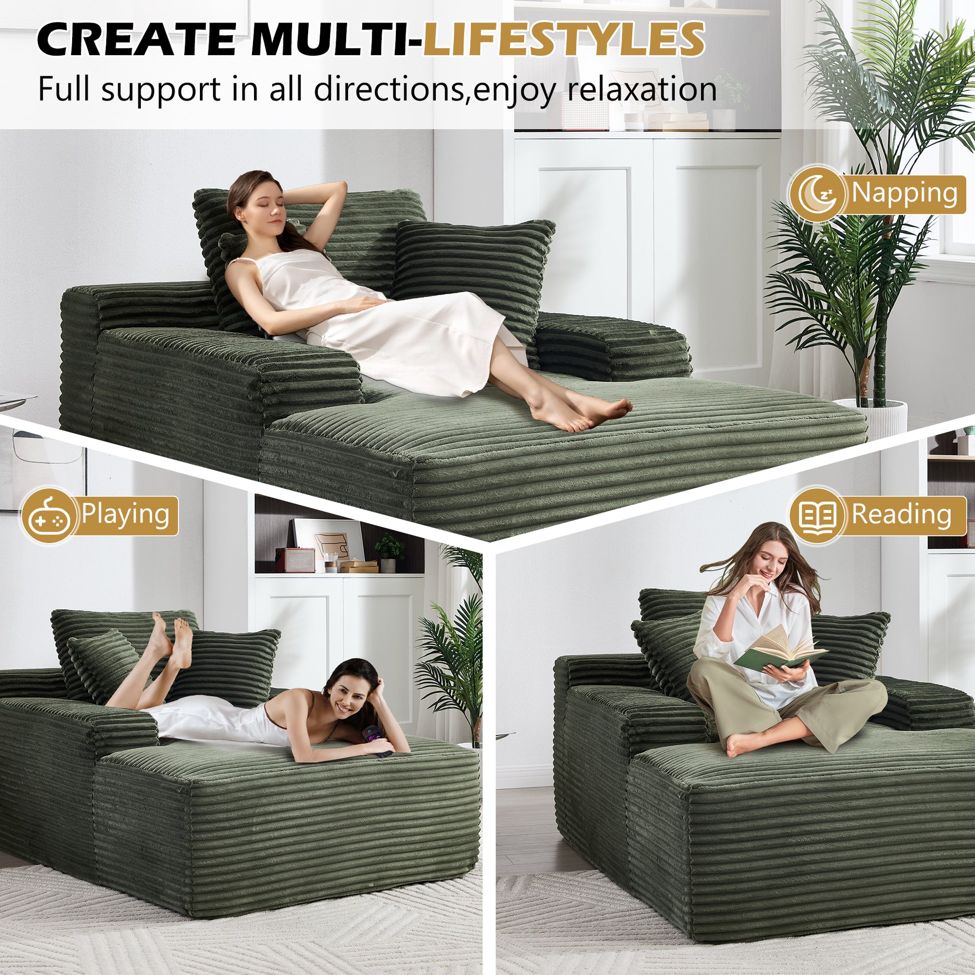 67 in. Chaise Lounge Chair 9.9 in. Wide Armrest Indoor Corduroy Oversized Sleeper Sofa for Living Room Deep Seat Lounge and Three Soft Pillows Convertible Boneless Sofa Bed, Green, No Assembly Required