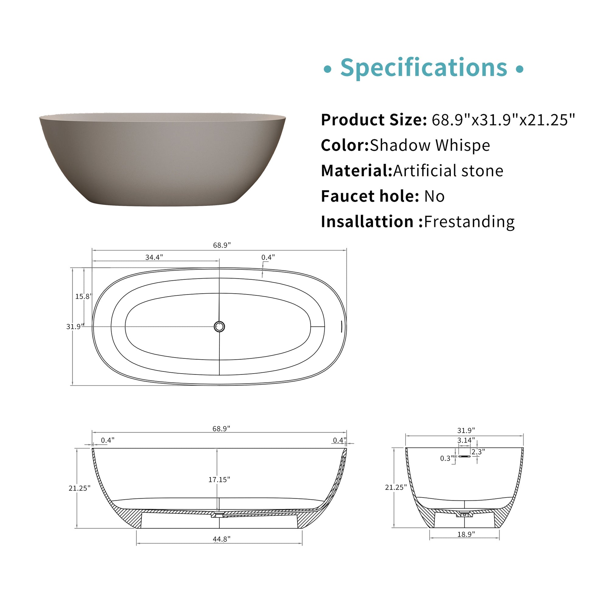 After a long tiring day, immerse yourself in this 69 inch beige freestanding soaking tub to relax. Its solid surface resin stone material has slow heat dissipation and no obvious cold sensation, while the ergonomic curve fits your waist perfectly. The smooth hand-polished surface and simple installation make it a high-quality choice for modern bathrooms.