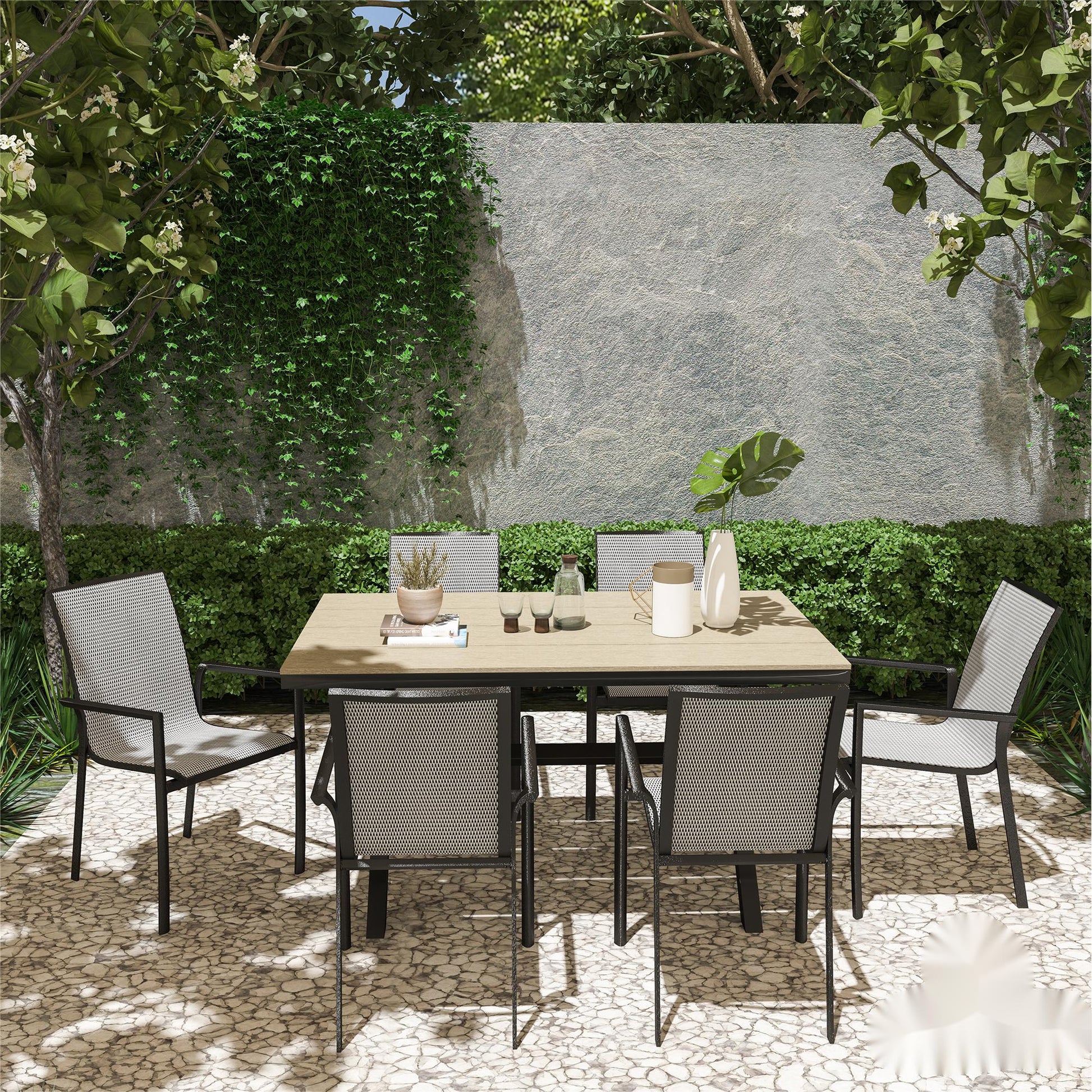 This outdoor dining chair set consists of 6 chairs and a rectangular dining table. The frame surface is powder-coated for durability. Perfect for indoor or outdoor activities. This set of outdoor dining chairs will provide you with a relaxed environment where you can enjoy coffee or tea with friends or family.