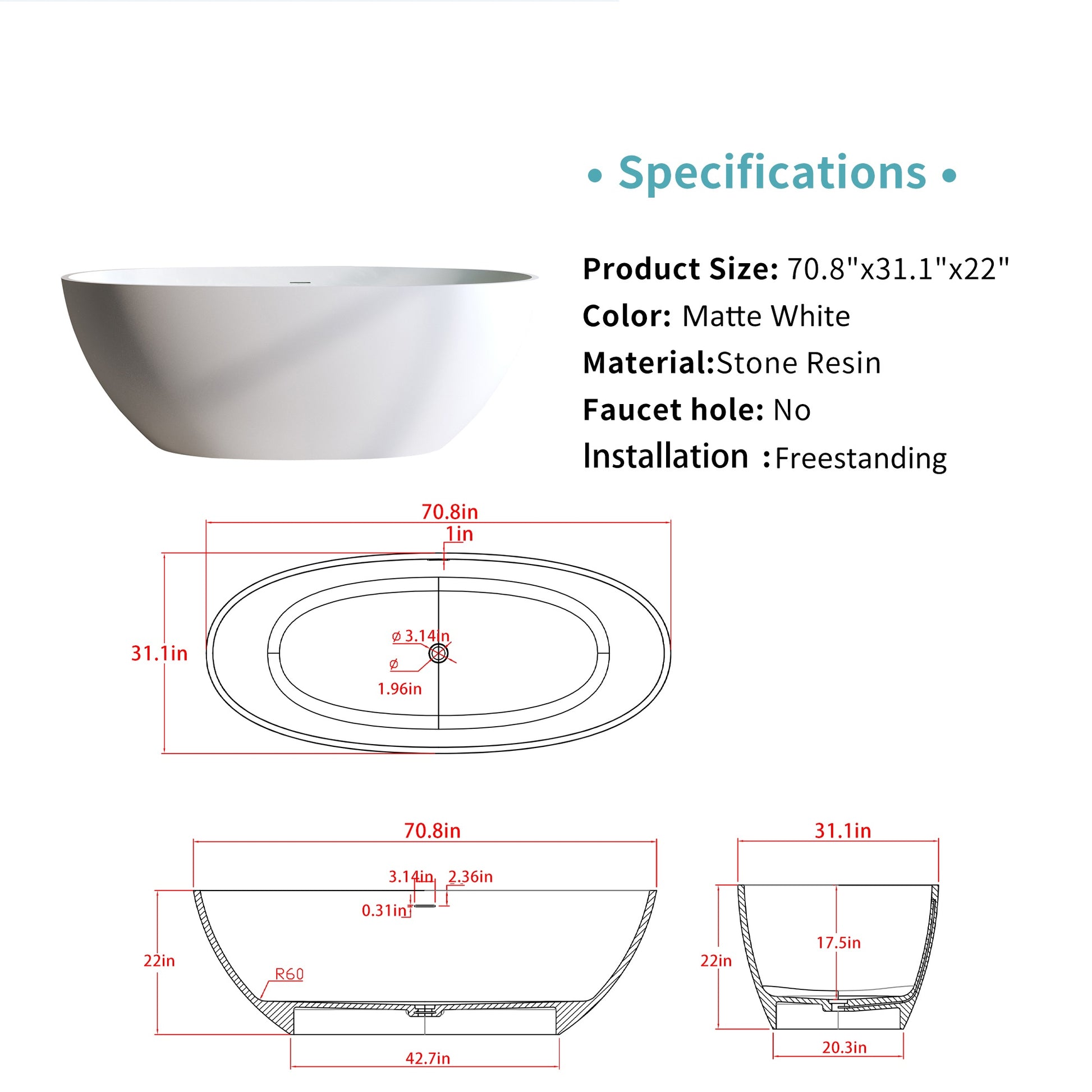 Relax in spacious luxury with this 70.8 Inch matte white freestanding stone resin tub thick edge ergonomic non permeable easy to clean install stable 282lbs