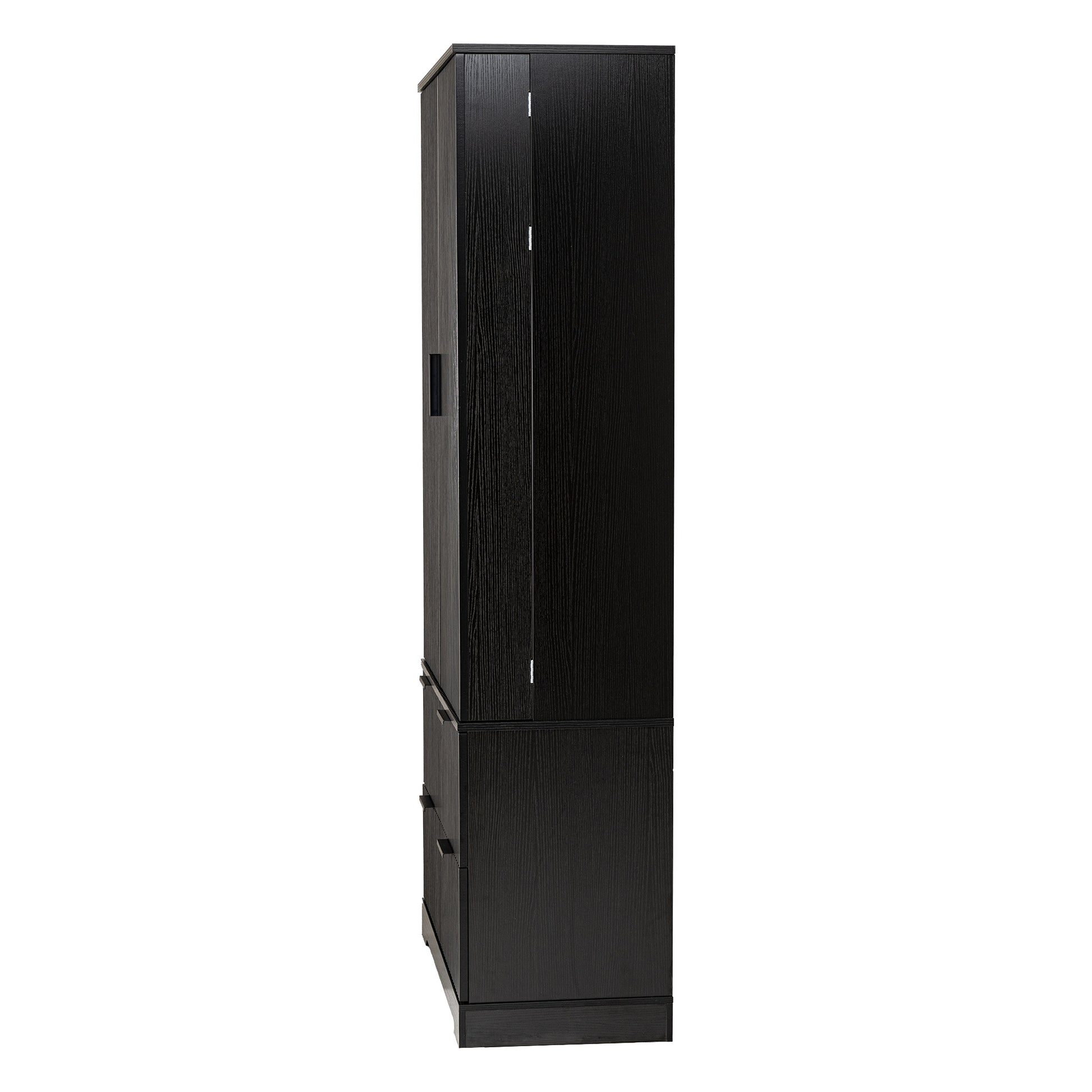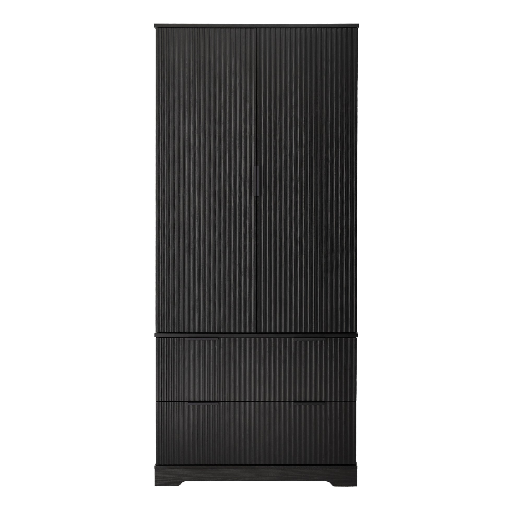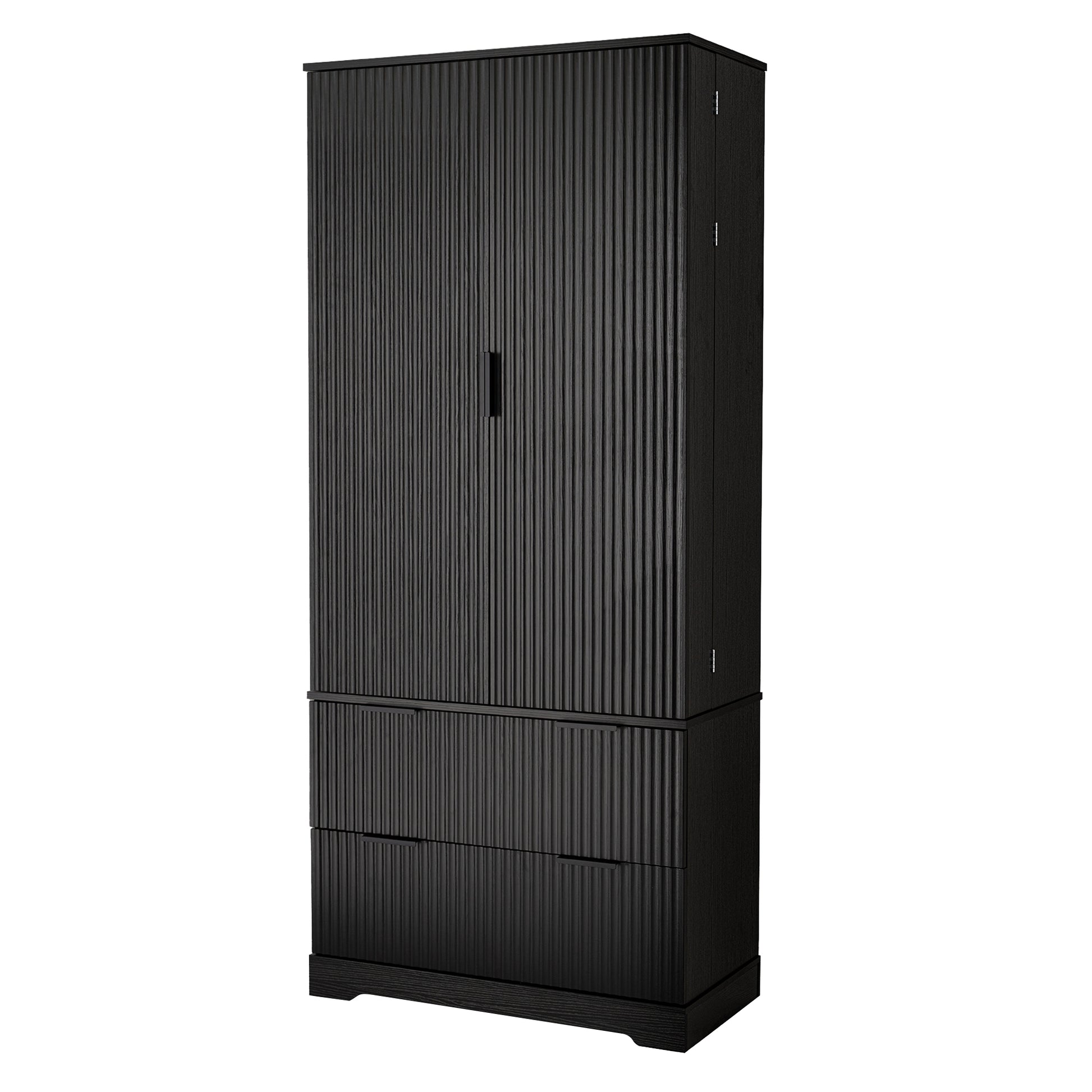 This 72 inch modern pantry cabinet brings a refined French inspired look to kitchens, dining rooms, entryways, and home offices. Designed with elegant fluted doors and a sleek black finish, it blends vintage charm with contemporary functionality. The cabinet includes three upper shelves, two deep lower drawers, and built in spice rack storage on both doors, providing flexible organization for dishes, appliances, condiments, and daily essentials. Made from high quality MDF with a smooth protective finish, the surface resists stains, fingerprints, and moisture for easy everyday maintenance. Both stylish and practical, this freestanding storage piece elevates home organization in any room.