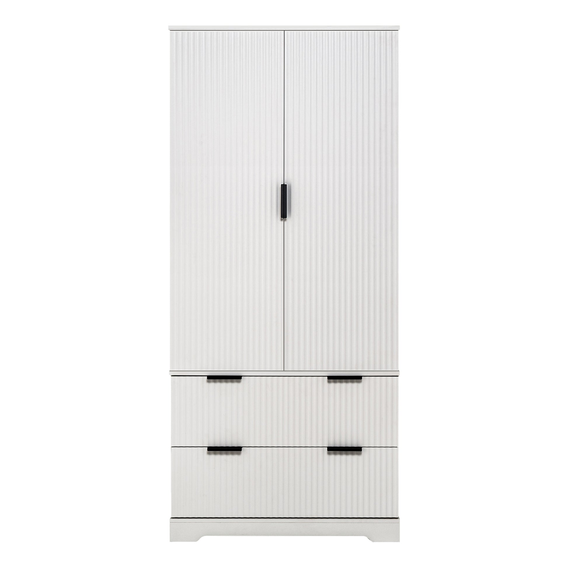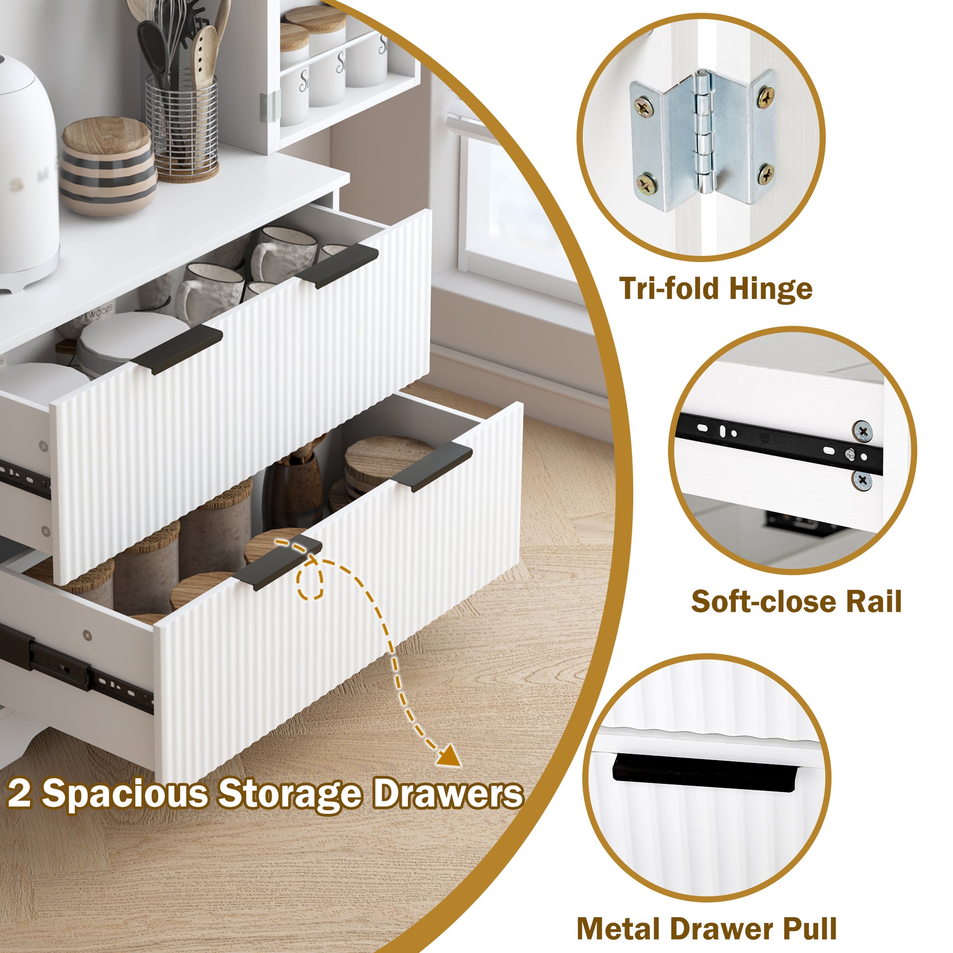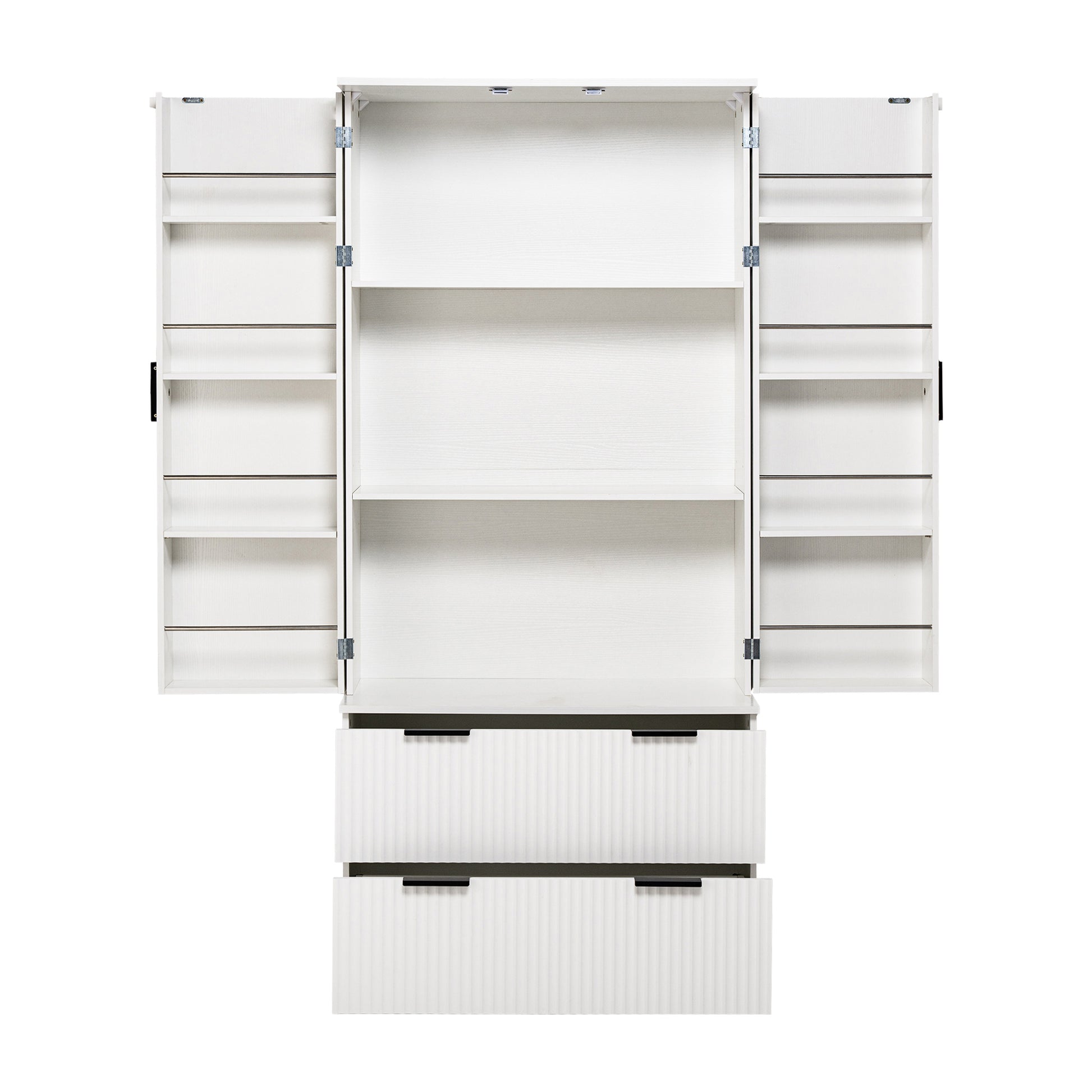 This 72 inch modern pantry cabinet features an elegant French inspired refrigerator style design with clean fluted textures and a bright white finish. Its tall structure includes three upper shelves, two large lower drawers, and built in spice rack storage on both doors, providing efficient organization for kitchen supplies, condiments, and daily household items. Made from sturdy MDF with smooth metal handles, the cabinet offers long lasting durability and easy cleaning. Combining both style and practicality, this freestanding storage unit enhances kitchens, dining rooms, entryways, and bathrooms with refined and functional organization.
