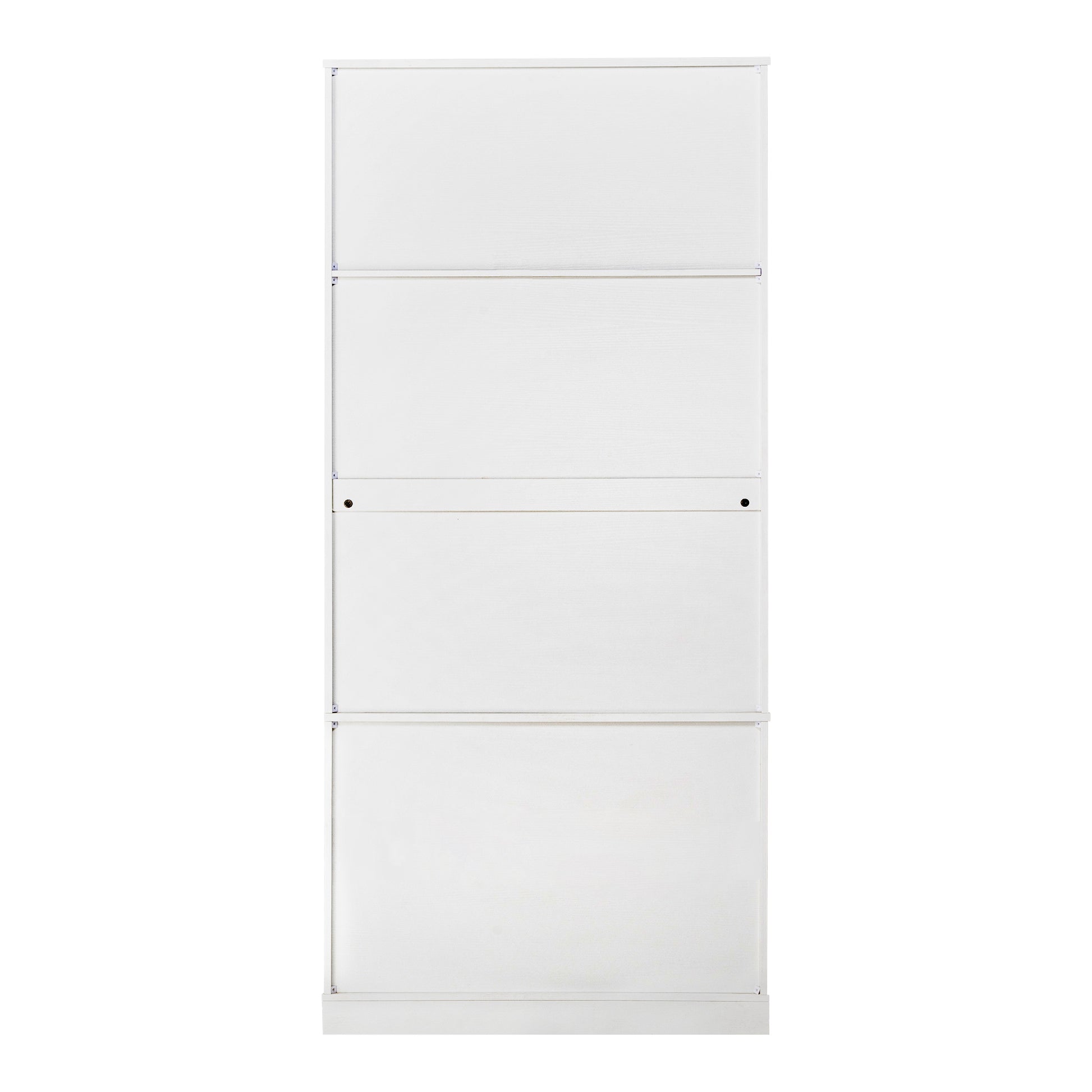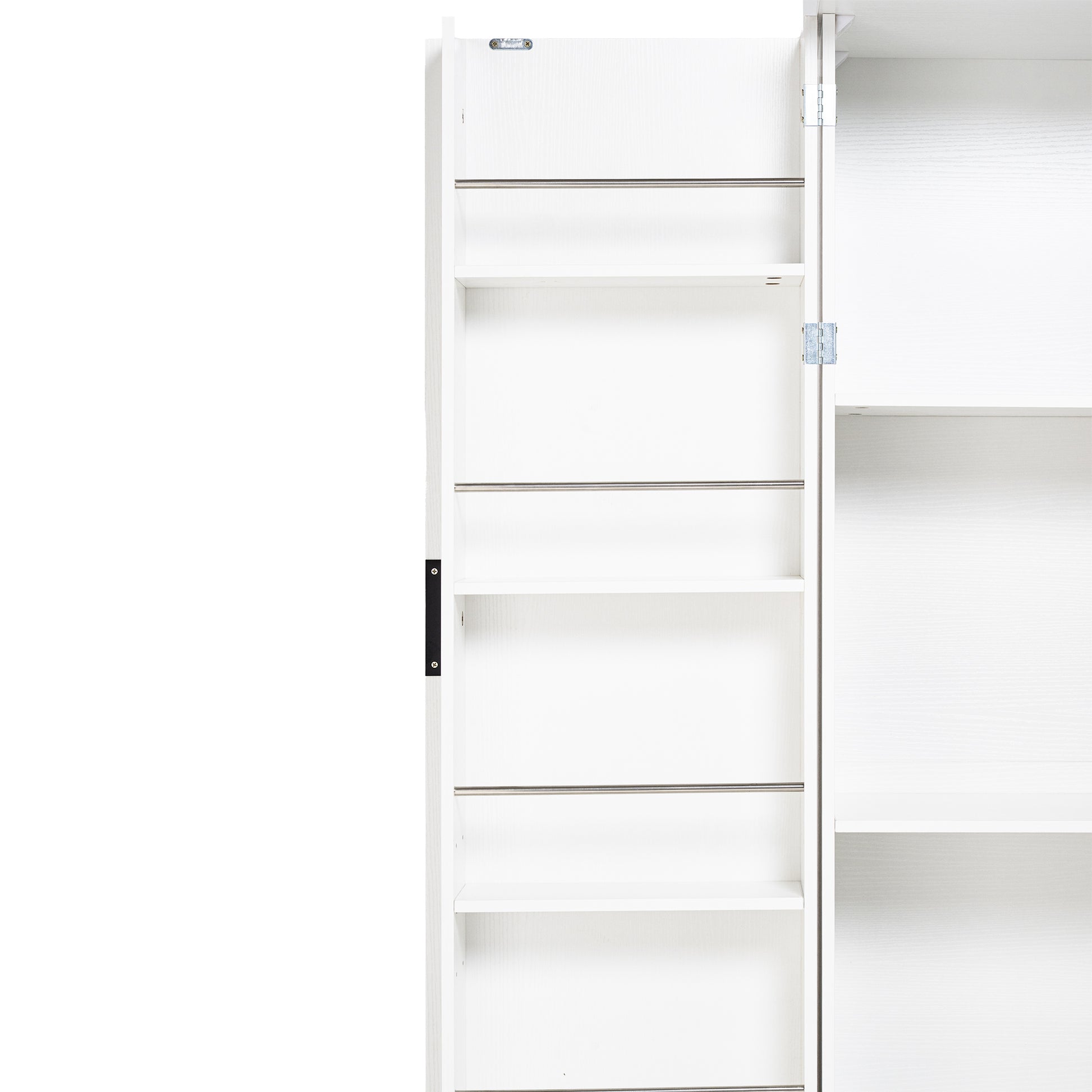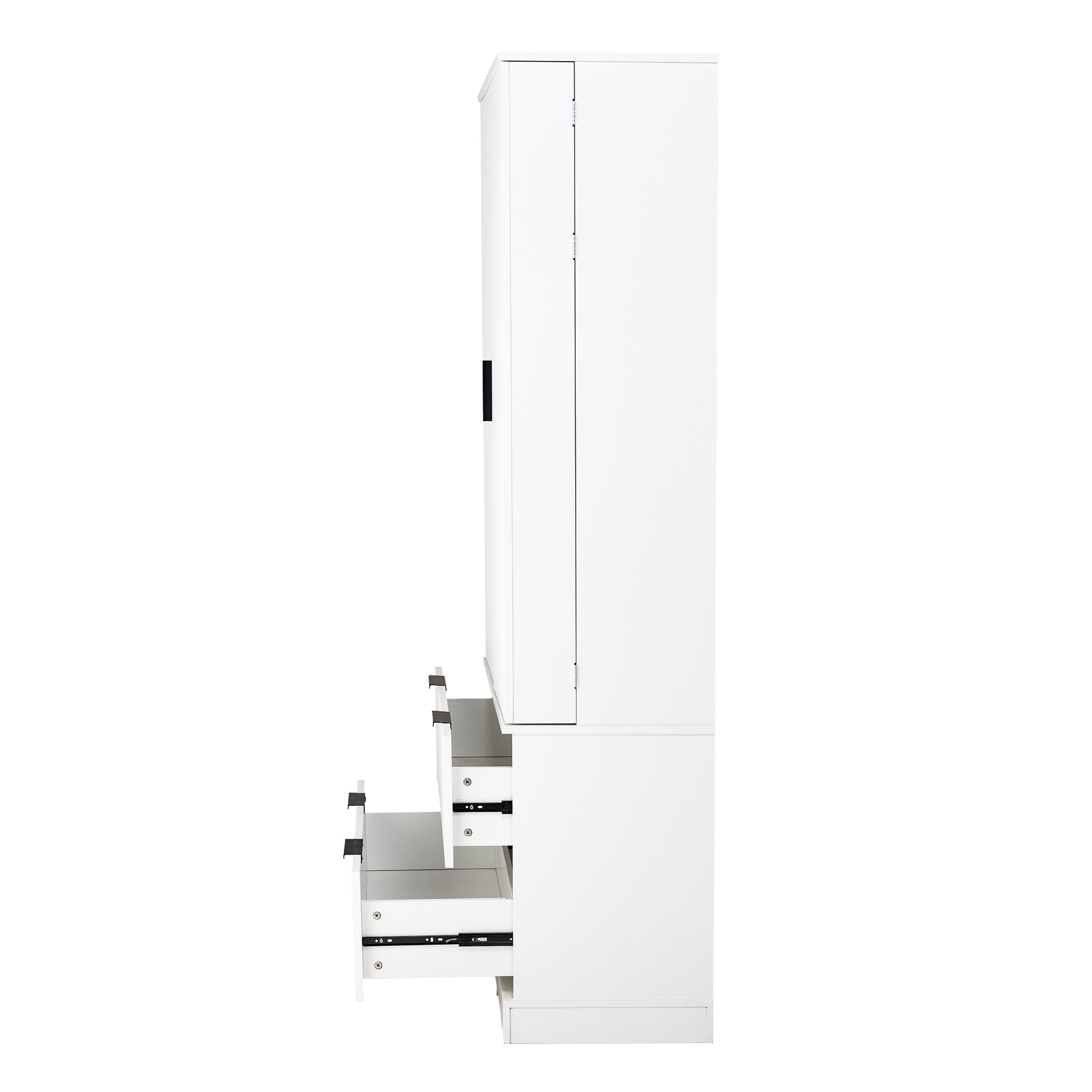 This 72 inch modern pantry cabinet features an elegant French inspired refrigerator style design with clean fluted textures and a bright white finish. Its tall structure includes three upper shelves, two large lower drawers, and built in spice rack storage on both doors, providing efficient organization for kitchen supplies, condiments, and daily household items. Made from sturdy MDF with smooth metal handles, the cabinet offers long lasting durability and easy cleaning. Combining both style and practicality, this freestanding storage unit enhances kitchens, dining rooms, entryways, and bathrooms with refined and functional organization.