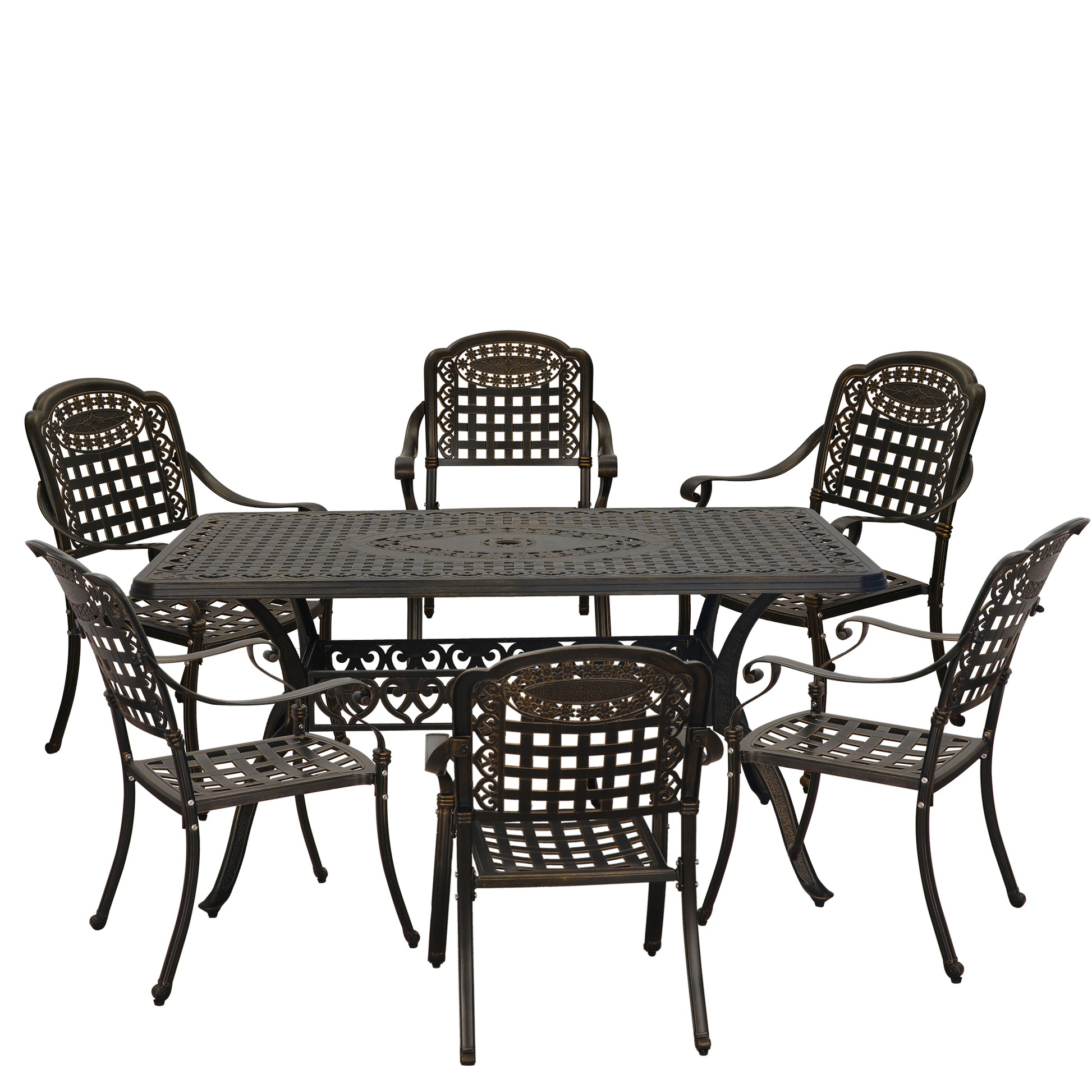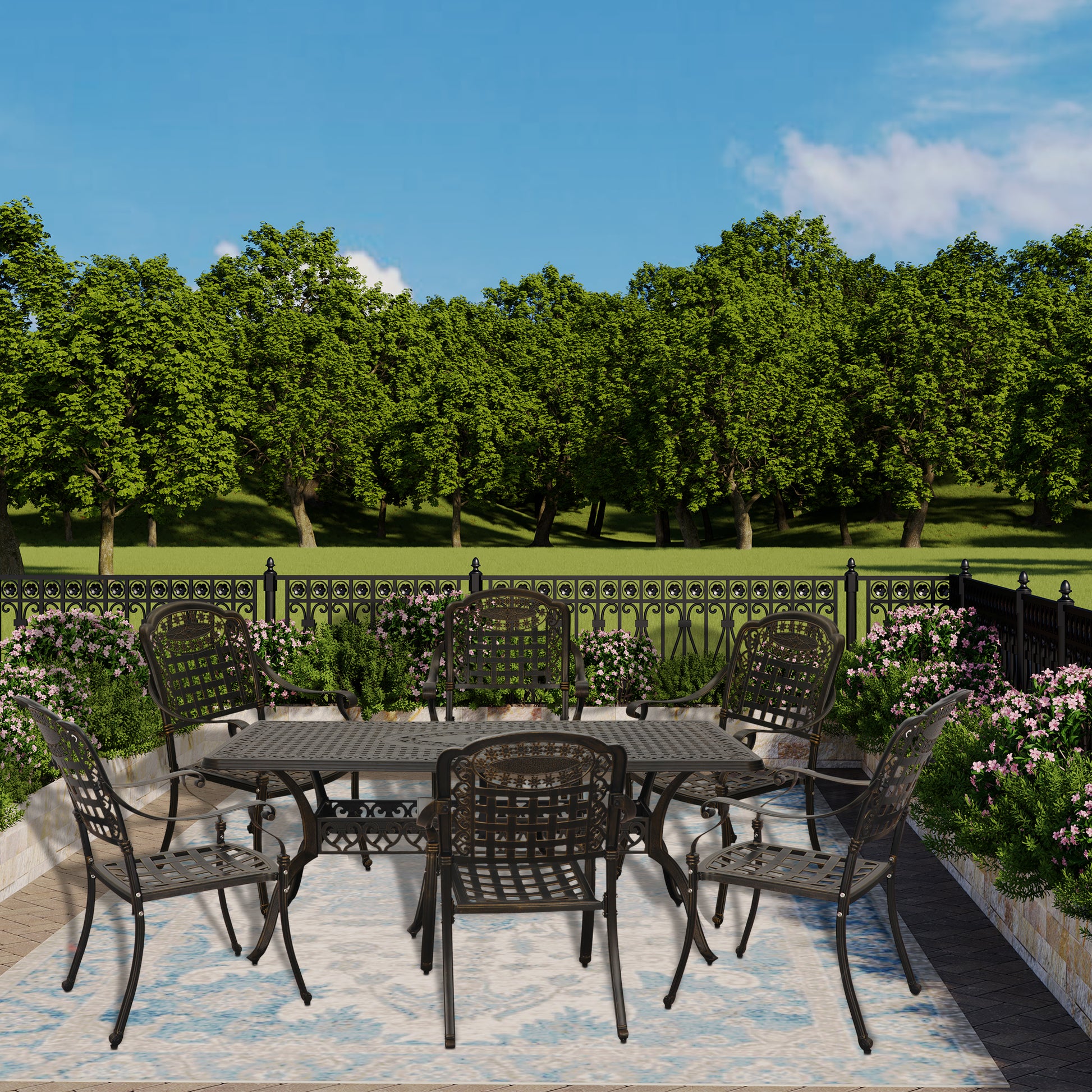This 7pcs outdoor dining set includes 6 dining chairs and a 59 inchesx35 inches dining table, which can accommodate 6 people at the same time. The rust-proof cast aluminum with bronze appearance protects it from weather factors, making this dining table an excellent choice for outdoor leisure and dining.Cast aluminum material, waterproof and rust-proof, all-weather use, durable.Adopts hollow grid and exquisite pattern design appearance, beautiful and generous.Light weight, convenient to move and store, good in drainage and easy to maintain and clean.Adjustable non-slip foot pad, suitable for different terrain, stable and not shaking.Includes 6 patio dining chairs and a 59 inchesx35 inches rectangular table for 6 people.