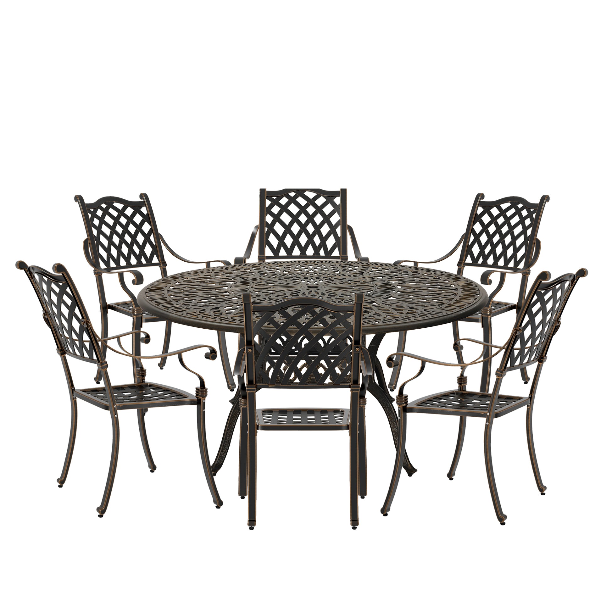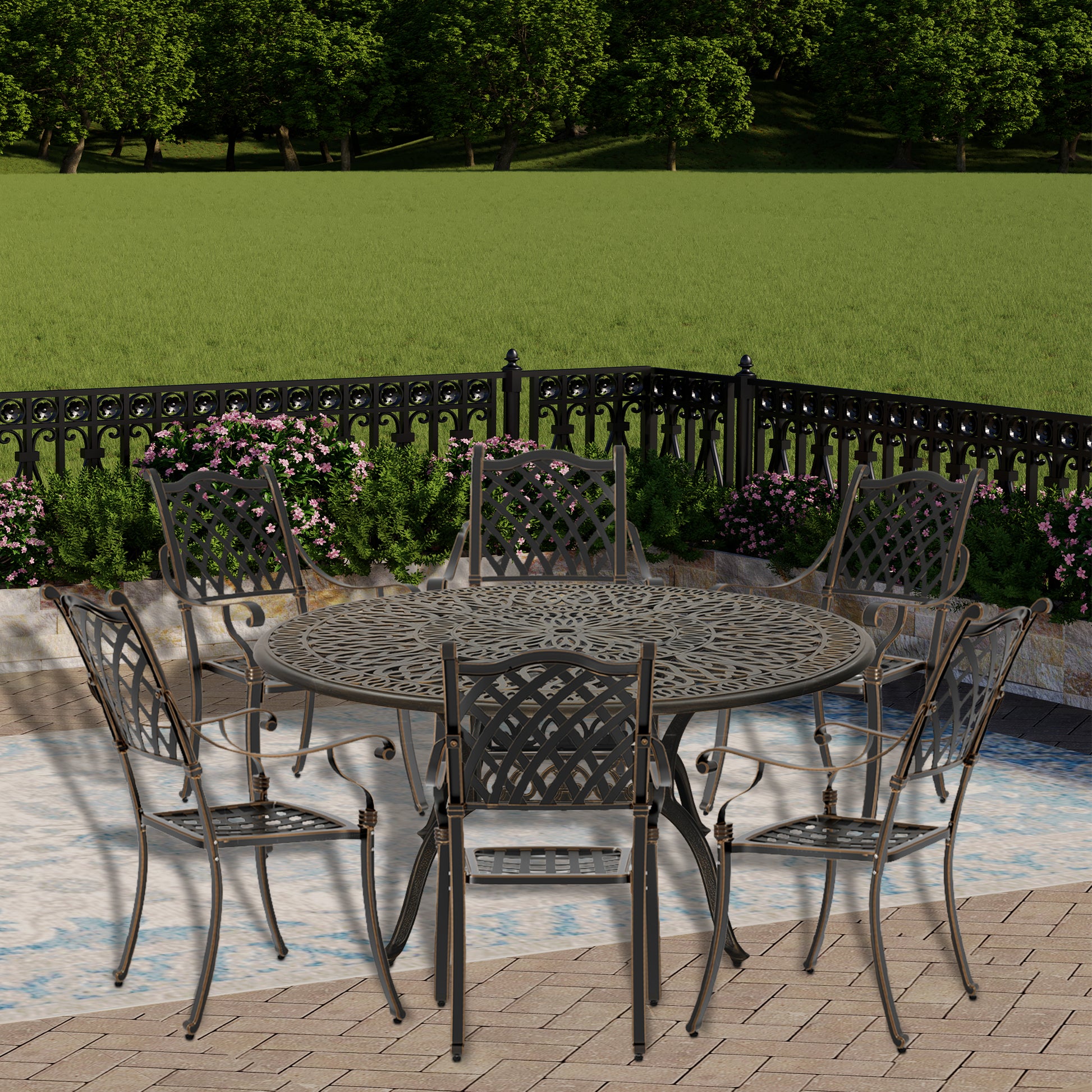 This 7pcs outdoor dining set includes 6 dining chairs and a 59 inches round dining table, which can accommodate 6 people at the same time. The rust-proof cast aluminum with bronze appearance protects it from weather factors, making this dining table an excellent choice for outdoor leisure and dining.Cast aluminum material, waterproof and rust-proof, all-weather use, durable.Adopts hollow grid and exquisite pattern design appearance, beautiful and generous.Light weight, convenient to move and store, good in drainage and easy to maintain and clean.Adjustable non-slip foot pad, suitable for different terrain, stable and not shaking.Includes 6 patio dining chairs and a 59-inch round table for 6 people.