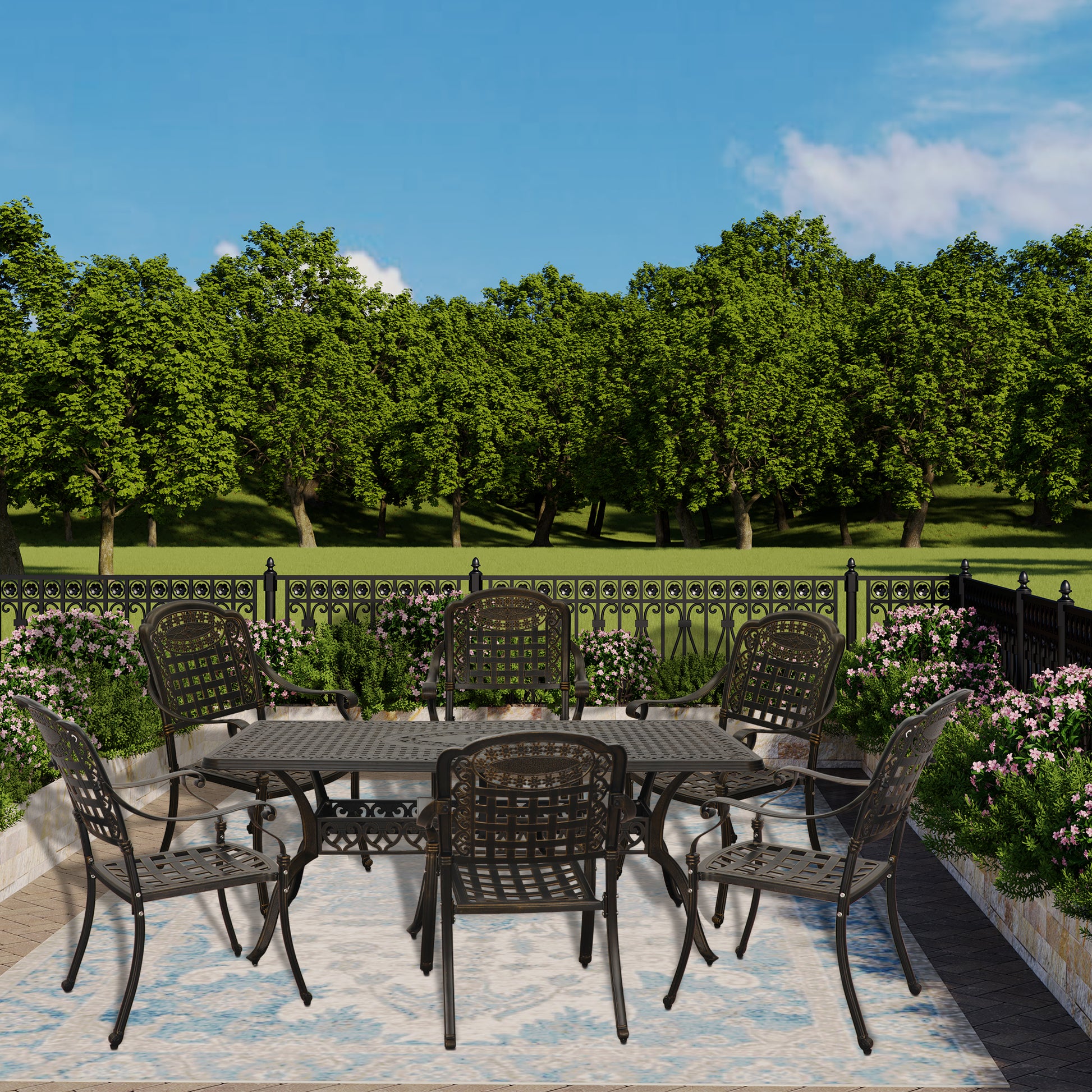 This 7pcs outdoor dining set includes 6 dining chairs and a 71 inchesx37 inches dining table, which can accommodate 6-8 people at the same time. The rust-proof cast aluminum with bronze appearance protects it from weather factors, making this dining table an excellent choice for outdoor leisure and dining.Cast aluminum material, waterproof and rust-proof, all-weather use, durable.Adopts hollow grid and exquisite pattern design appearance, beautiful and generous.Light weight, convenient to move and store, good in drainage and easy to maintain and clean.Adjustable non-slip foot pad, suitable for different terrain, stable and not shaking.Includes 6 patio dining chairs and a 71 inchesx37 inches rectangular table for 6-8 people.