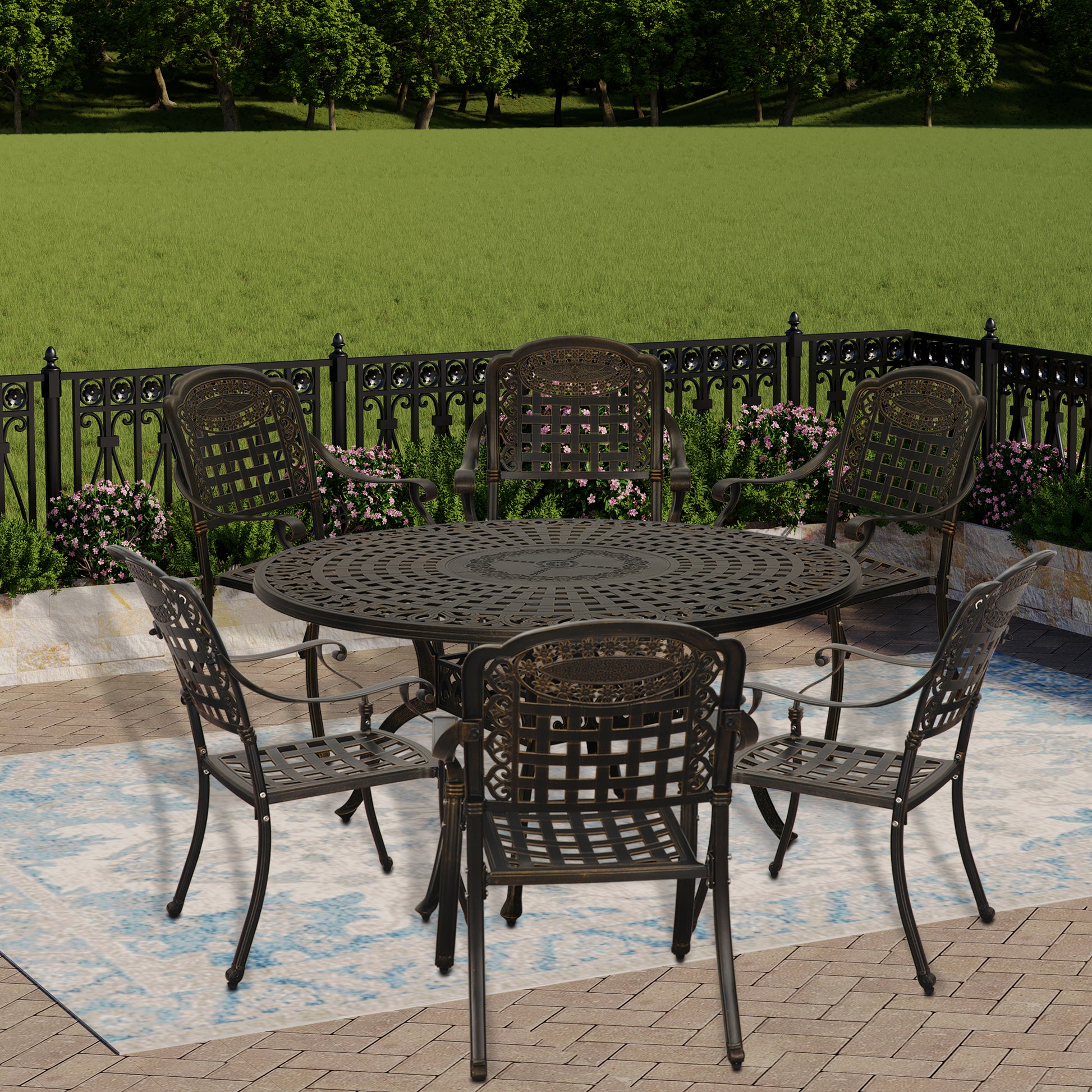 This 7pcs outdoor dining set includes 6 dining chairs and a 59 inches round dining table, which can accommodate 6 people at the same time. The rust-proof cast aluminum with bronze appearance protects it from weather factors, making this dining table an excellent choice for outdoor leisure and dining.Cast aluminum material, waterproof and rust-proof, all-weather use, durable.Adopts hollow grid and exquisite pattern design appearance, beautiful and generous.Light weight, convenient to move and store, good in drainage and easy to maintain and clean.Adjustable non-slip foot pad, suitable for different terrain, stable and not shaking.Includes 6 patio dining chairs and a 59-inch round table for 6 people.