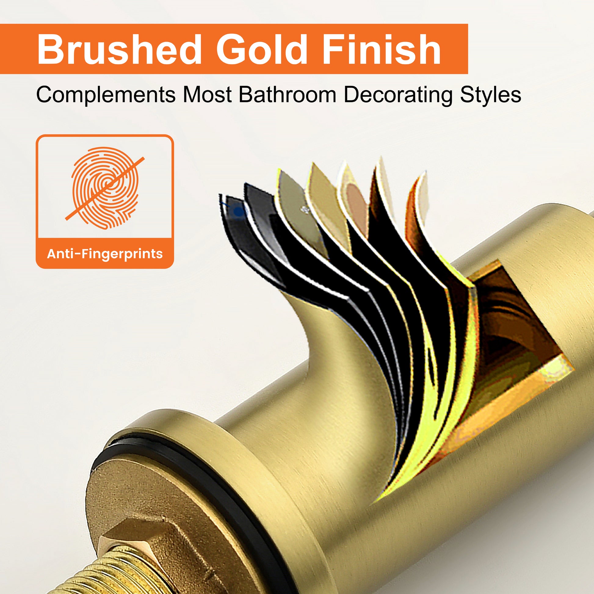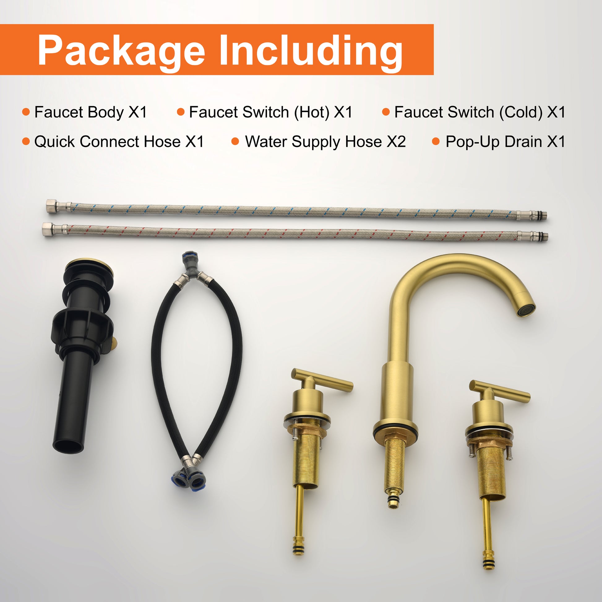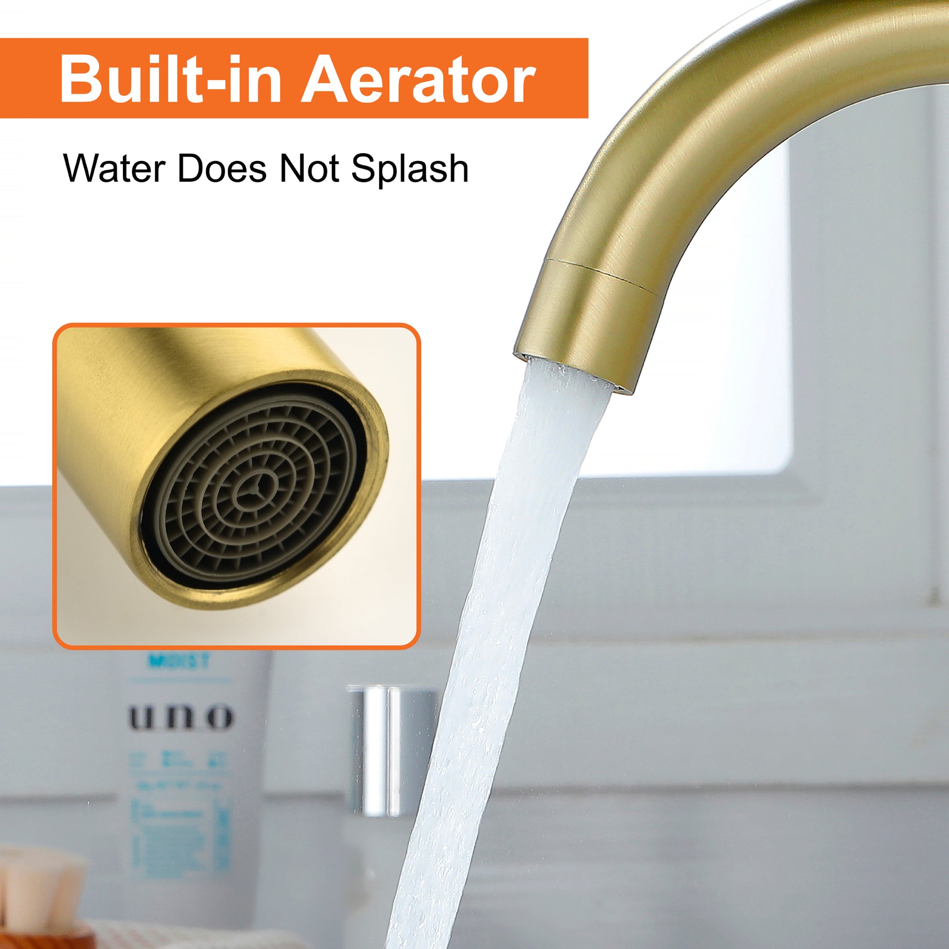 The unique brushed gold surface sealing glaze with anti-fingerprint treatment enhances the beauty and style of your bathroom. The body of the faucet rotates 360 degrees from left to right, making it convenient for various uses. A built-in aerator ensures water flows softly without splashing. The two lever handles allow easy control of water flow and temperature. Includes a cUPC quick connect hose for fast and simple DIY installation. The pop-up drain, made of stainless steel and ABS, is corrosion-resistant, easy to operate, leak-free, and suitable for basins with an overflow hole.