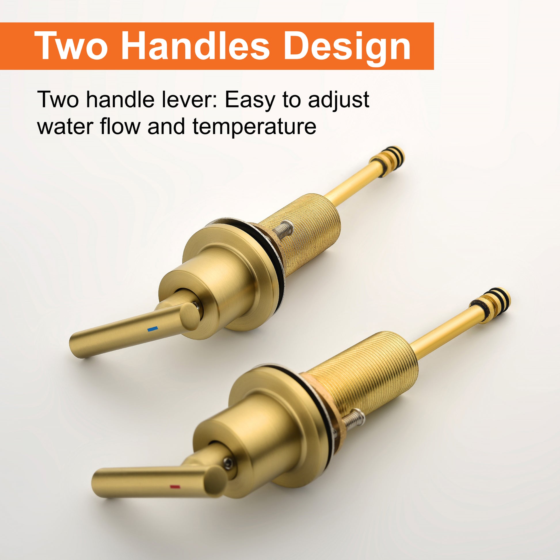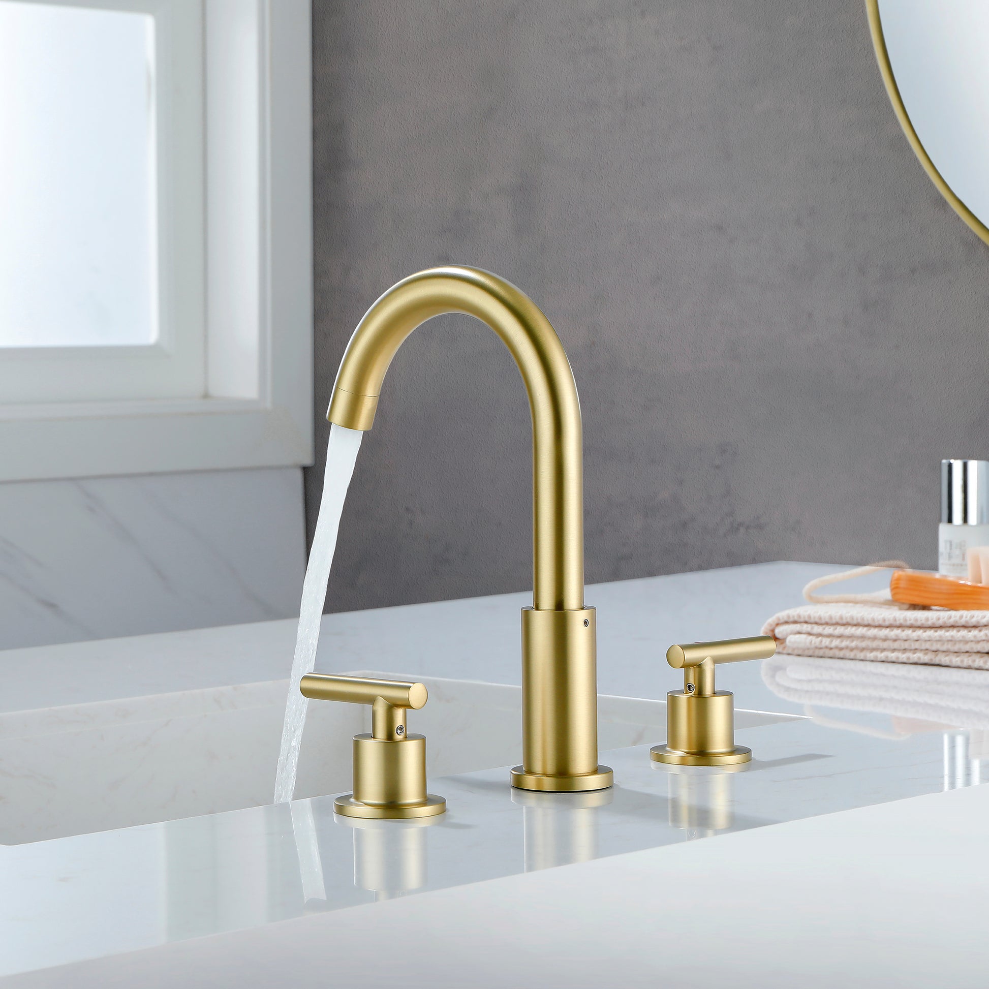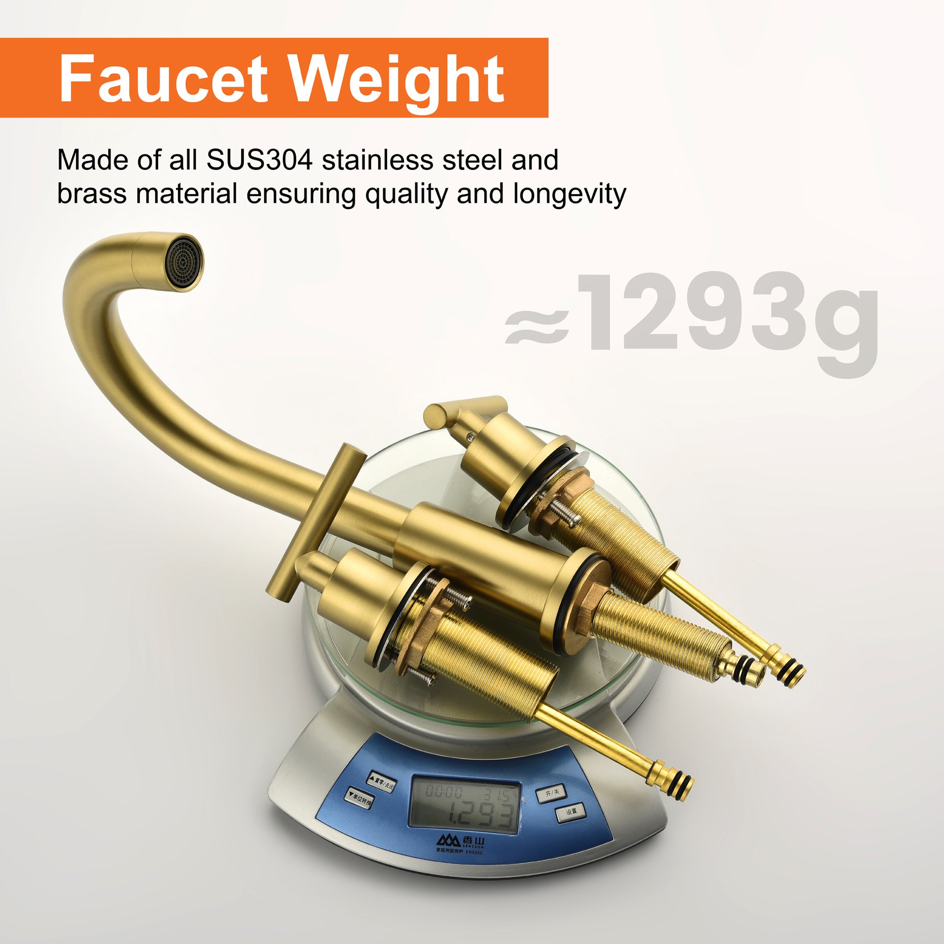 The unique brushed gold surface sealing glaze with anti-fingerprint treatment enhances the beauty and style of your bathroom. The body of the faucet rotates 360 degrees from left to right, making it convenient for various uses. A built-in aerator ensures water flows softly without splashing. The two lever handles allow easy control of water flow and temperature. Includes a cUPC quick connect hose for fast and simple DIY installation. The pop-up drain, made of stainless steel and ABS, is corrosion-resistant, easy to operate, leak-free, and suitable for basins with an overflow hole.