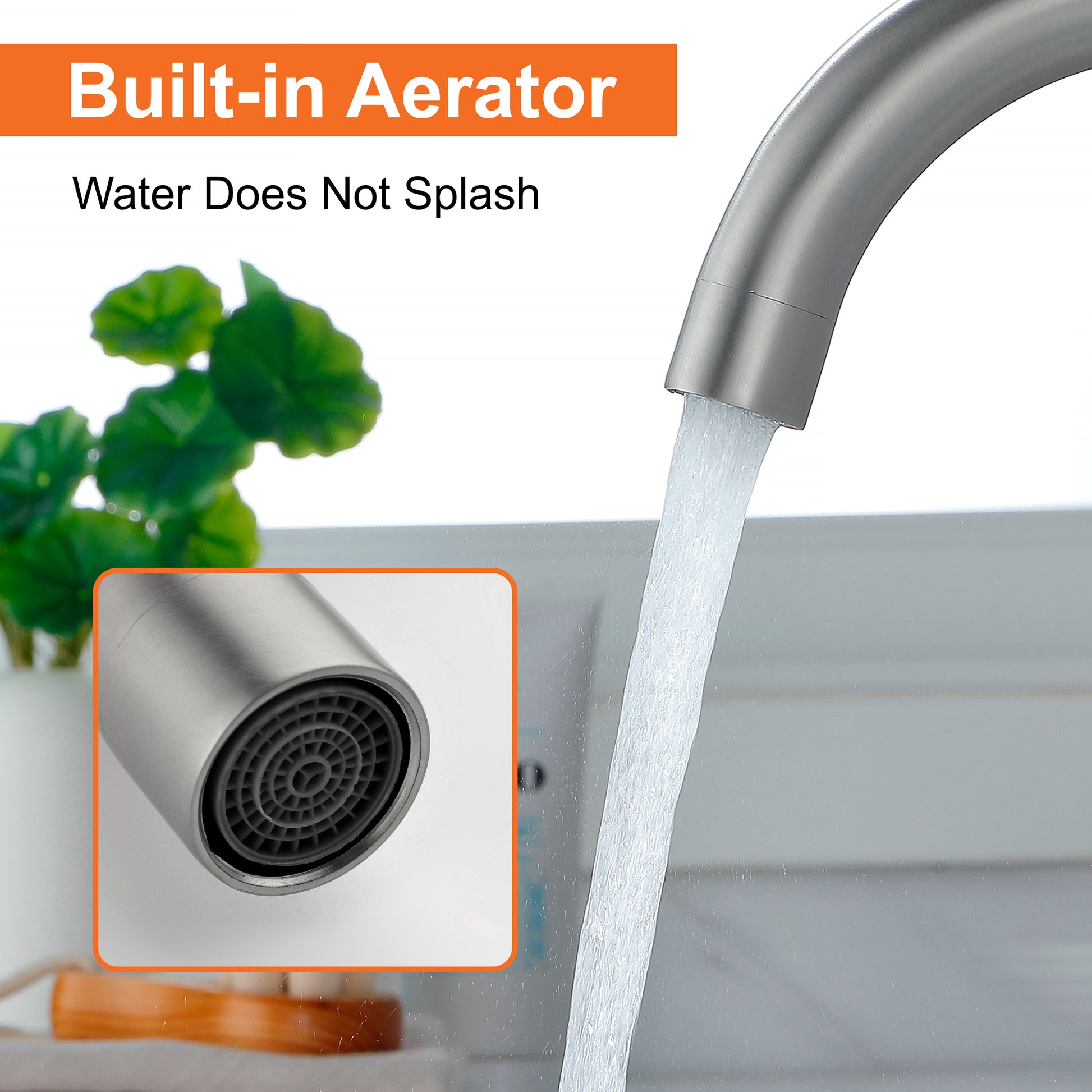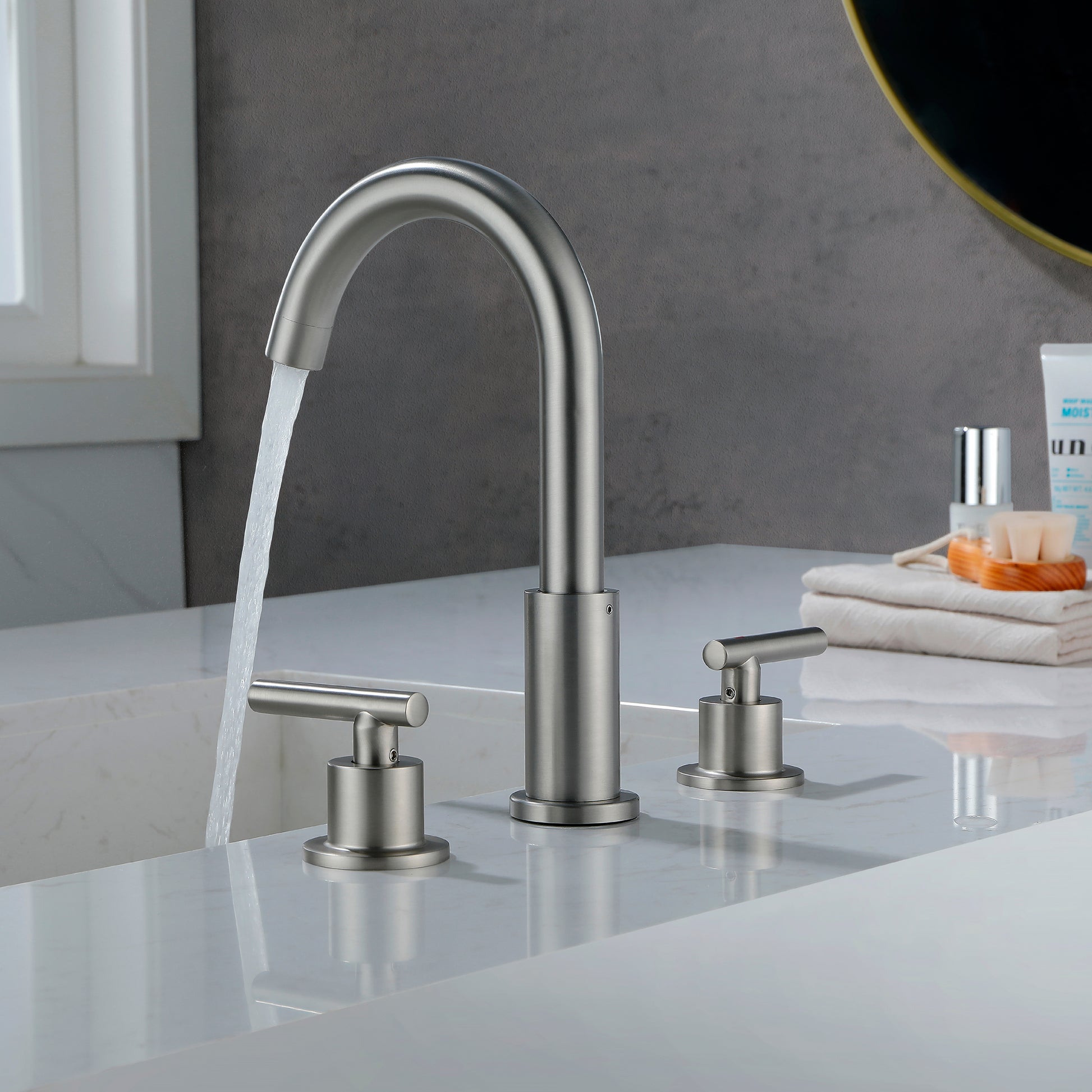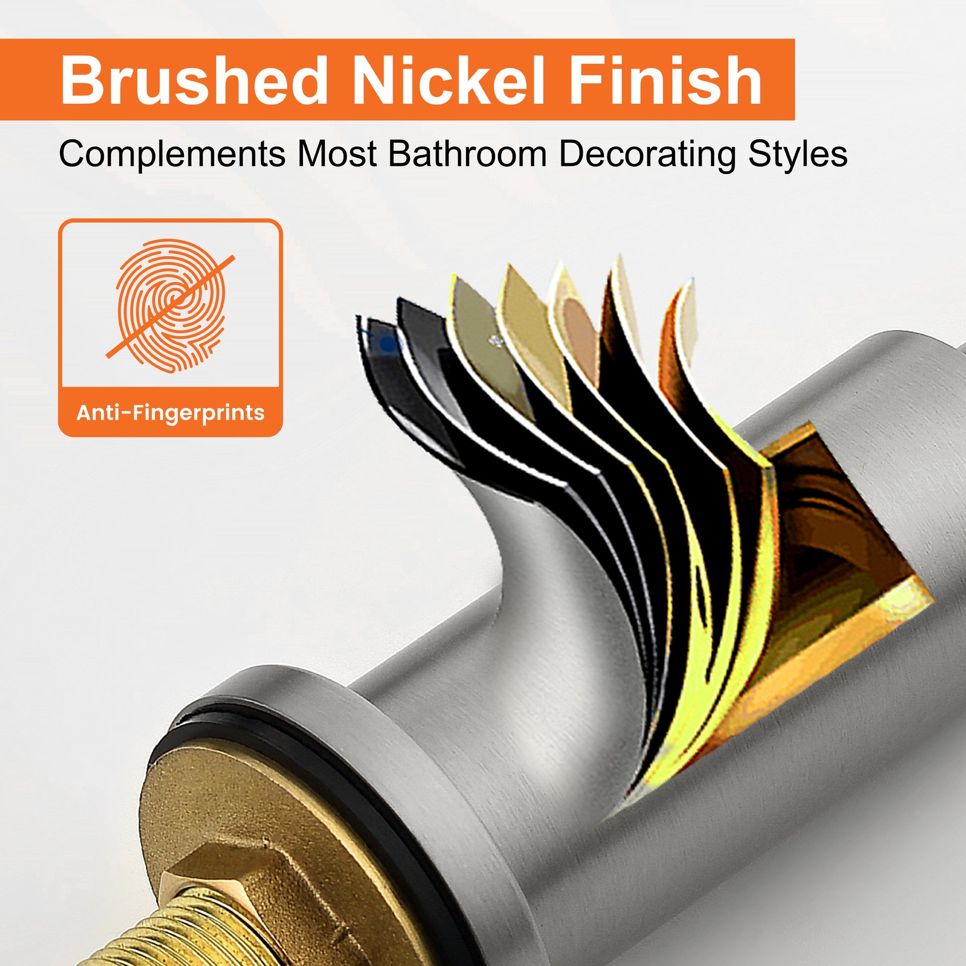 The unique brushed nickel surface sealing glaze with anti-fingerprint treatment enhances the beauty and style of your bathroom. The body of the faucet rotates 360 degrees from left to right, making it convenient for various uses. A built-in aerator ensures water flows softly without splashing. The two lever handles allow easy control of water flow and temperature. Includes a cUPC quick connect hose for fast and simple DIY installation. The pop-up drain, made of stainless steel and ABS, is corrosion-resistant, easy to operate, leak-free, and suitable for basins with an overflow hole.