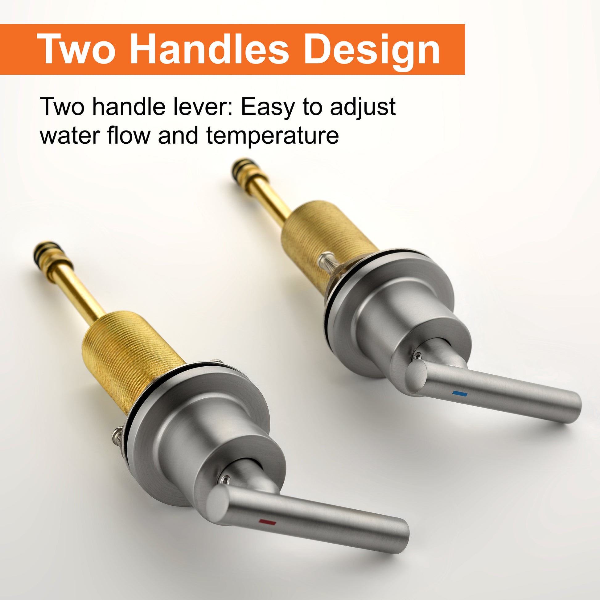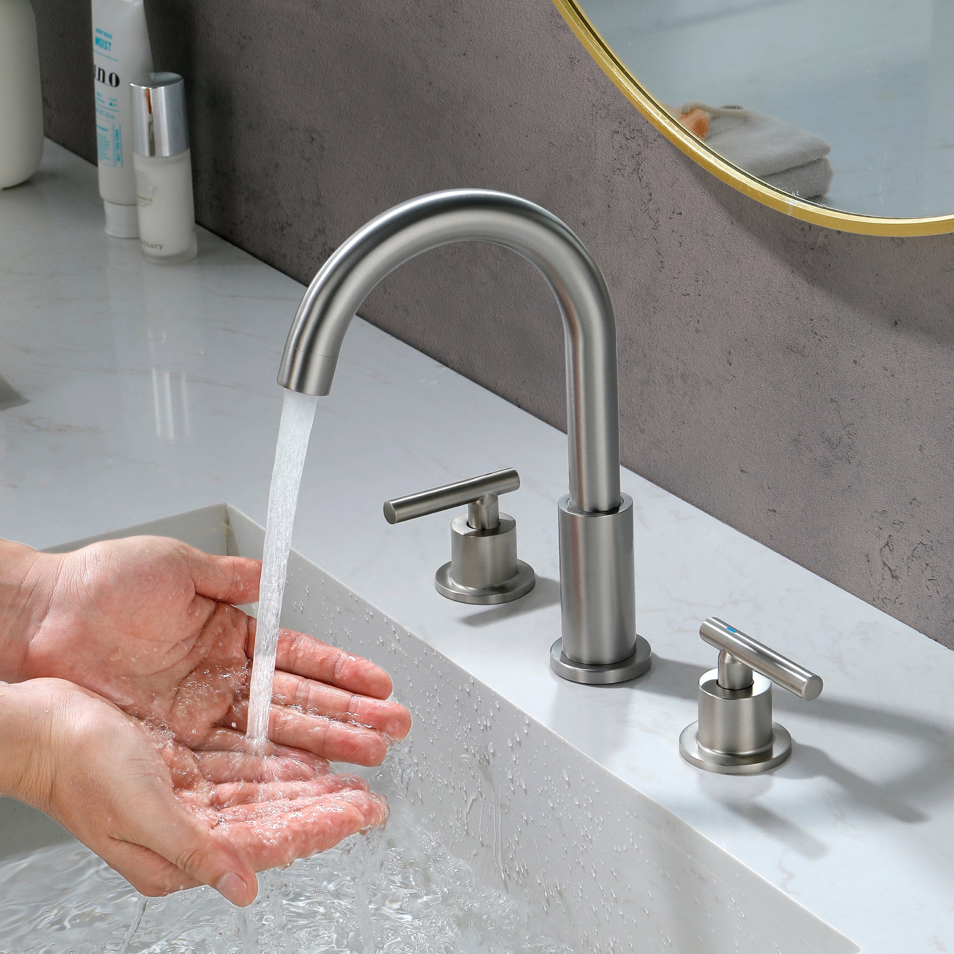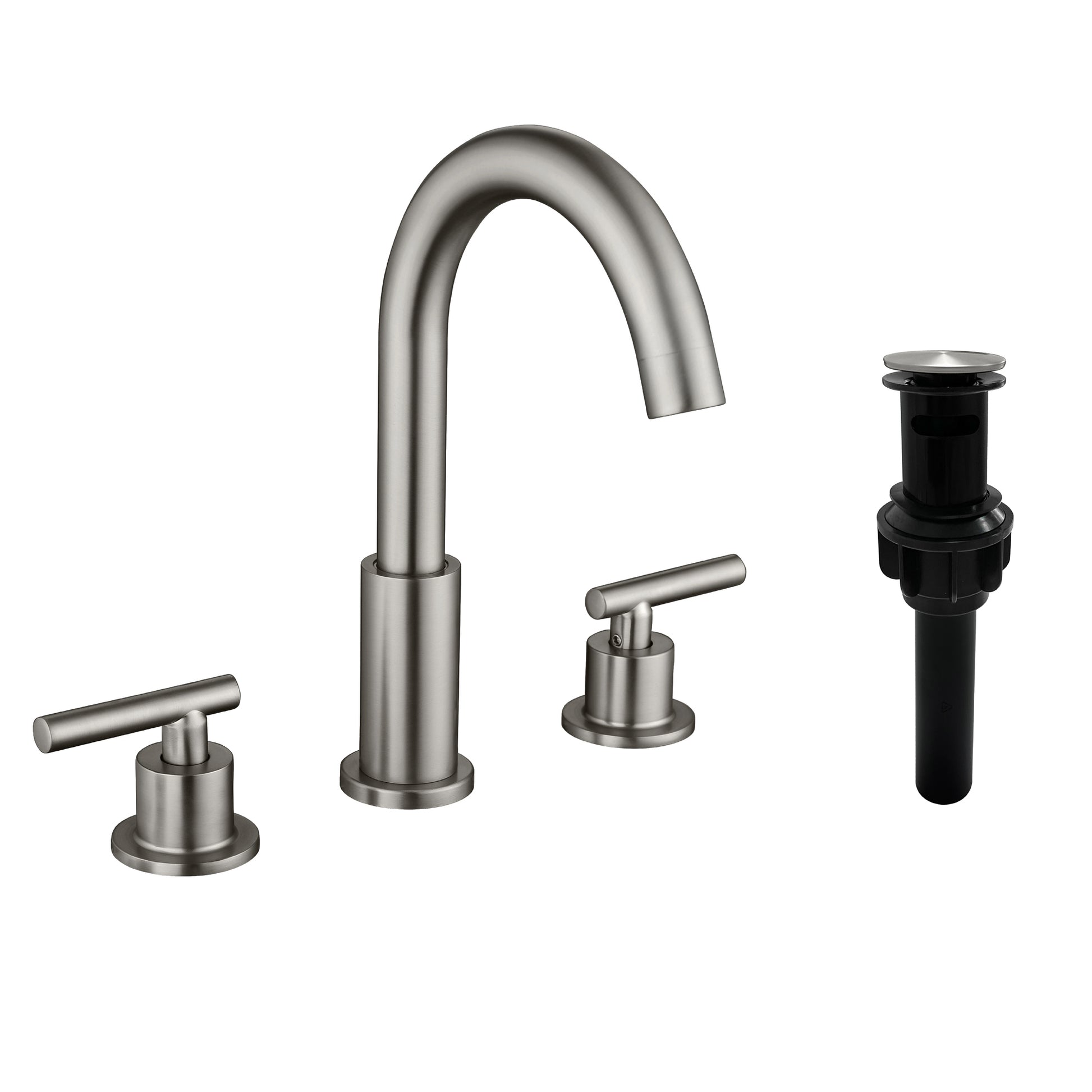 The unique brushed nickel surface sealing glaze with anti-fingerprint treatment enhances the beauty and style of your bathroom. The body of the faucet rotates 360 degrees from left to right, making it convenient for various uses. A built-in aerator ensures water flows softly without splashing. The two lever handles allow easy control of water flow and temperature. Includes a cUPC quick connect hose for fast and simple DIY installation. The pop-up drain, made of stainless steel and ABS, is corrosion-resistant, easy to operate, leak-free, and suitable for basins with an overflow hole.