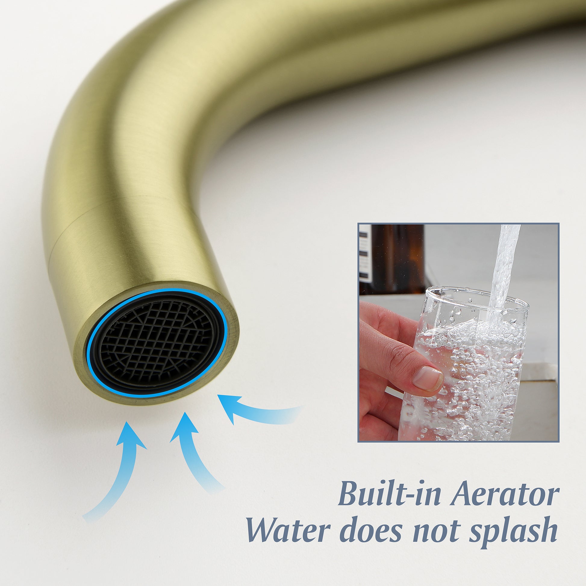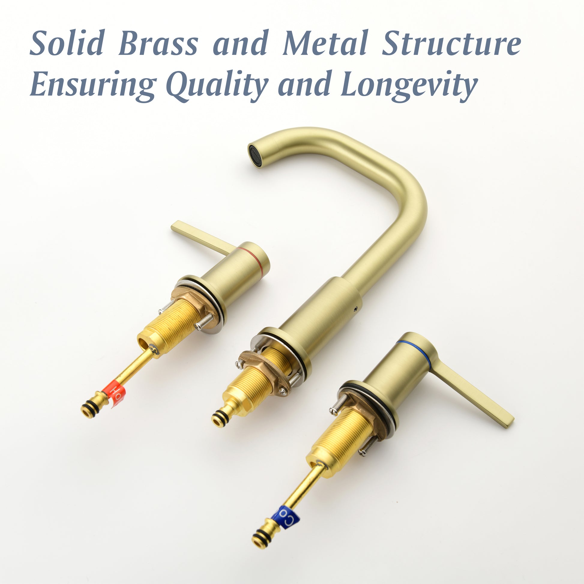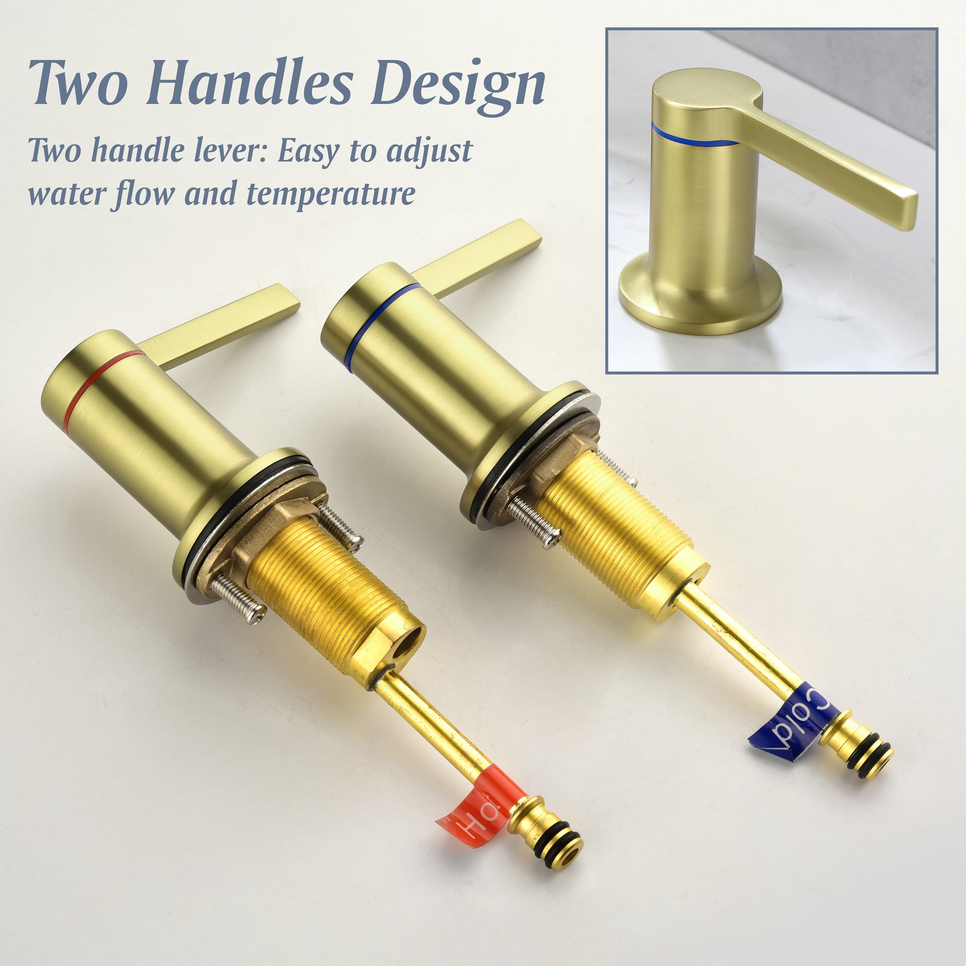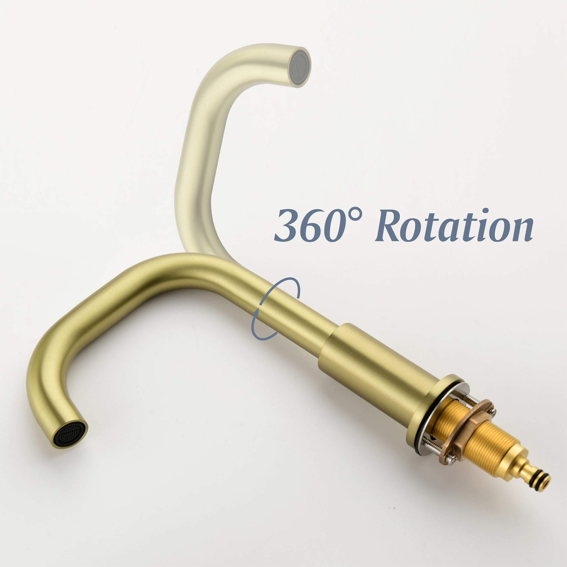 The brushed gold finish with anti-fingerprint sealing glaze adds elegance and sophistication to your bathroom. The faucet body swivels 360° for versatile use. A built-in aerator ensures soft, splash-free water flow. Dual lever handles allow easy control of water flow and temperature. Comes with a cUPC quick connect hose for fast and simple DIY installation. Designed for three-hole basin installation, with the hot water handle on the left and the cold water handle on the right.