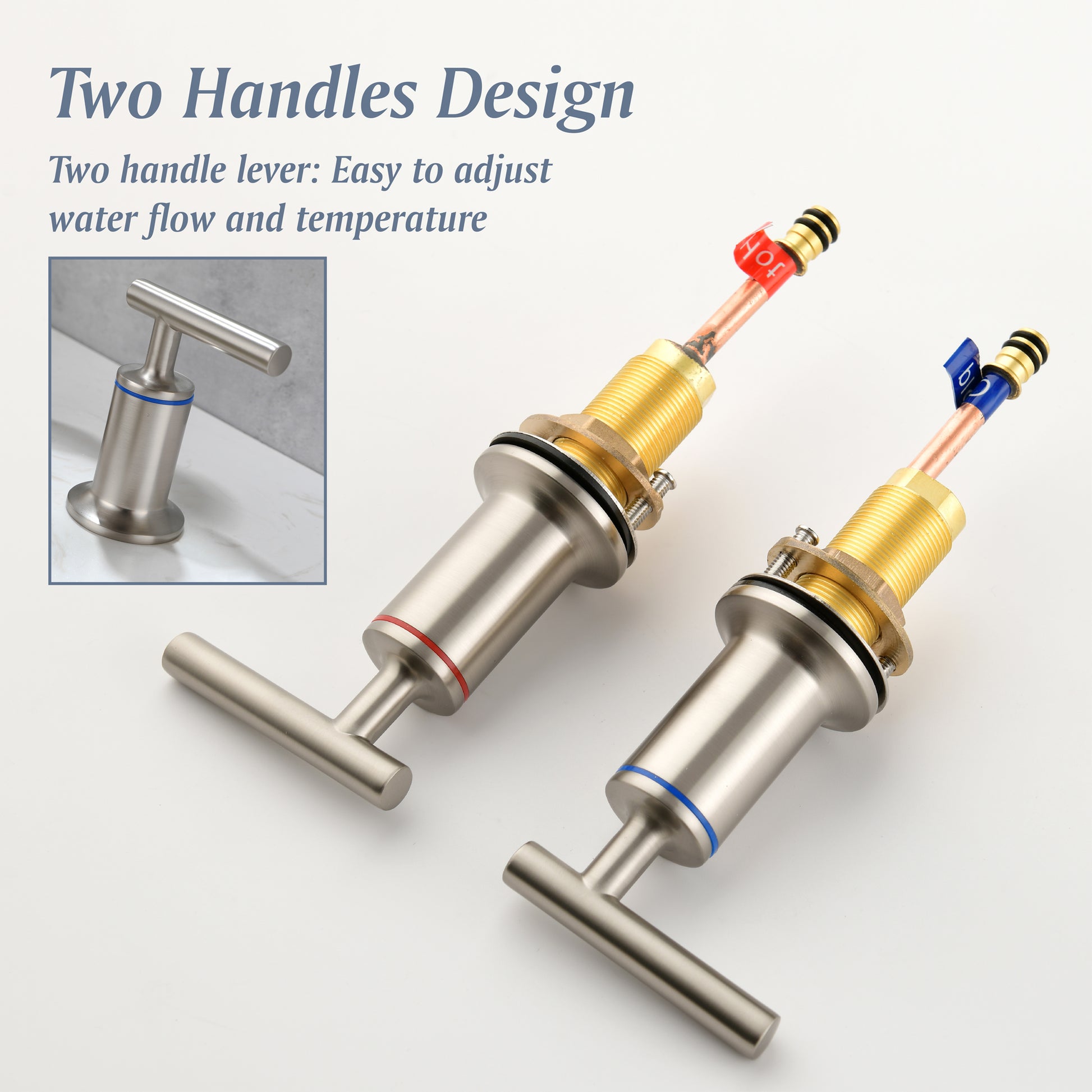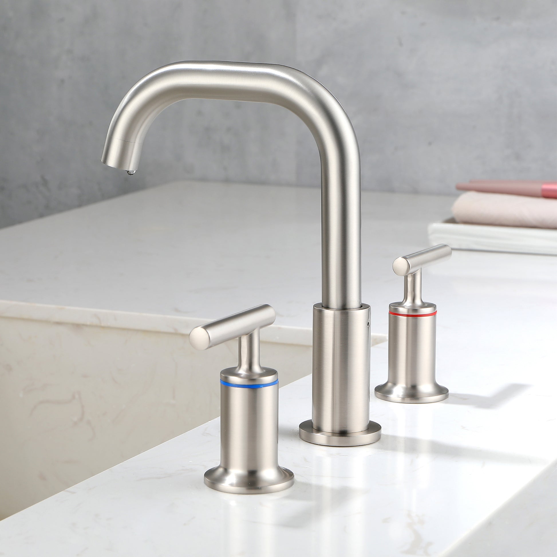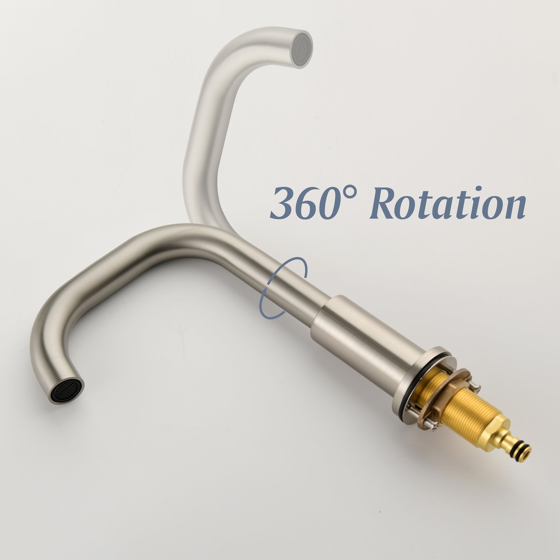 The brushed nickel surface with anti-fingerprint sealing glaze adds a modern and stylish look to your bathroom. The faucet body rotates 360° from left to right, making it versatile for different uses. A built-in aerator provides a soft, splash-free water flow. Dual lever handles allow easy control of both water flow and temperature. Includes a cUPC quick connect hose for fast and convenient DIY installation. Designed for three-hole basin installation, with the hot water handle on the left and the cold water handle on the right.