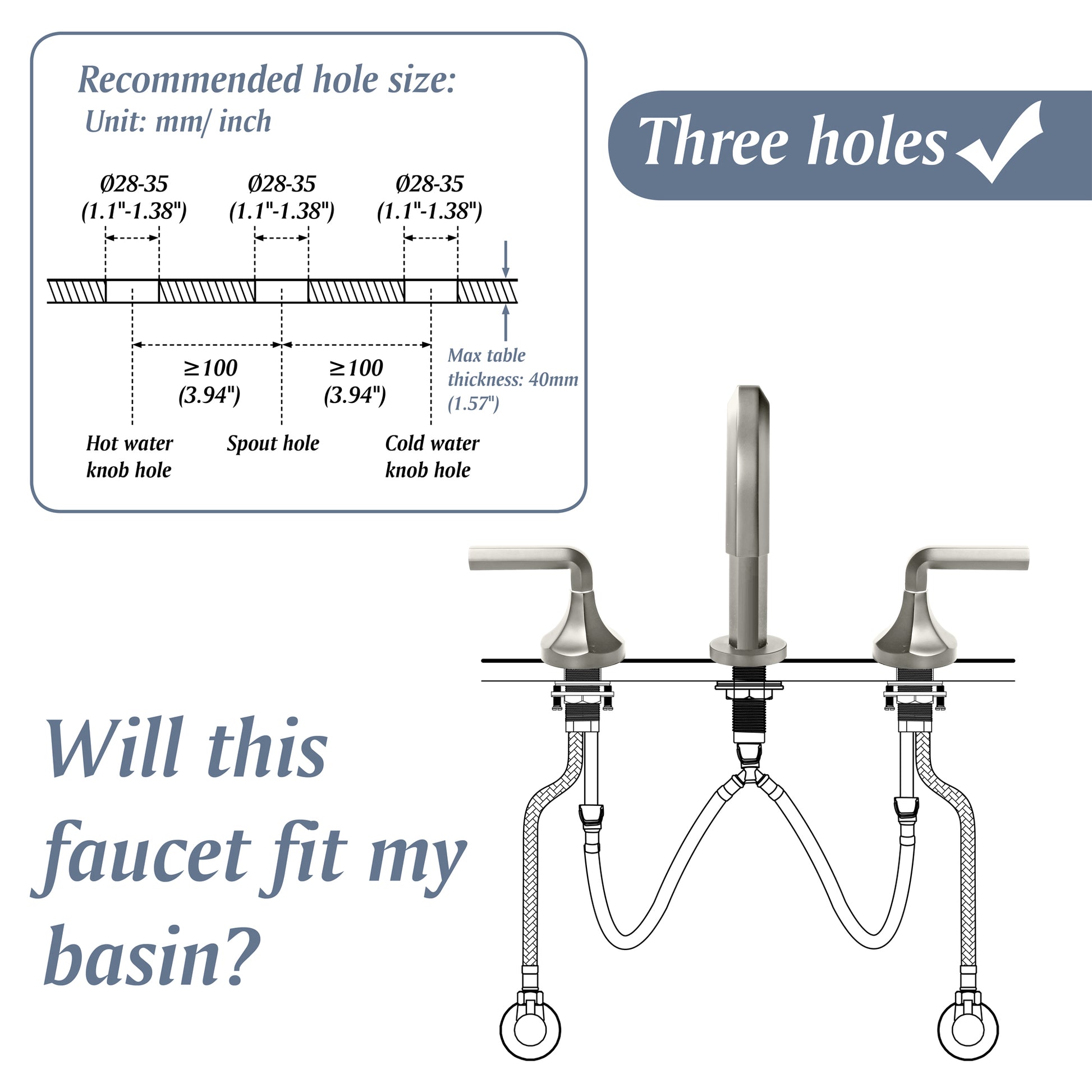 Suitable for three hole basin installation with hot water handle on the left and cold water handle on the right