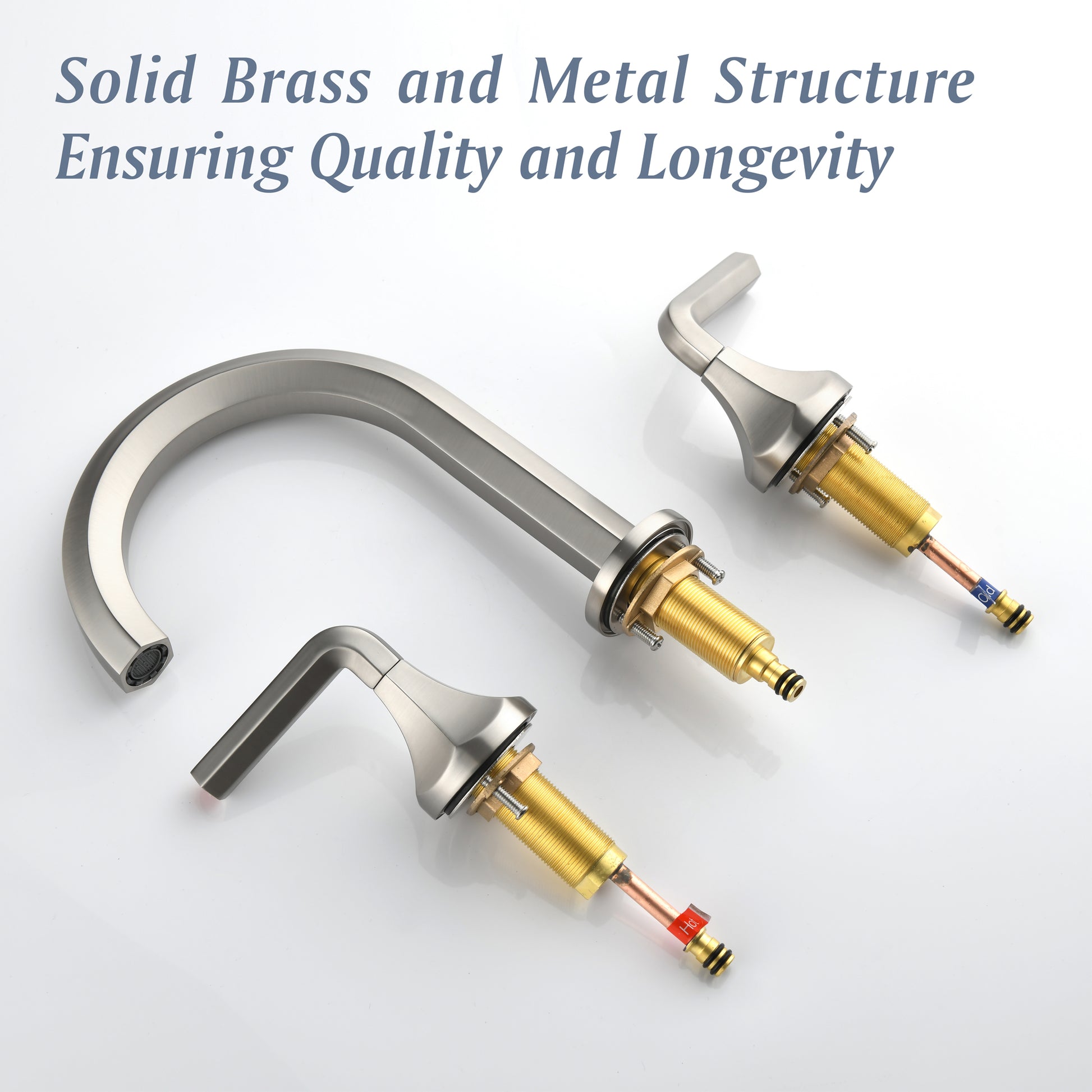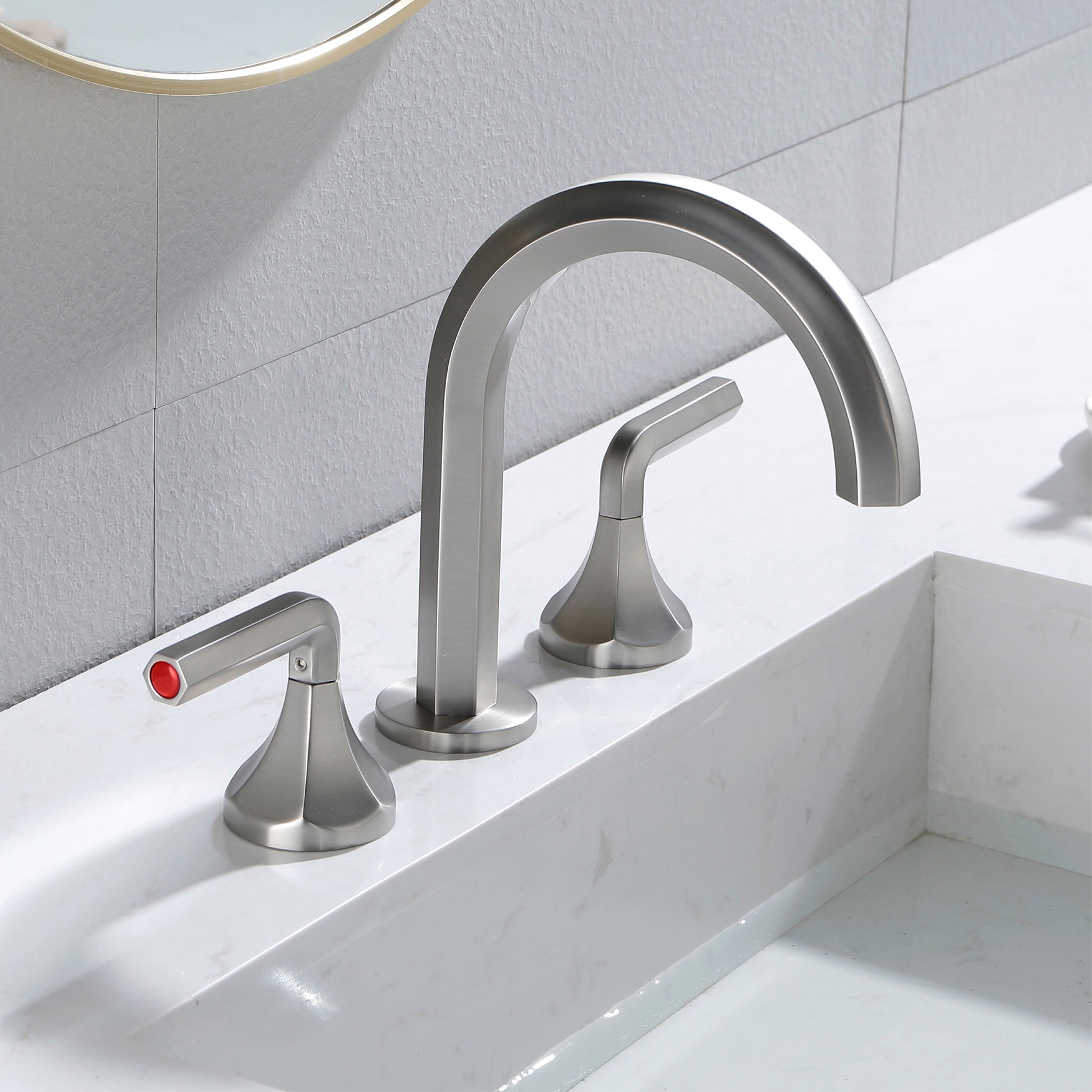The unique brushed nickel finish with sealing glaze and anti-fingerprint treatment enhances the elegance and style of your bathroom. The hexagonal faucet design adds a modern, artistic touch. A built-in aerator ensures soft, splash-free water flow. Dual lever handles provide easy control of both water flow and temperature. Includes a cUPC quick connect hose for fast and convenient DIY installation. Designed for three-hole basin installation, with the hot water handle on the left and the cold water handle on the right.